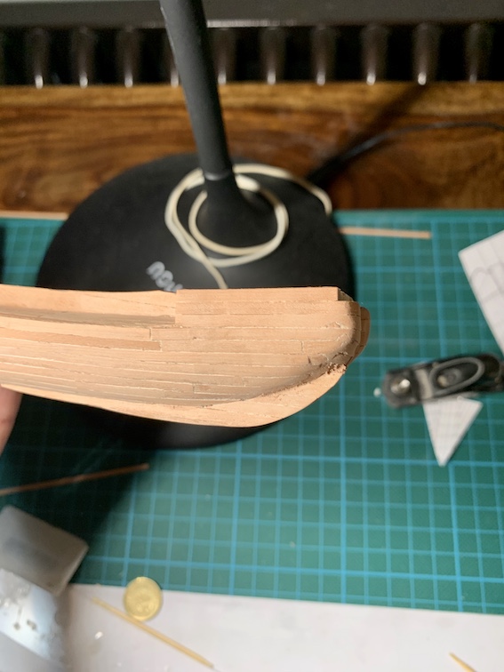 Wiem także, że to niezgodne ze sztuką ale kil zamierzam wkleić w gotowe poszycie. Jedynie na stosunkowo najprostszej części, czyli dnie jestem w stanie zrobić to właściwie czyli kil, z wyciętym rabbetem i wpuszczenie w niego planej. Na rufie i dziobie chwilowo mnie to przerasta. To znaczy efekt finalny byłby gorszy niż gdybym nie poszedł na świadome uproszczenie.