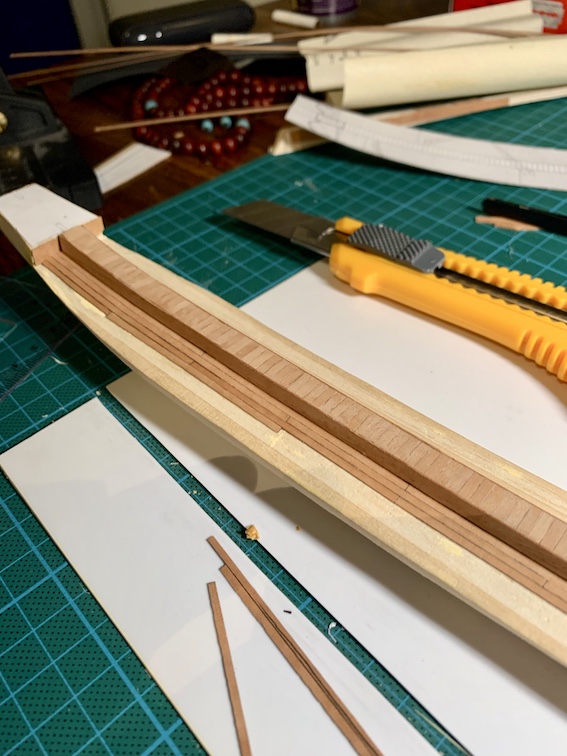 Wiem także, że to niezgodne ze sztuką ale kil zamierzam wkleić w gotowe poszycie. Jedynie na stosunkowo najprostszej części, czyli dnie jestem w stanie zrobić to właściwie czyli kil, z wyciętym rabbetem i wpuszczenie w niego planej. Na rufie i dziobie chwilowo mnie to przerasta. To znaczy efekt finalny byłby gorszy niż gdybym nie poszedł na świadome uproszczenie.