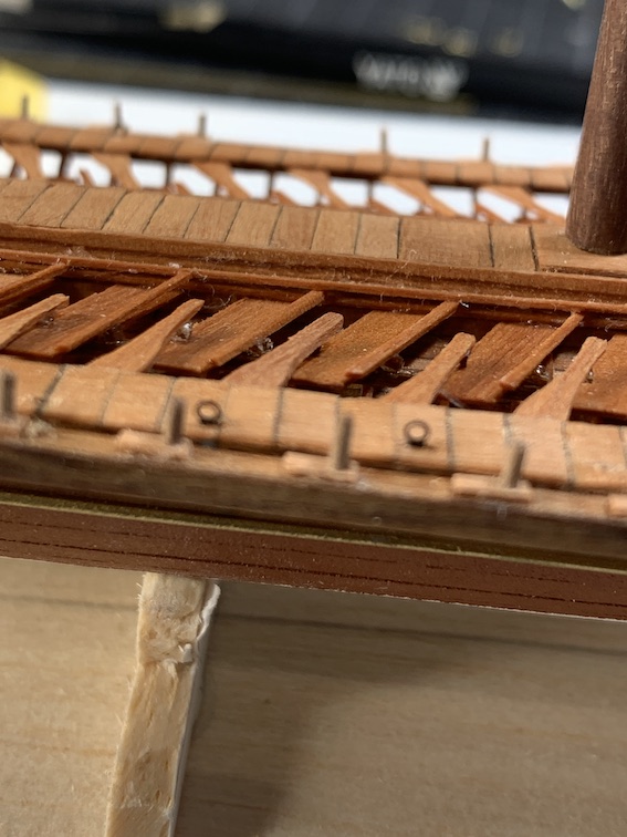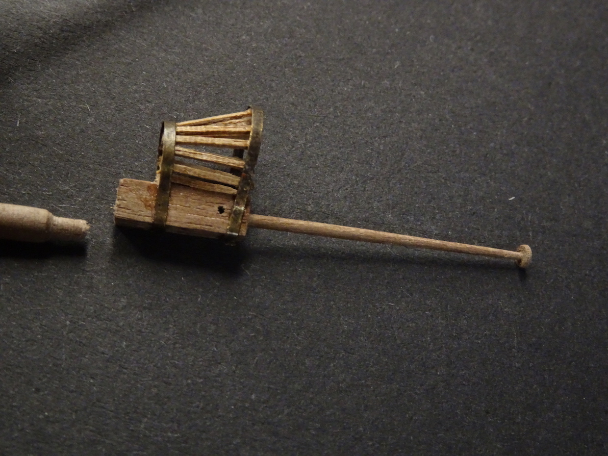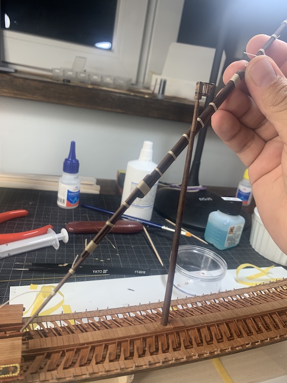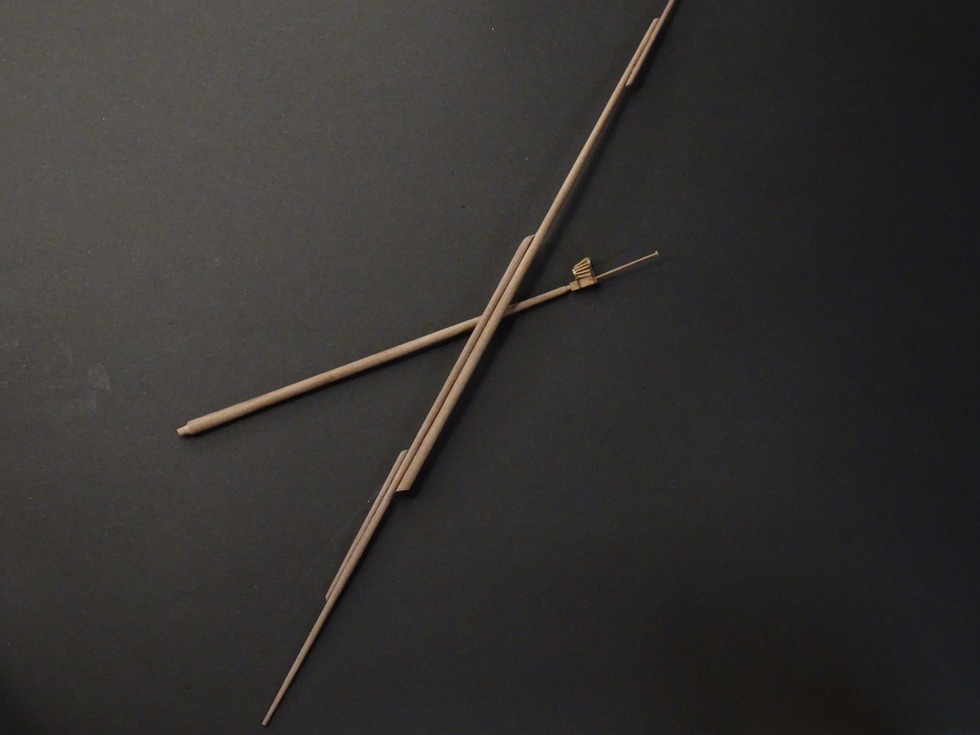 Z masztami natoczyłem się nieco poszczególnych elementów ale to w sumie przyjemna fucha. Ostatecznie będą składane z olinowaniem, przedtem jeszcze pokost i wzmocnienia konstrukcji reji.