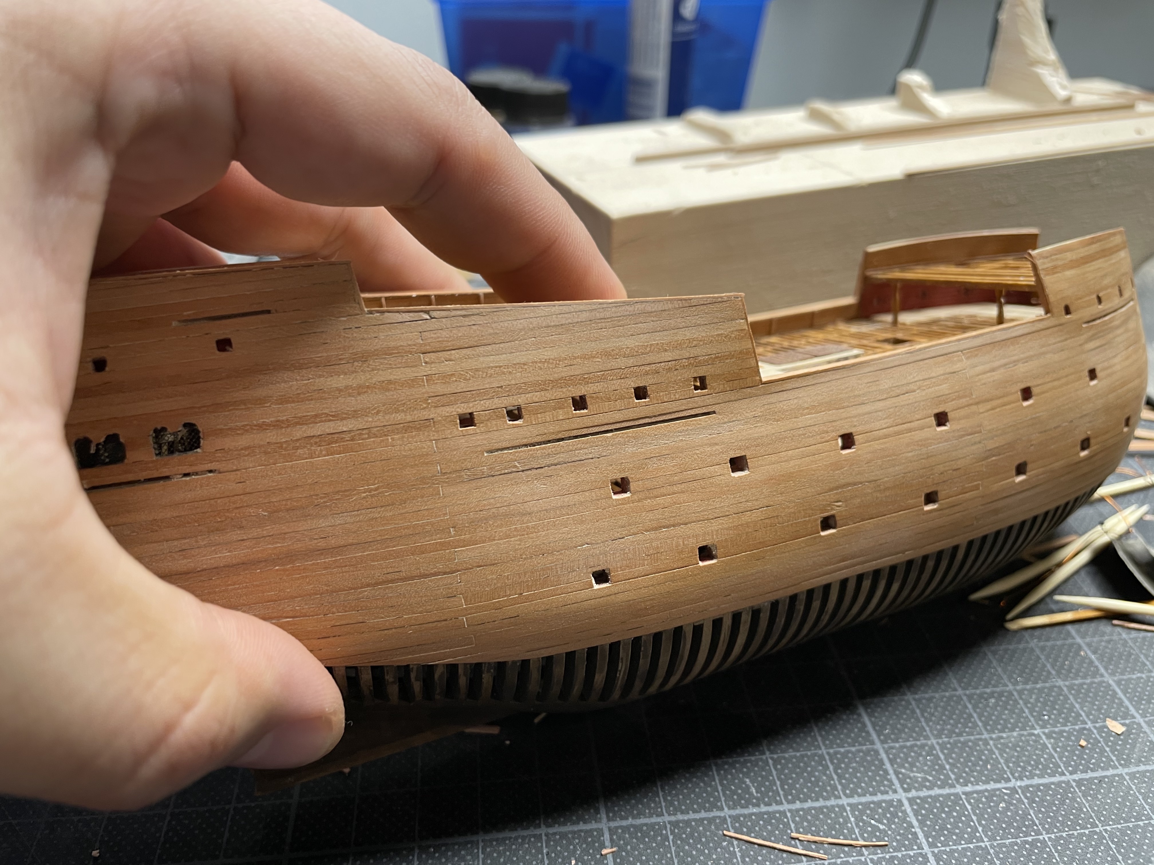 Do tego pozostaje dopracowanie okien rufowych, przygotowanie rufy pod ster.