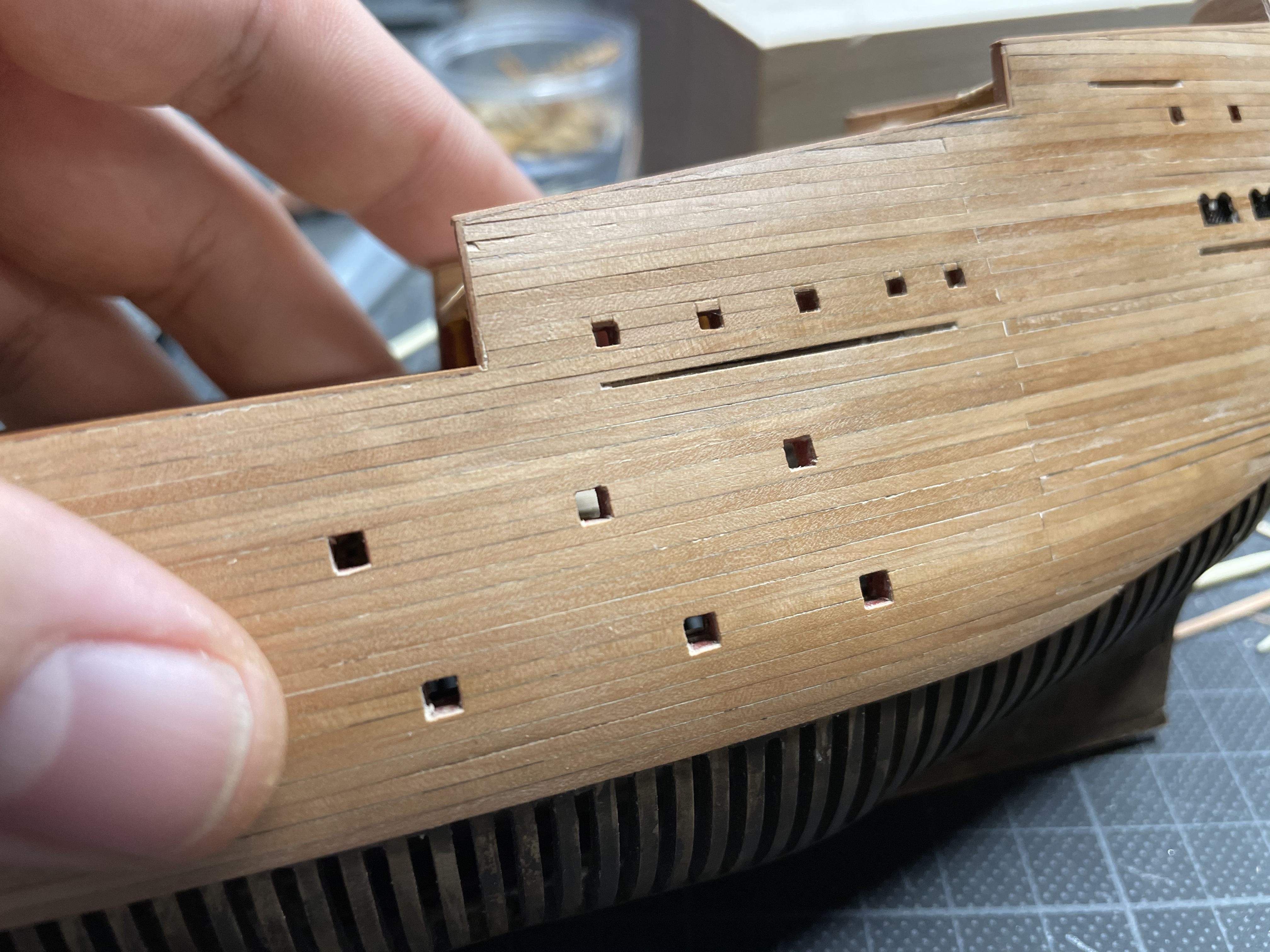 Wolno prace postępują. Permanentny brak czasu. Zabrałem się mimo różnych wątpliwości za plankowanie. Całość będzie rzecz jasna przeszlifowana dopiero. Wcięcia przygotowane pod ławy wantowe i zawnętrzną galerię rufową.