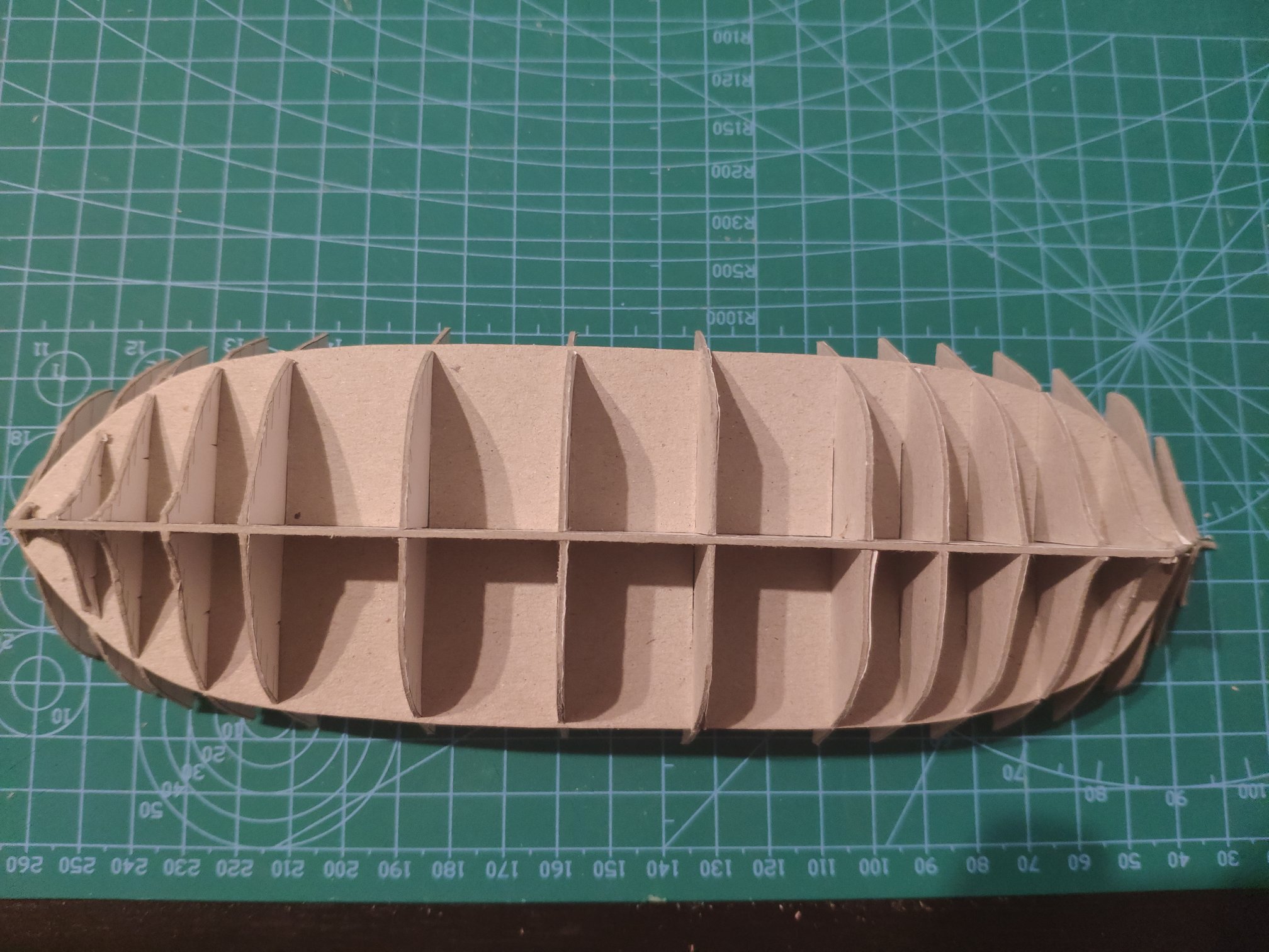 Jeśli zamierzasz taki tekturowy szkielet poszyć bezpośrednio fornirem (zakładam że standardowo ok 0,6mm) to myślę, że będzie to trudne i ryzykowne i może się zapadać, ponadto ciężko spasować do siebie paski forniru, ja bym się tego nie podjął. Proponowałbym wypełnić przestrzenie pomiędzy wręgami. Częstą pokazywaną metodą jest wypełnienie pianką montażową niskoprężną lub wklejeniem grubszej tektury pomiędzy wręgi lub kawałków listewek. Przy takim przygotowaniu na pewno unikniesz wielu problemów przy poszywaniu i uzyskasz dużo lepszą jakość. Kawałki listewek stosowałem w swojej Papudze a karton/drewno w Smoku którego akurat też poszywałem fornirem.