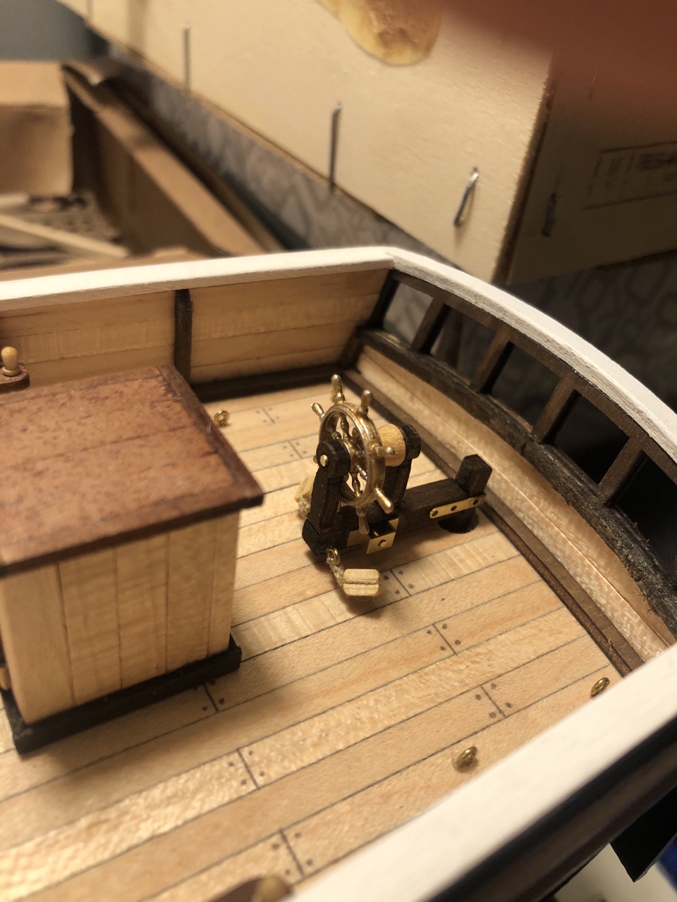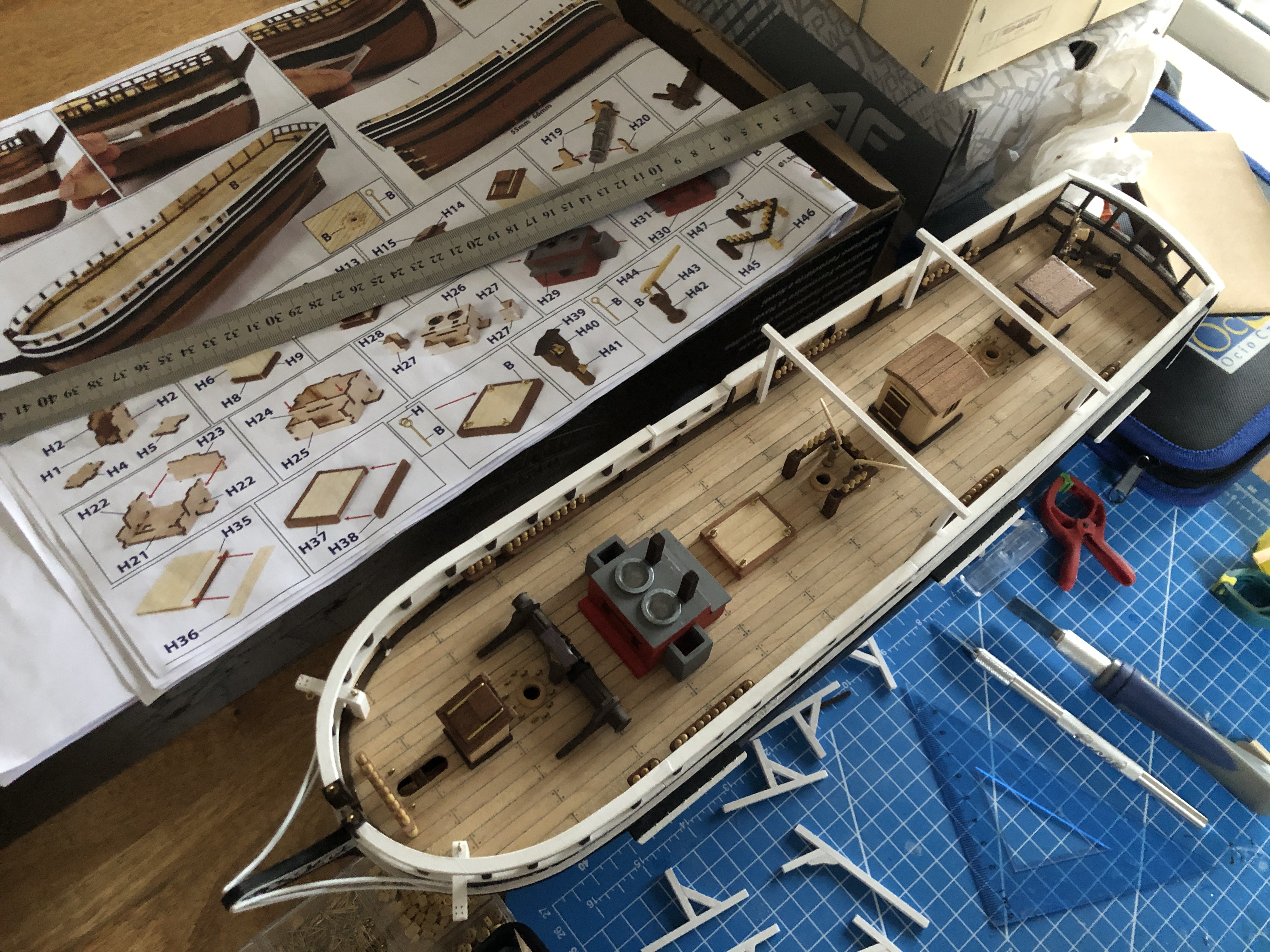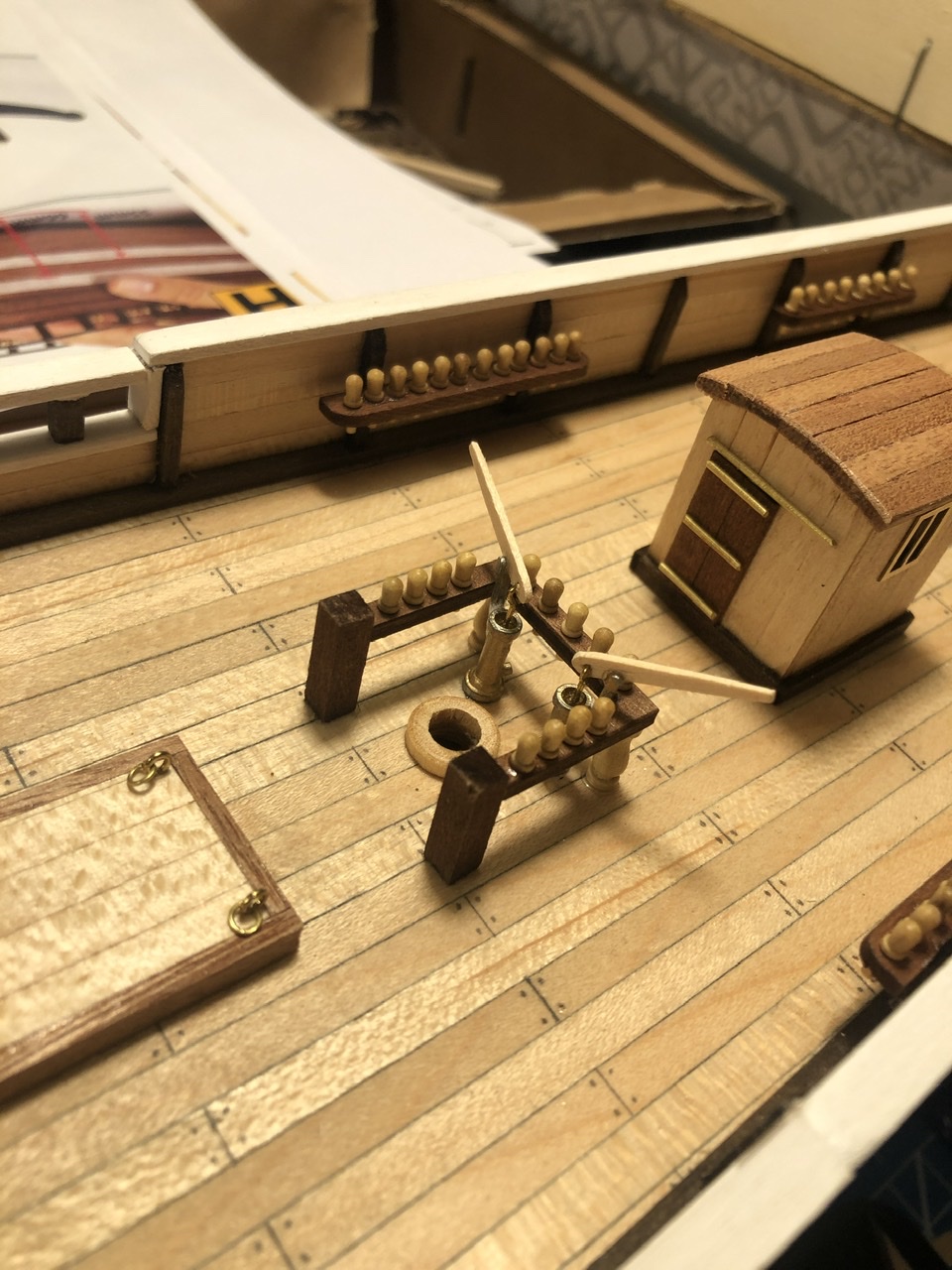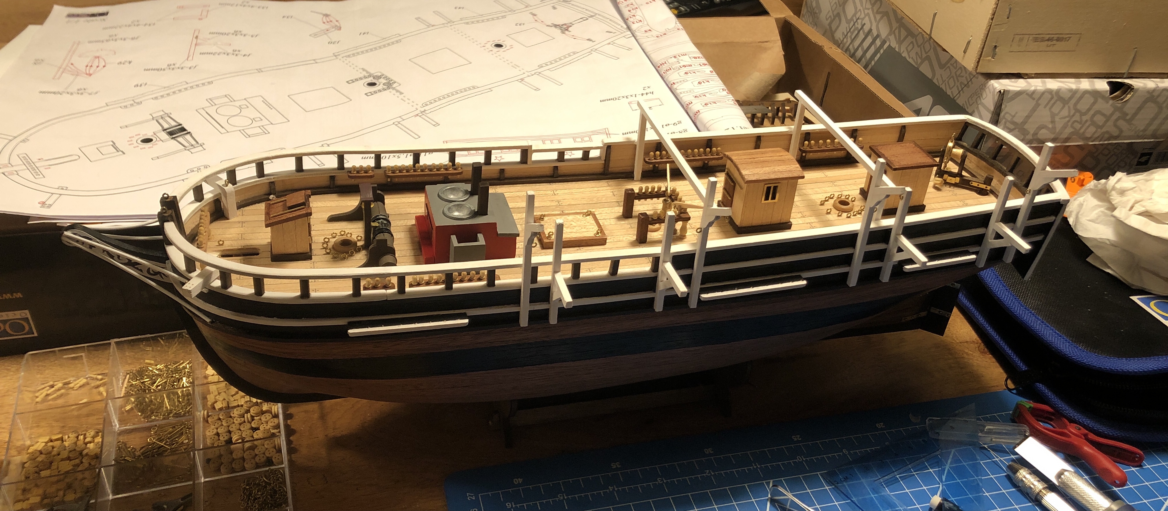 No i przykleiłem kilka kolejnych wykonanych elementów do pokładu. Następny krok to koło sterowe i 4 szalupy - tego elementu się trochę obawiam, czy uda mi się ładnie wykonać.