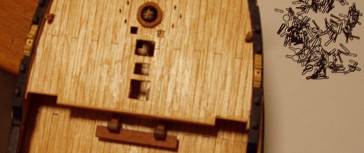 Po radach kolegów czas złożyć sprawozdanie jak to wyszło w praktyce. Jeszcze dla Tomka małe wyjaśnienie że nie miałem zamiaru przesuwać luku armatniego a jedynie samą armatę bo a modelu jest 9 stanowisk armatnich na każdej burcie a samych armat jest 8. Pierwszy luk od dziobu ma zamkniętą furtę czy klapę i myślałem o ewentualnym wypełnieniu go armatą. Wszystko jednak poszło moim zdanie dobrze i można było budować dalej a ewentualne uwagi przyjmuję na klatę. Poczerniłem okucia z blaszek fototrawionych by zamontować ławy wantowe. Te blaszki są czymś pokryte i kiepsko wychodziło czernienie. Potraktowałem je rozpuszczalnikiem nitro, detergentem i jeszcze benzyną ekstrakcyjną ale ostateczny efekt przyniosło dopiero oczyszczanie pędzlem każdego elementu a jest ich koło 200 . Następny etap to przygotowanie artylerii, lecz to dopiero przede mną. Pozdrawiam Janek.