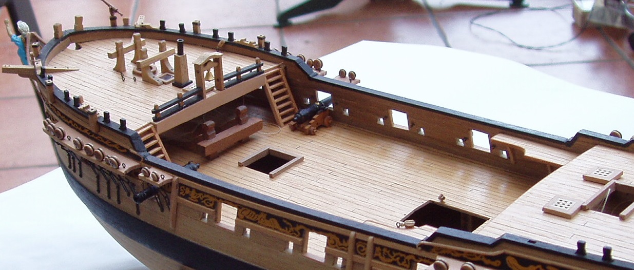 Prace trwają. Położyłem deski na pokładach i wewnętrznej stronie burt, zamocowałem oczka do mocowania lawet i położyłem pierwszą farbę. Przez oczka do tylnego mocowania lawet przykrytych już górnym pokładem przewlokłem nitki które posłużą później do wciągnięcia armat ze śródokręcia. Nie wiem jaka jest zasada przyjęta w modelarstwie czy lawety się wkleja czy pozostają mocowane tylko linami. Pozdrawiam Janek