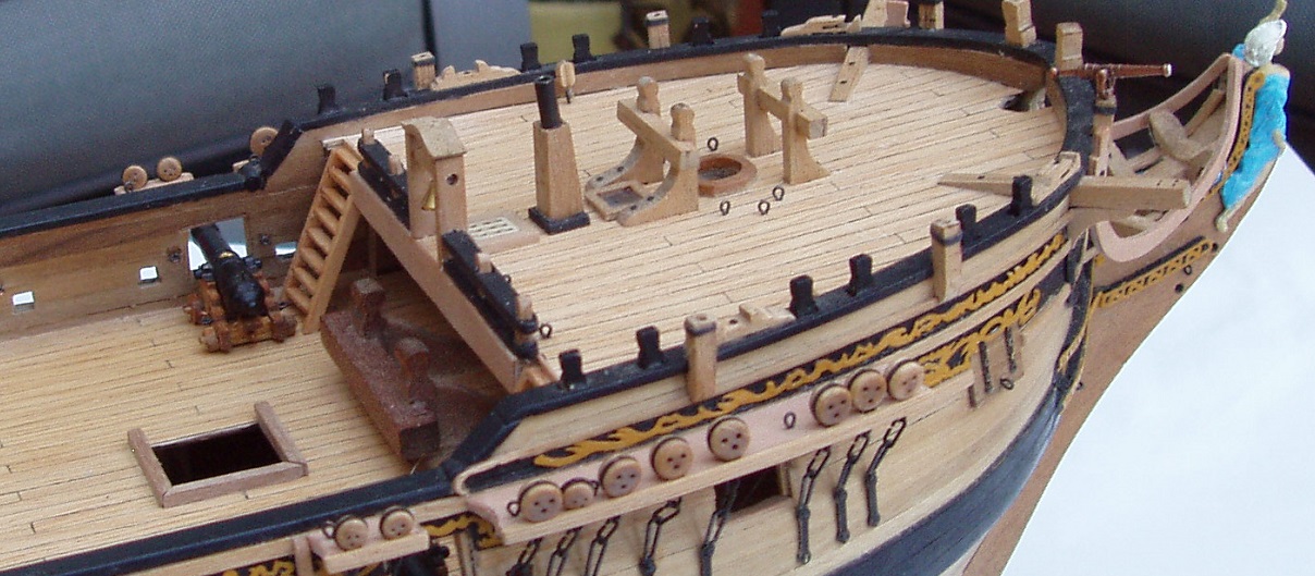 Nie znam planow HMS Fly z Amati, ale tak, 'na oko', wydaje mi sie, ze Twe schody sa za bardzo "rozciagniete". Typowo takie schody/drabiny byly ustawiane bardziej pionowo. Zrob tak na Twym modelu i zobacz czy masz dosc miejsca na dzialo tuz za nimi?