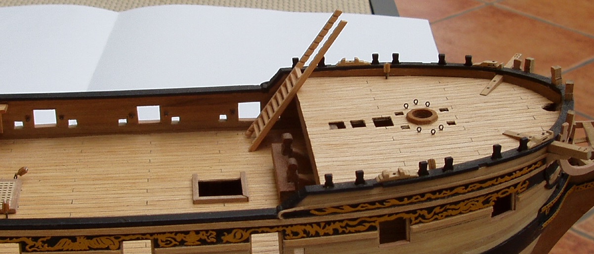 Nie znam planow HMS Fly z Amati, ale tak, 'na oko', wydaje mi sie, ze Twe schody sa za bardzo "rozciagniete". Typowo takie schody/drabiny byly ustawiane bardziej pionowo. Zrob tak na Twym modelu i zobacz czy masz dosc miejsca na dzialo tuz za nimi?