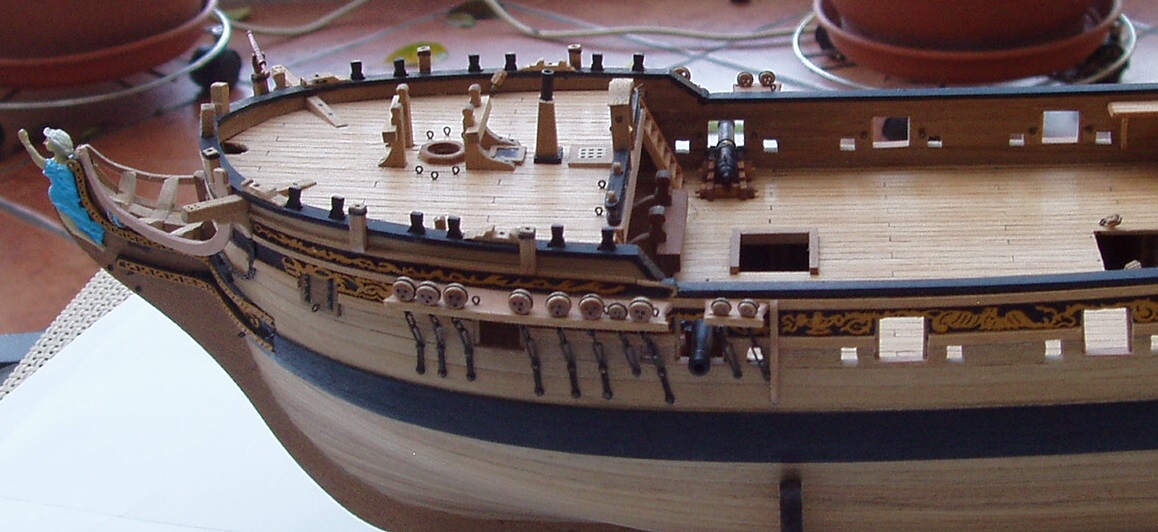 Prace trwają. Położyłem deski na pokładach i wewnętrznej stronie burt, zamocowałem oczka do mocowania lawet i położyłem pierwszą farbę. Przez oczka do tylnego mocowania lawet przykrytych już górnym pokładem przewlokłem nitki które posłużą później do wciągnięcia armat ze śródokręcia. Nie wiem jaka jest zasada przyjęta w modelarstwie czy lawety się wkleja czy pozostają mocowane tylko linami. Pozdrawiam Janek