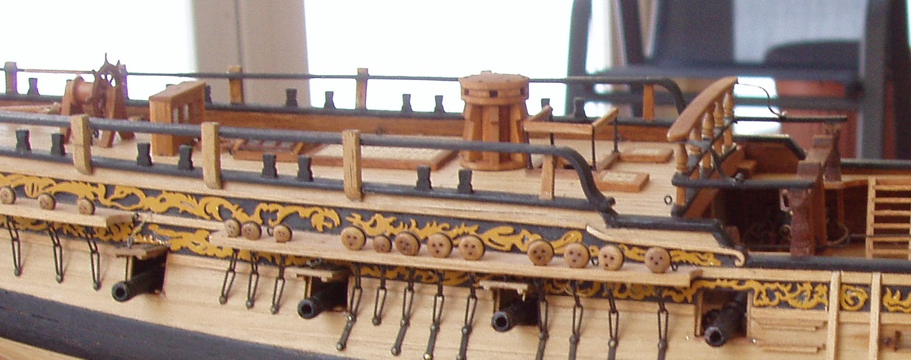Kadłub praktycznie zakończony bo do zamontowania pozostały słupki od trapu i drobnica która przeszkadzałaby przy montażu takielunki. Armaty otaklowane, mechanizm koła sterowego też i można iść wyżej. Na plus dla Amati należy zaliczyć że armaty mają emblematy Georga III i kurki zapalników kapiszonowych. Parę fotek. Pozdrawiam Janek