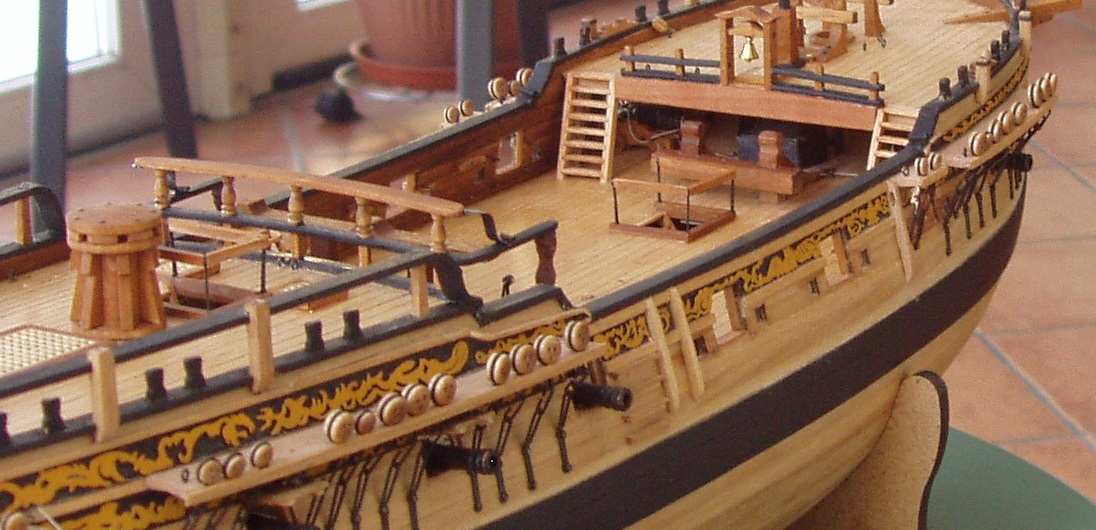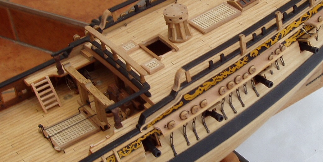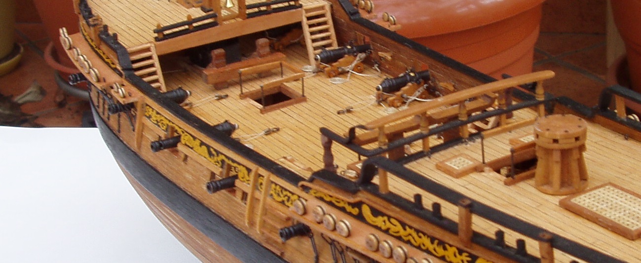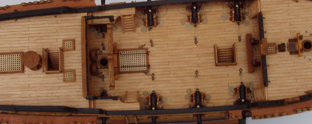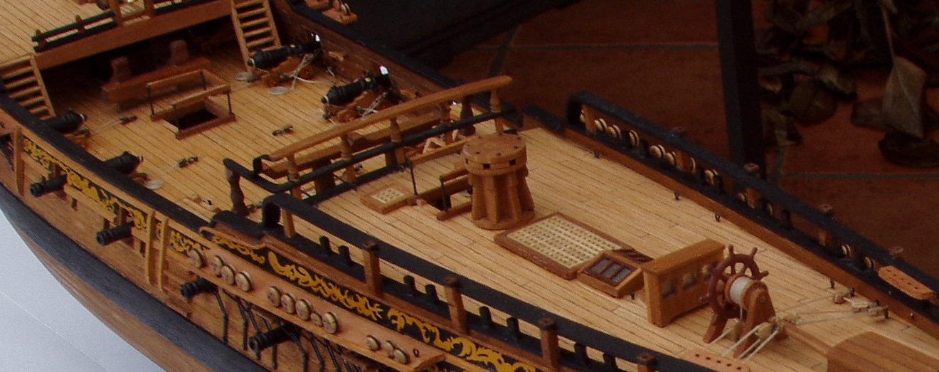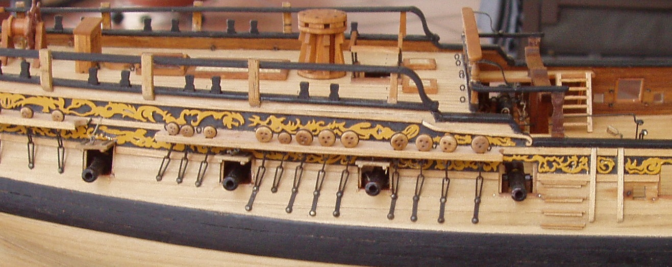 Trochę Piotrek szkoda że nie kupiłeś Fly, byłaby niezła ściągawka i wzór do naśladowania. Mnie wpadła w oko smukła sylwetka i pajęczyna olinowania a ponadto zachowały się plany dostępne w Narodowym Muzeum Morskim w Anglii obszerna historia łącznie z nazwiskami kapitanów i zapisami w dziennikach pokładowych. Fakt ten jak również sporo zdjęć i relacji w necie przesądziły o wyborze właśnie tej jednostki. Istotne też jest to że jest to mały żaglowiec bo na liniowcu łatwo polec. Obszerność źródeł pozwala niwelować uproszczenia producenta zestawów a nawet korygować jego błędu. W dzisiejszej relacji są dwa takie przypadki. Pierwszy to balustrady okalające zejścia na niższe pokłady, w zestawie są one z linki rozpiętej na 4 słupkach a rzeczywiście były z drewna. Drugie uproszczenie to wyprostowanie poręczy przy zejściu na śródokręcie a faktycznie przypominało literę s. Co do postępów w budowie to wstawiłem 10 armat. Pomysł z wciąganie ich przy pomocy linek przewleczonych przez oczka nie był najszczęśliwszy ale po niezłej gimnastyce udało się. Po zamocowanie armat na samych linkach model zrobił się głośny, armaty grały przy najmniejszych przechyłach czy wstrząsach. Uspokoiłem tą orkiestrę dając kropelkę kleju pod koła lawet. Jest cisza i tylko dzwon okrętowy się kołysze. Taklowanie armat odbywa się przy pomocy bloczków 2 mm co na początku było szkołą cierpliwości ale teraz nie mam już z tym problemu. Wstawiłem też wszystkie "mebelki" na pokłady łącznie z kuchnią z blaszki mosiężnej 0,1 mm. Teraz mogę położyć olej a puki będzie sechł zajmę się resztą armat. Pozdrawiam Janek