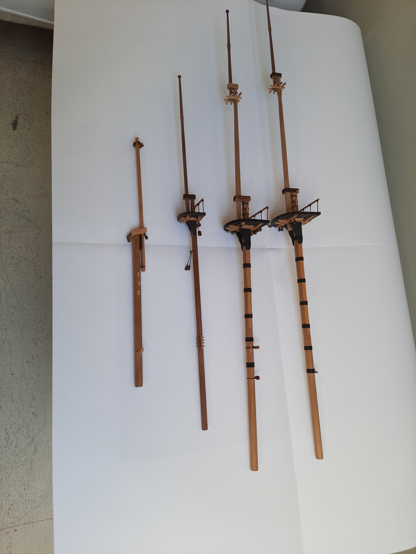 Teraz już idziemy w górę. Przygotowałem maszty i bukszpryt. Kolumny są już otaklowane a stengi jedynie spasowane by mieć wgląd na całość. Z uwagi na zmienność przekrojów drzewc trzeba było ciągle mierzyć i dopasowywać bo robiąc według miar podanych na planie wszystko byłoby dość luźne. Parą fotek w załączeniu. Pozdrawiam Janek