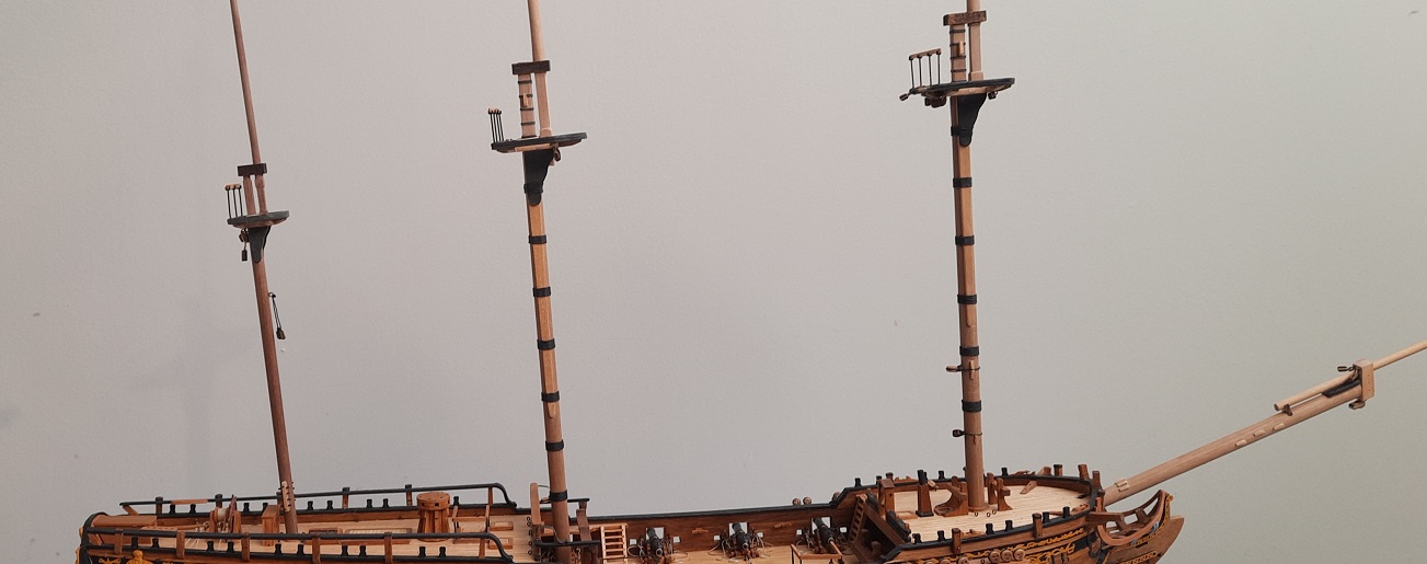 Maszty i bukszpryt pięknie się prezentują, ale coś wydaje się za wysoka kolumna fok masztu, może to dla tego że na sucho poskładałeś albo zdjęcie pod kontem. Nie mam planów Fly, ale wydaje mi się że mars fok masztu powinien być niżej niż mars grot masztu.