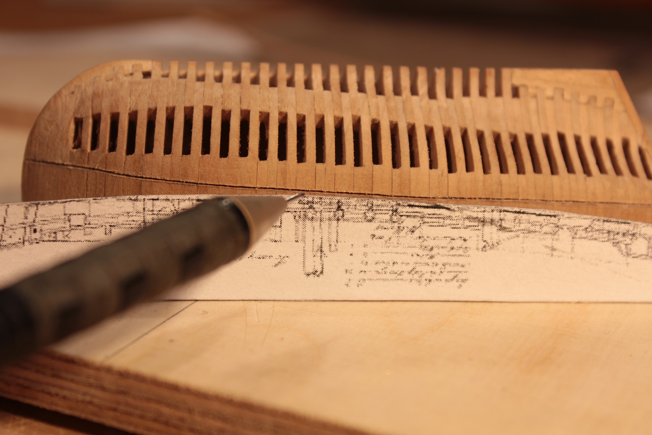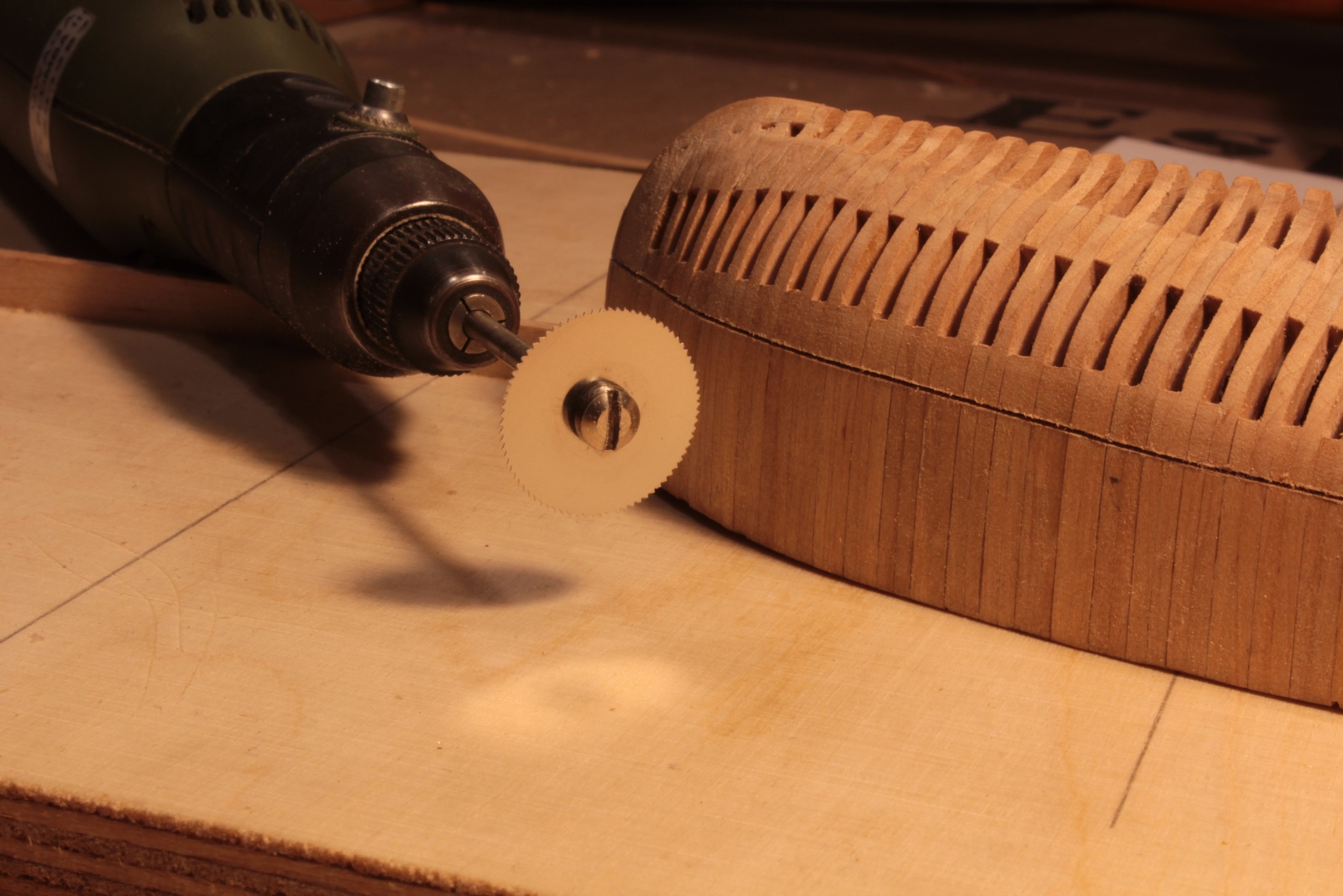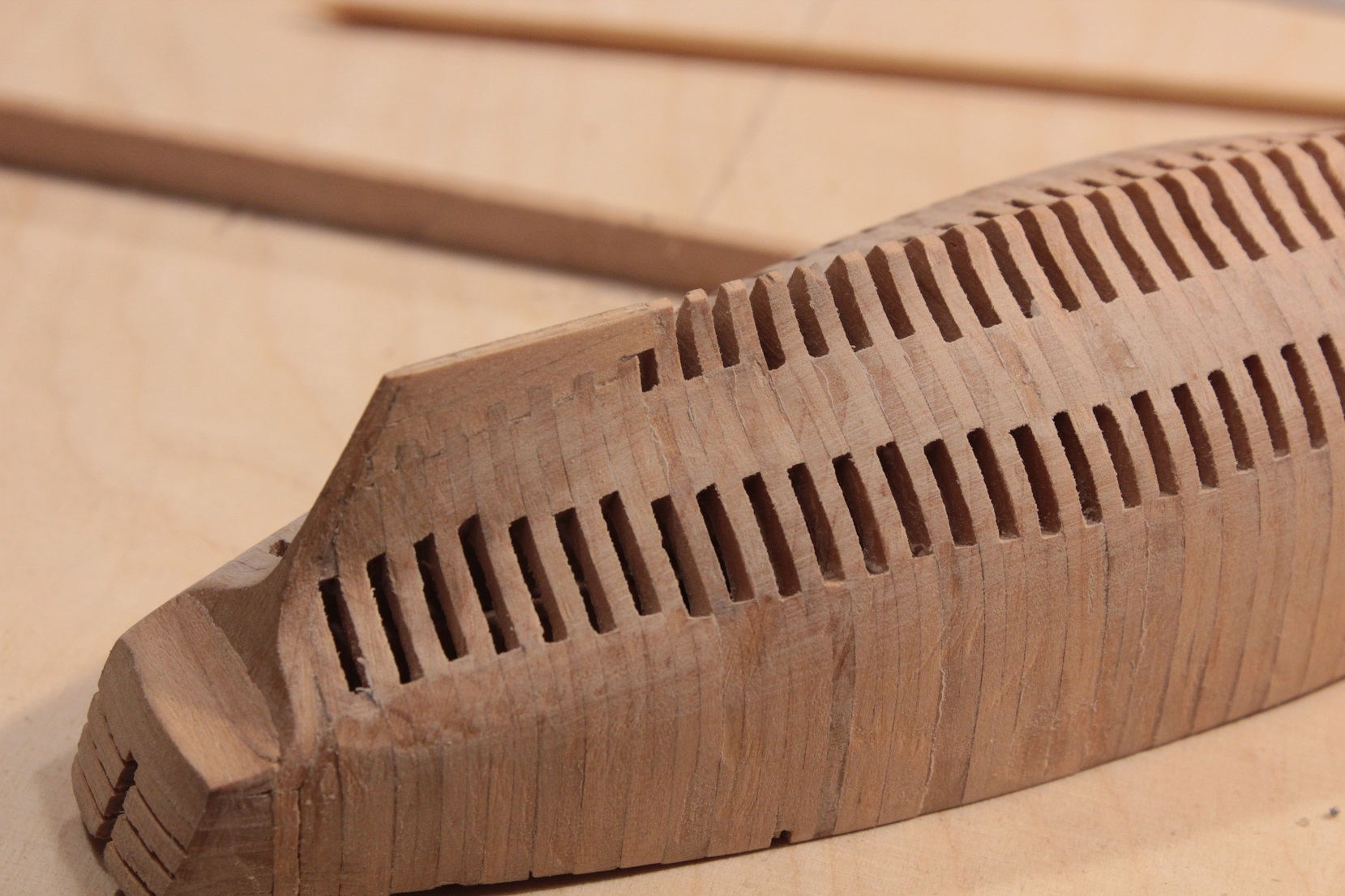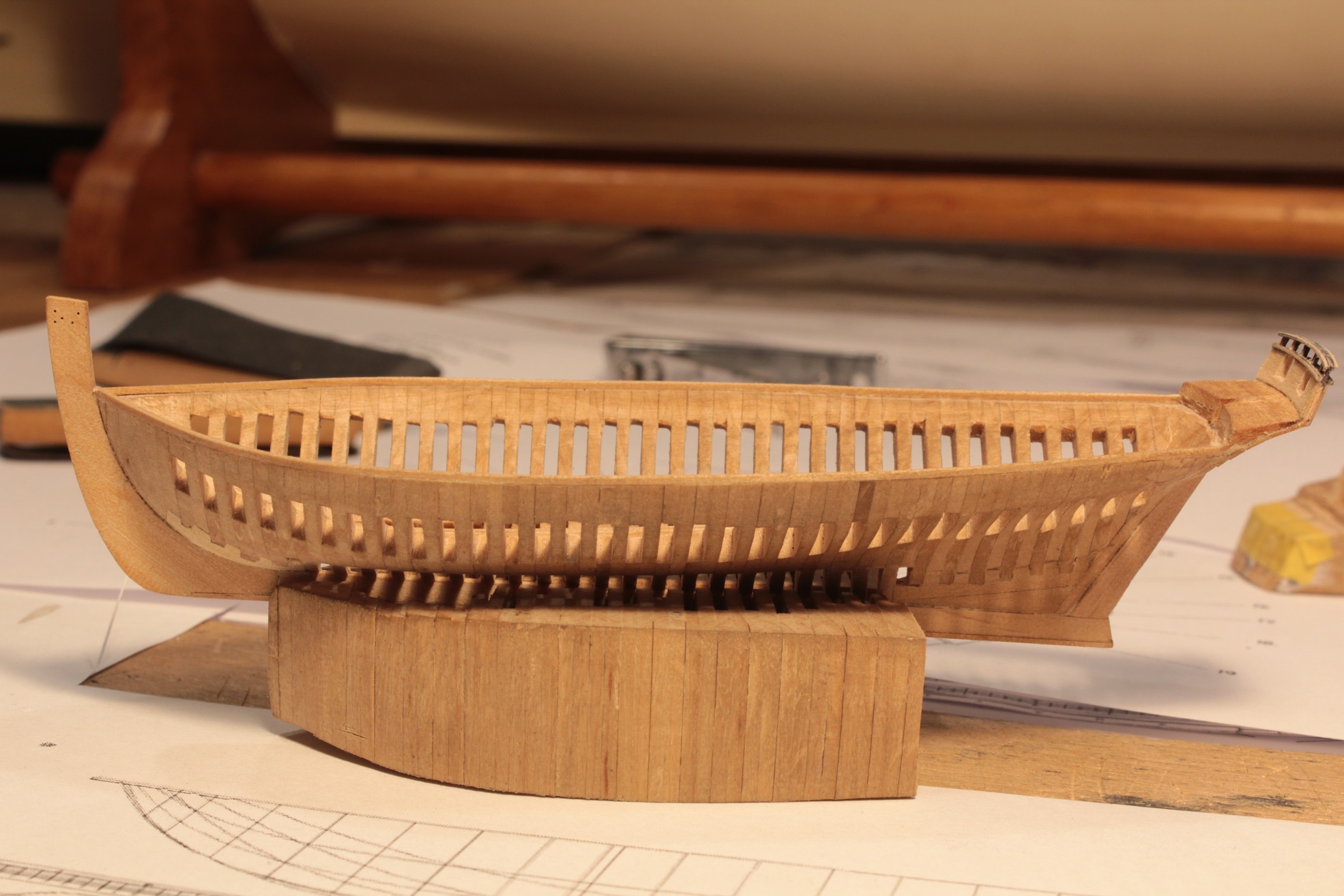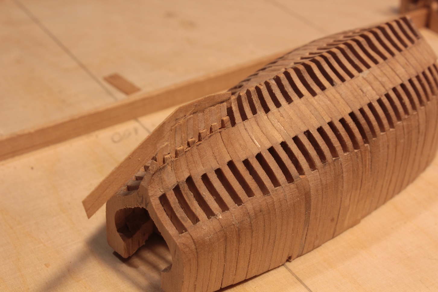 Tak z doskoku dłubię dla zabicia myśli już któryś dzień. Normalnie obróbka tych wręg to jedno przedpołudnie lub popołudnie. Kadłub rozdzieliłem (jedna wręga tylko pękła, już naprawione) na pojedyncze wręgi.