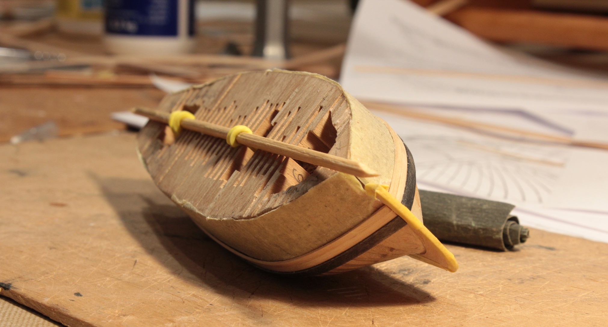 Dziś była stewa dziobowa i rufa. Musiałem wymyślić sposób wykonania i mocowania nadburcia rufowego. Udało się. Nadburcie trzyma się sztywno.