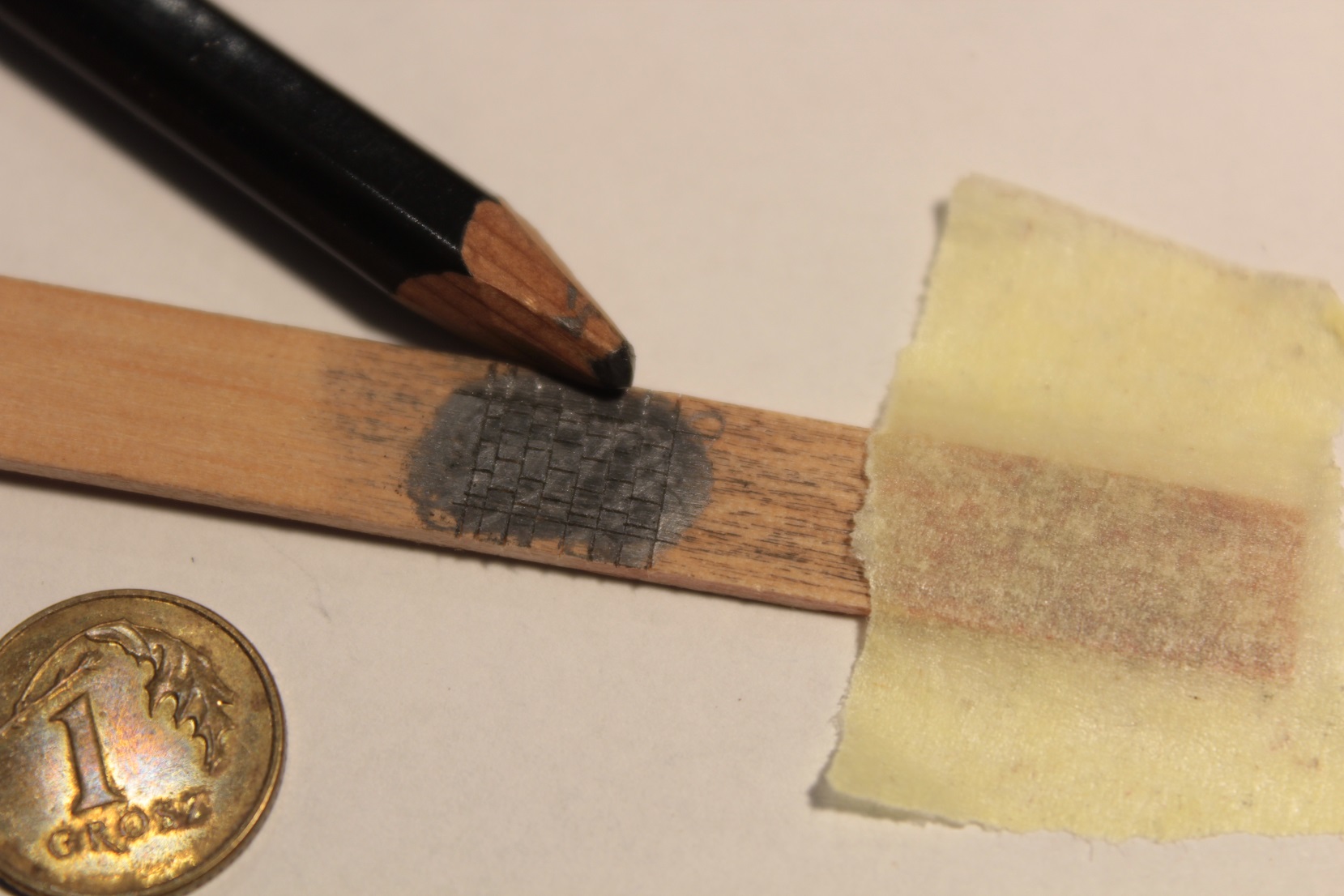 Miękkim ołówkiem B8 wtarłem grafit w szczeliny i słoje (imitacja brudu, wypalenia itp.)