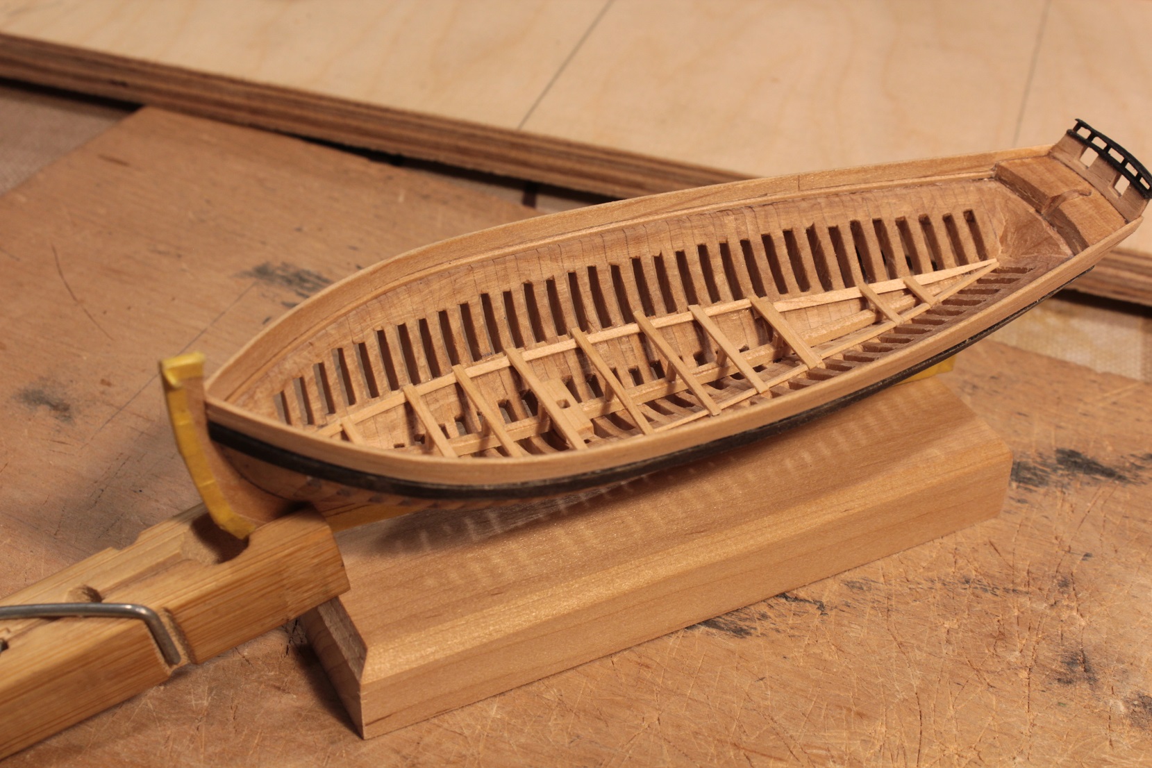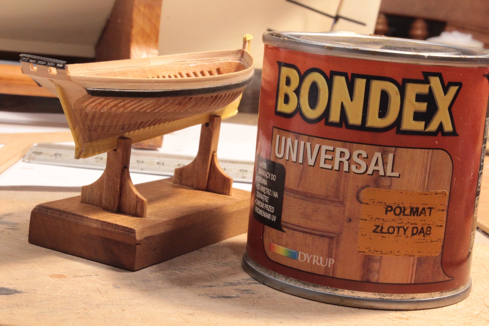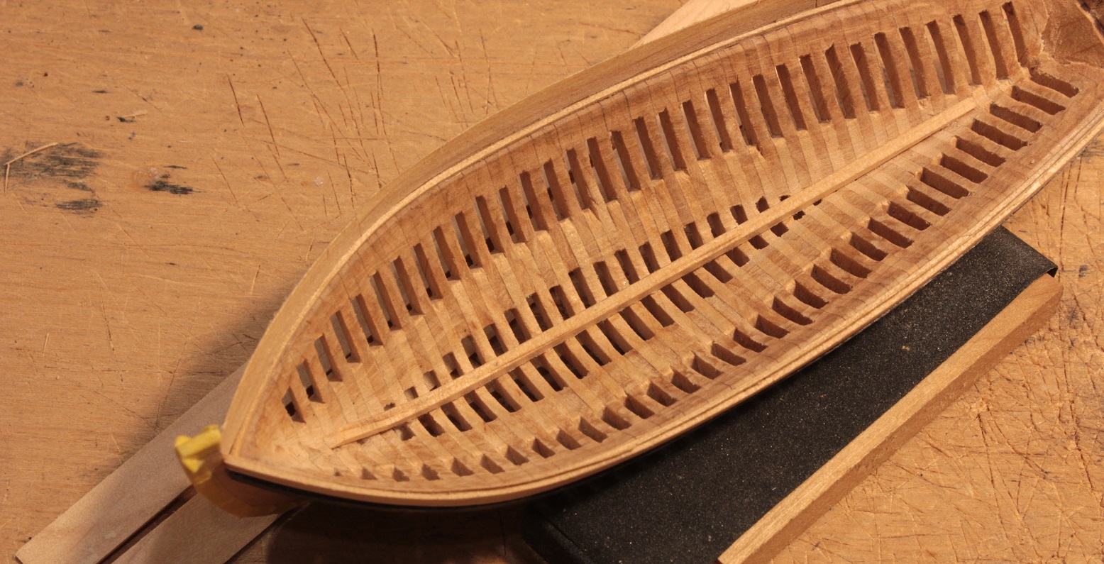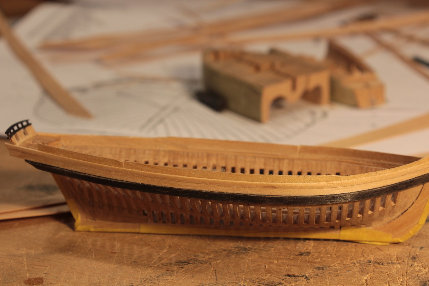 Gryzło mnie sumienie. Musiałem wzmocnić nadburcia z obawy, że jak kadłub poleży, to dojdą naprężenia wynikające z wilgotności powietrza i delikatna spoina na styku dech puści. Wzmocnienie zrobiłem z cienkich olchowych listewek. Zszedłem do 0,2 mm