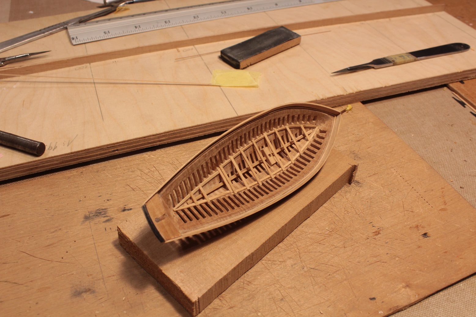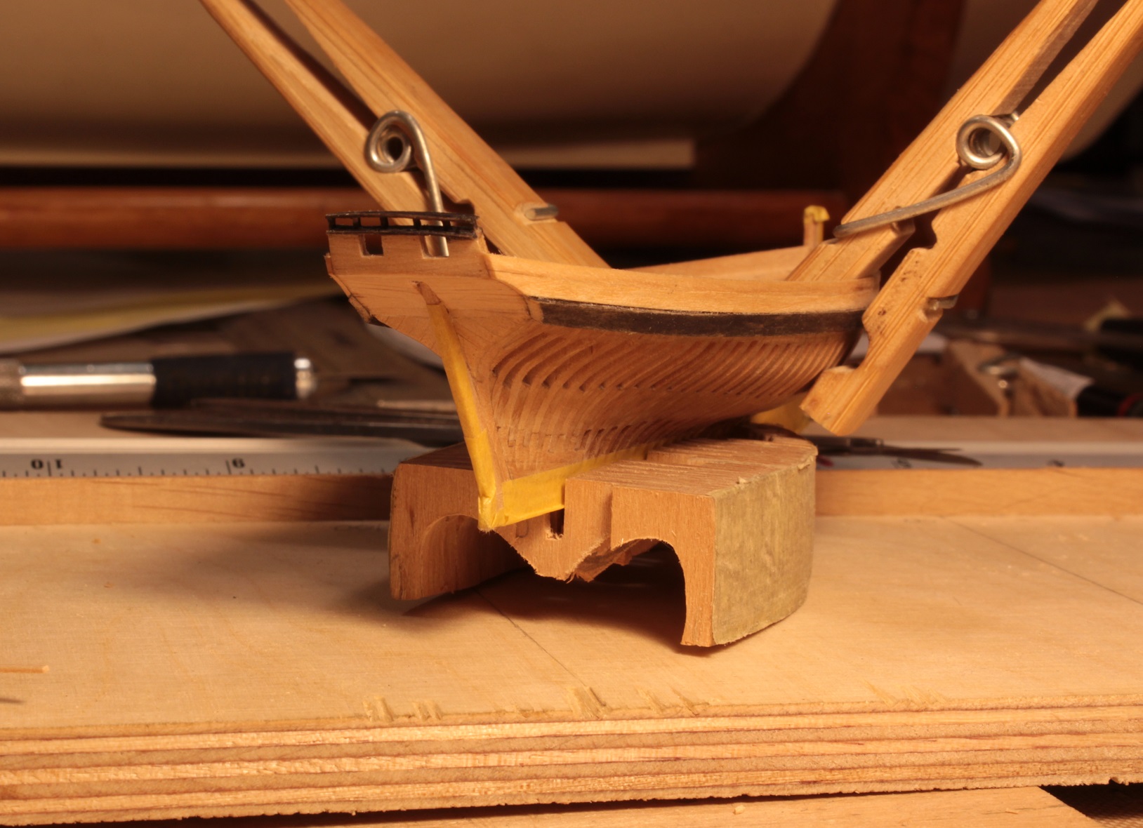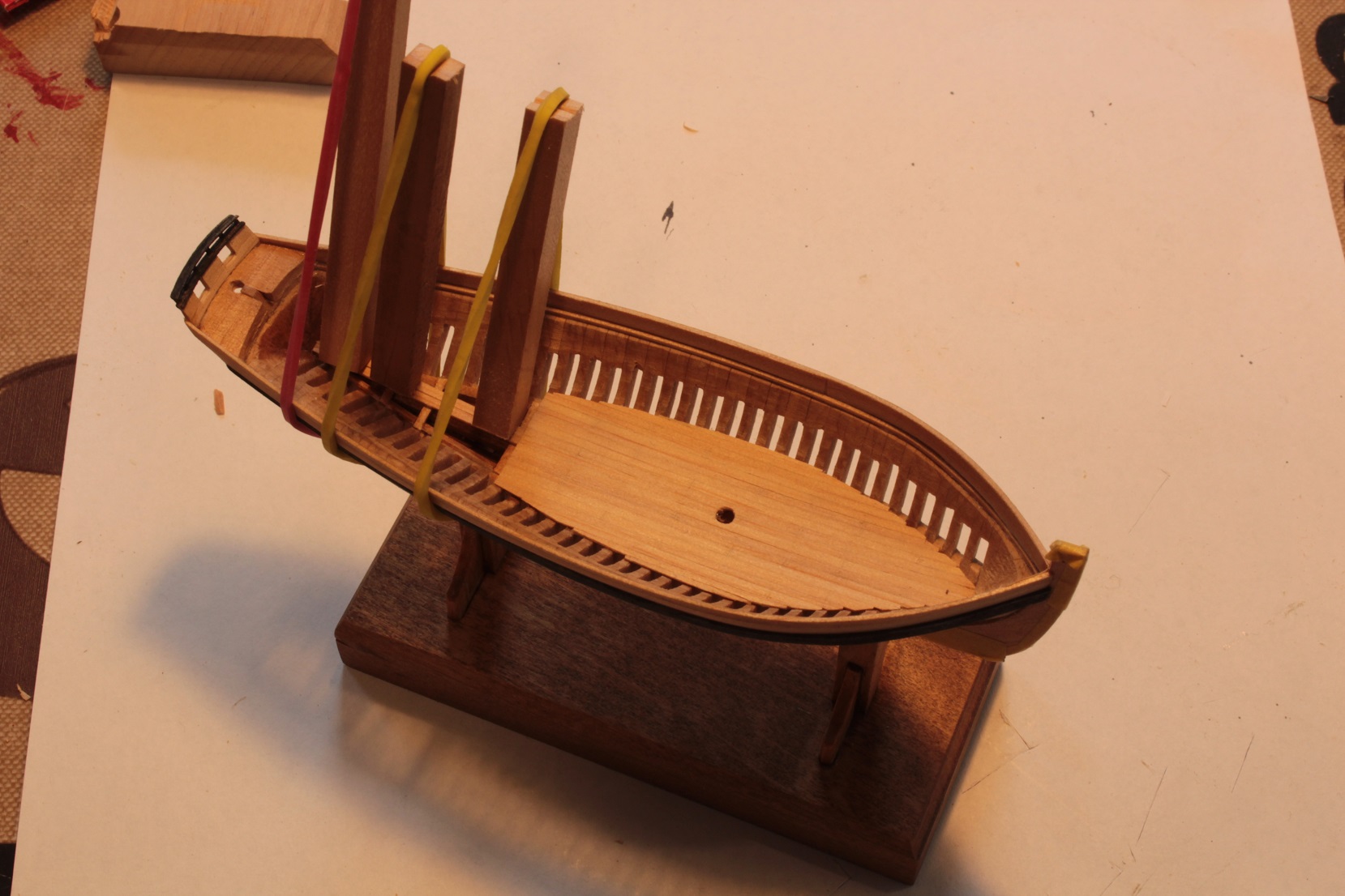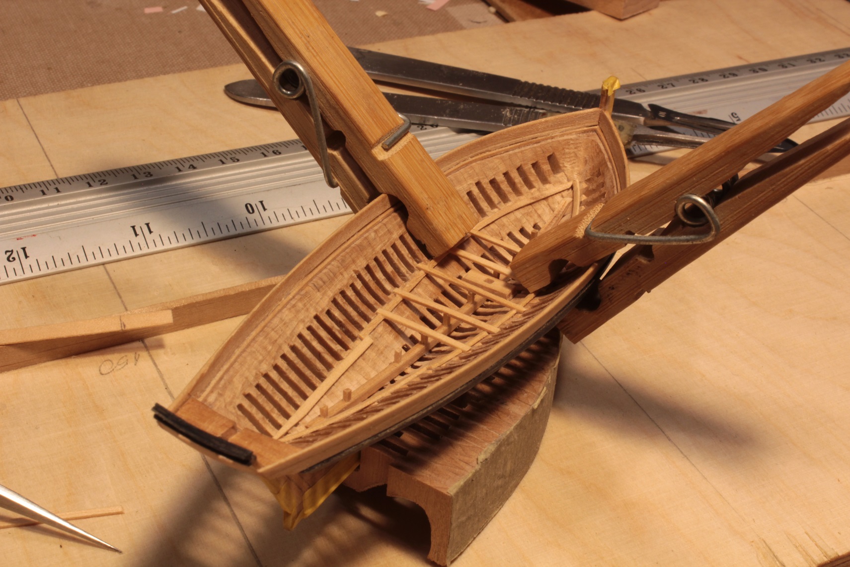 Gryzło mnie sumienie. Musiałem wzmocnić nadburcia z obawy, że jak kadłub poleży, to dojdą naprężenia wynikające z wilgotności powietrza i delikatna spoina na styku dech puści. Wzmocnienie zrobiłem z cienkich olchowych listewek. Zszedłem do 0,2 mm