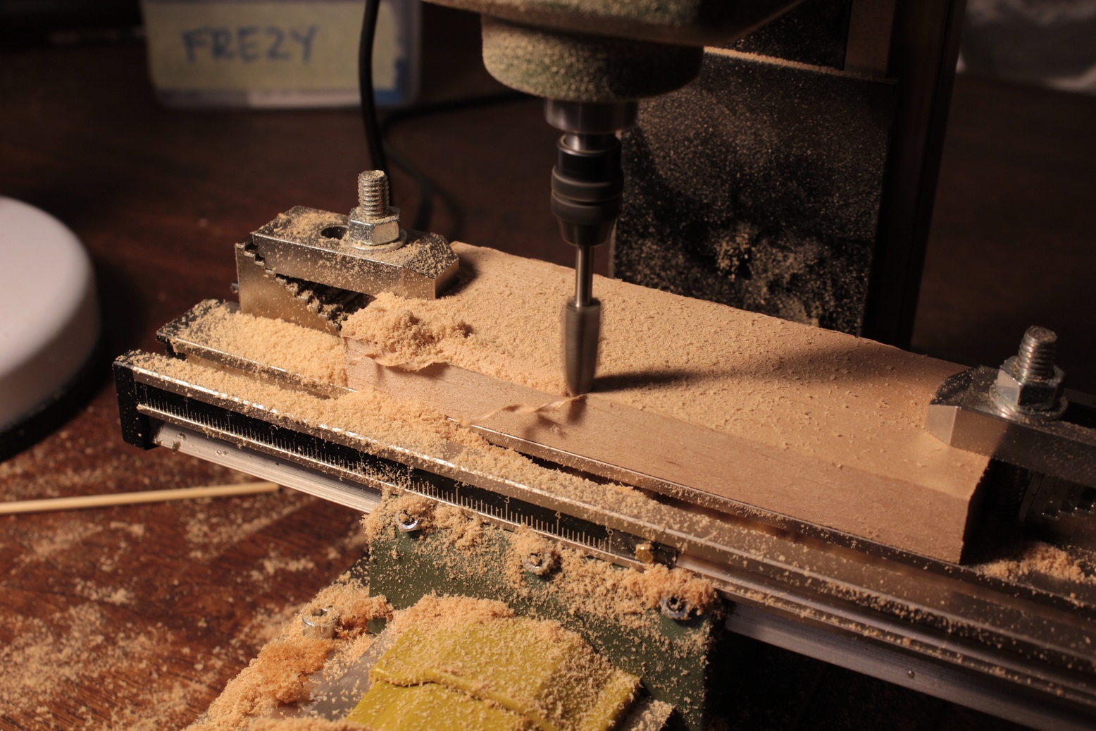 Tak powoli poznaję możliwości (to znaczy swoje możliwości) zakupionej frezareczki. Szkoda, że nie mam małych frezów kształtowych. Tym frezem do rzeźbienia nadam prostą fazę na krawędziach przyszłej podstawki