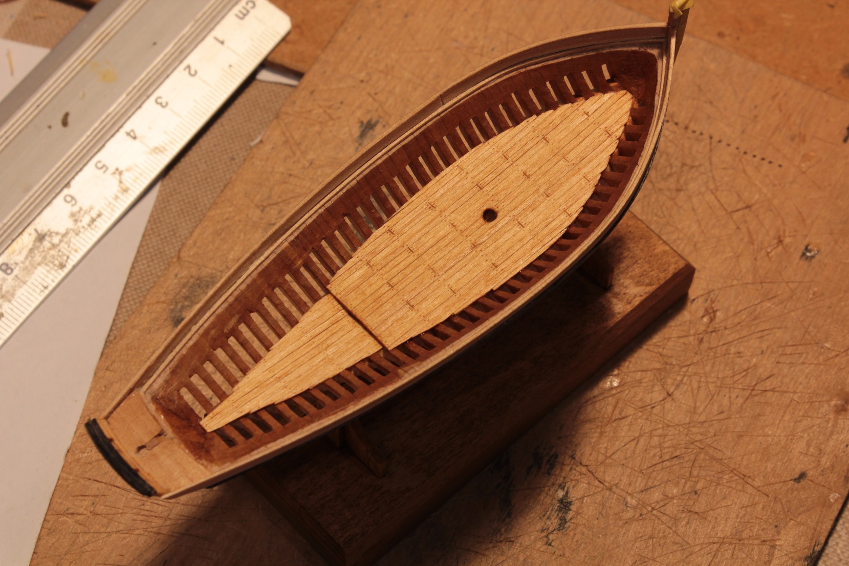Przed wygładzeniem dech pokładu, naniosłem skalpelem linie podziałowe układu desek. Gwoździe nakłułem bardzo cienko zaostrzonym w szpic rylcem.