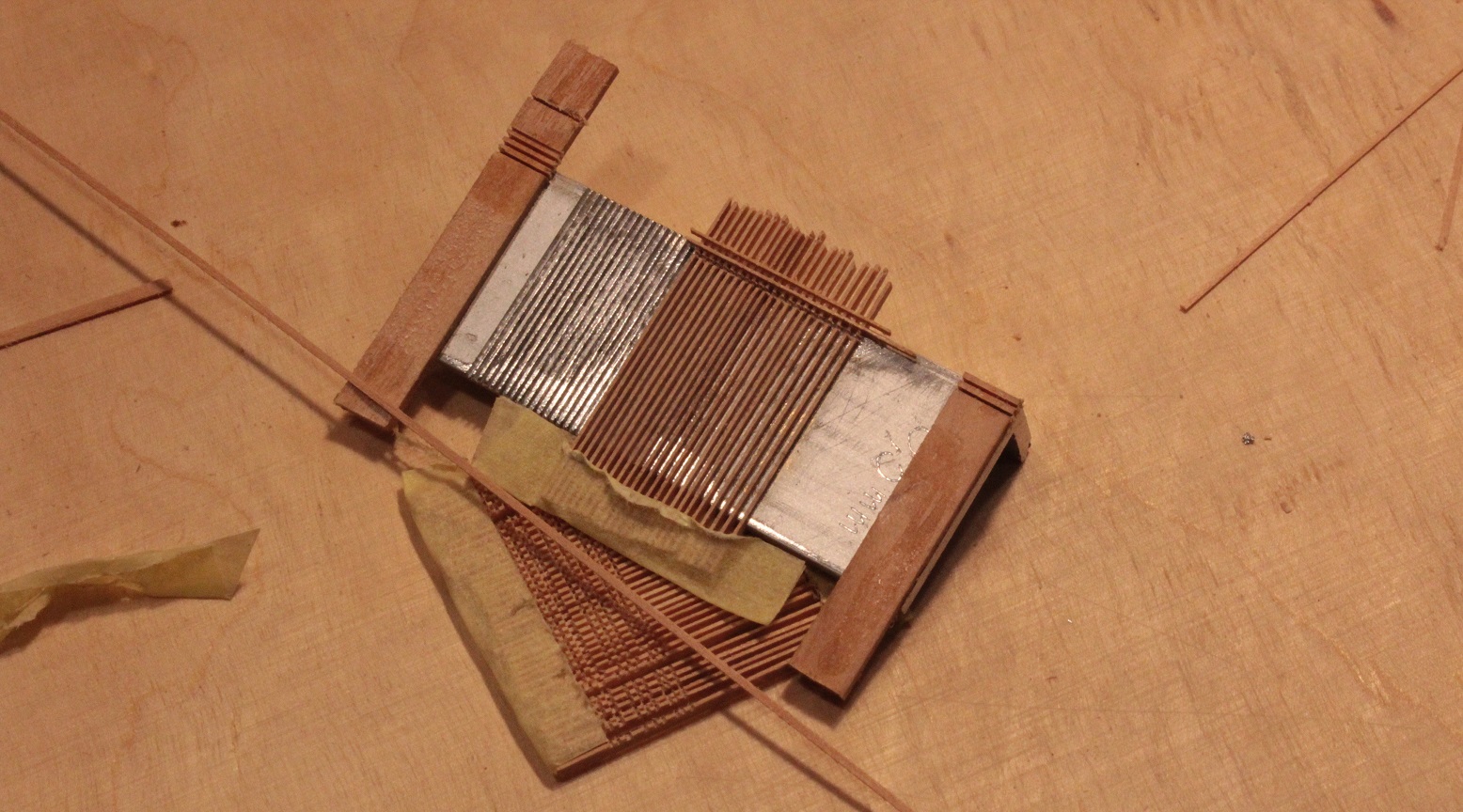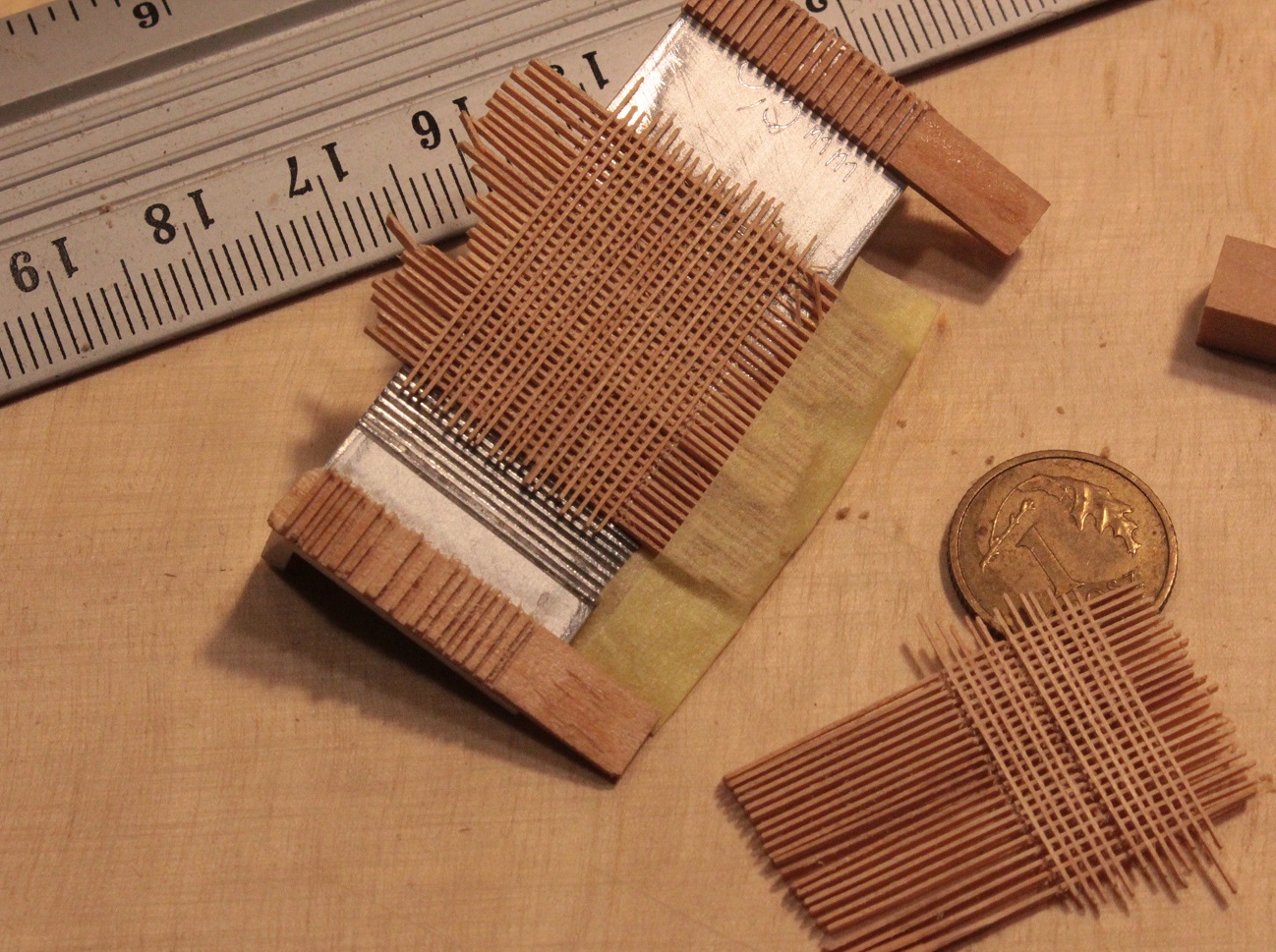 Początkowo chciałem naciąć wszystkie wpusty pod listwy wzdłużne gretingu. Ale przy tych rozmiarach listewek (ich grubość jest ciut mniejsza niż 0,3 mm, tak aby niezbyt luźno w grzebień wchodziły) zęby nacięć były czasem wyrywane. Wymyśliłem żeby po każdym wycięciu wpustów wklejać listwę wzdłużną.