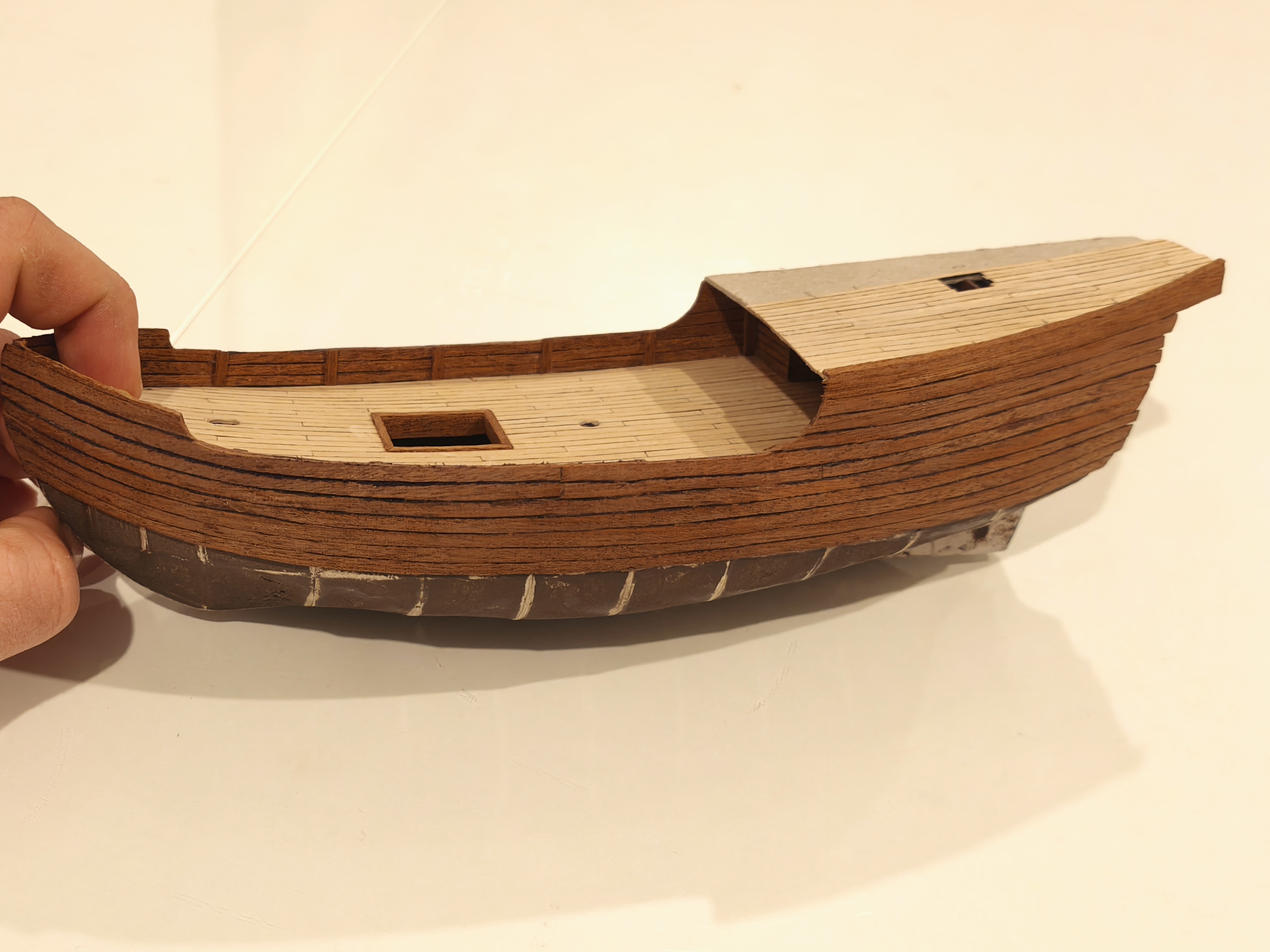 Zaczynam burty co idzie strasznie wolno bo muszę fornir ciąć po łuku. Zobaczymy czy część podwodna gdzie trzeba planki jeszcze skręcać się uda czy fornir się podda.