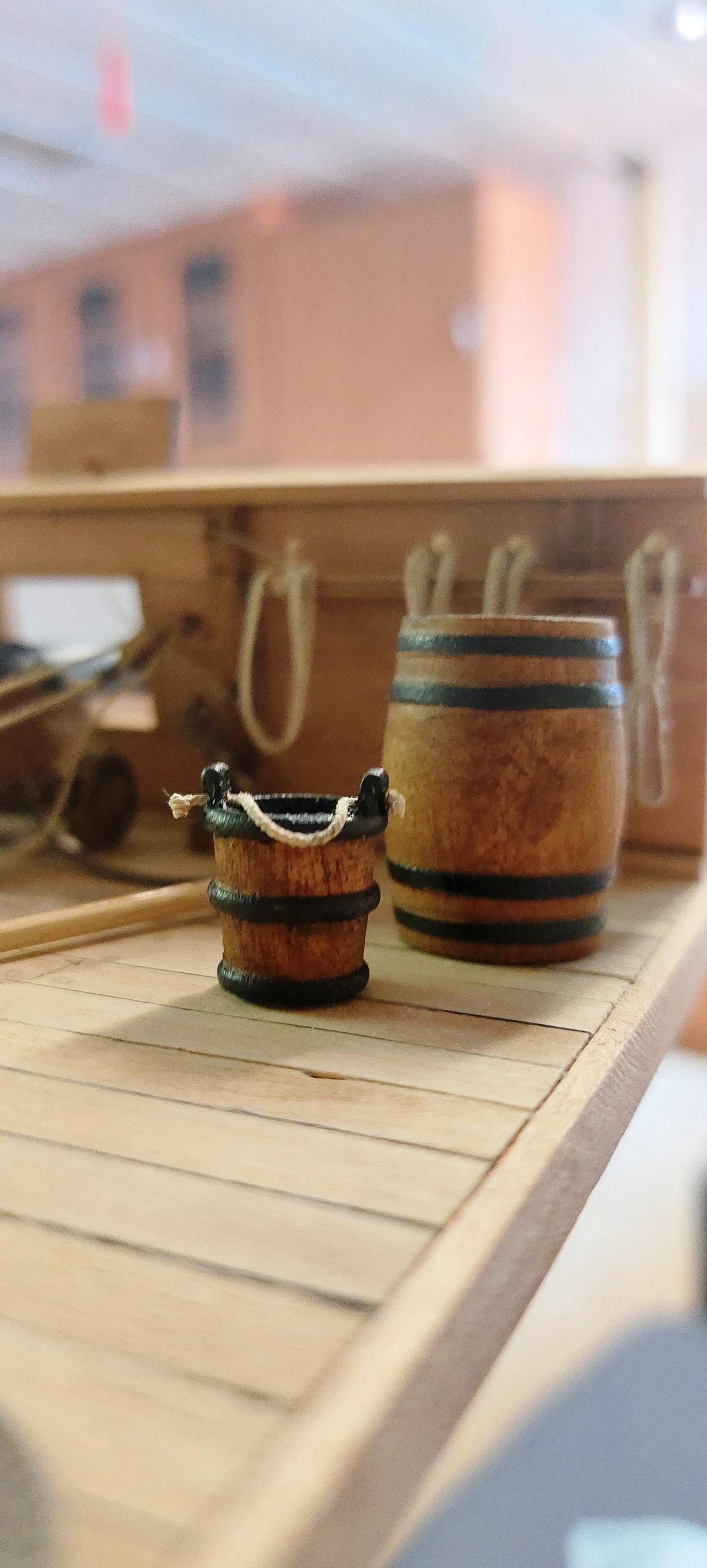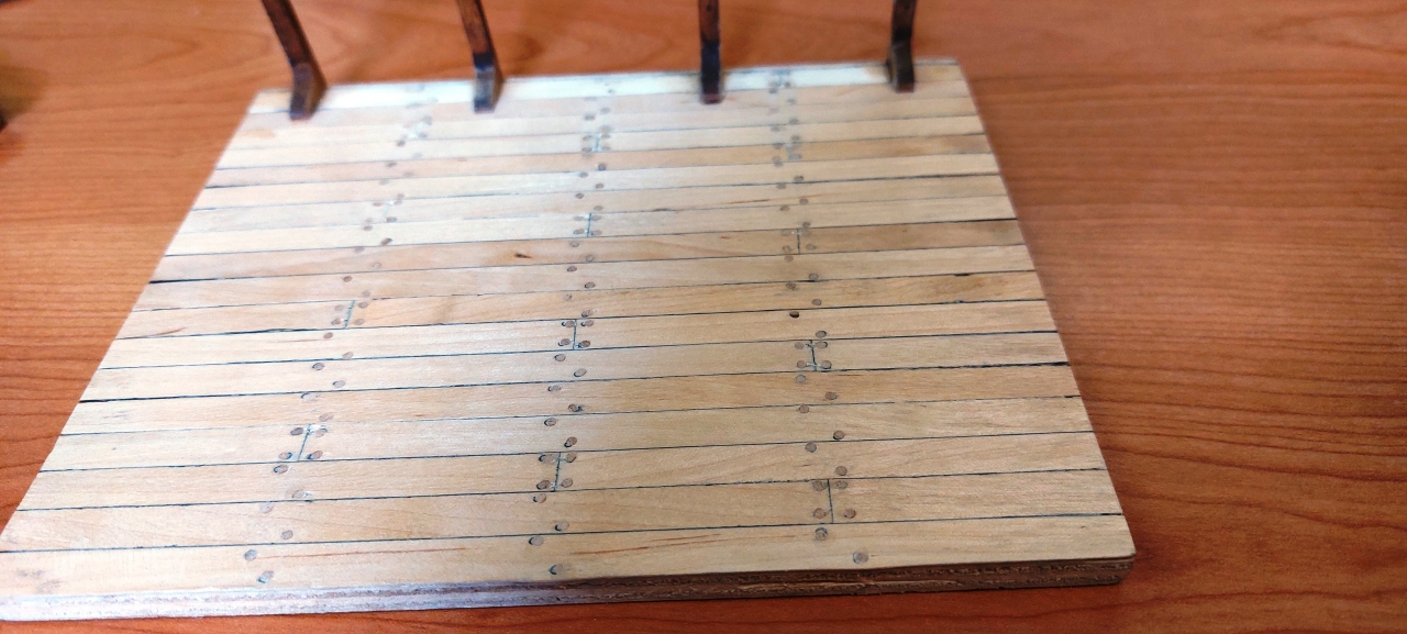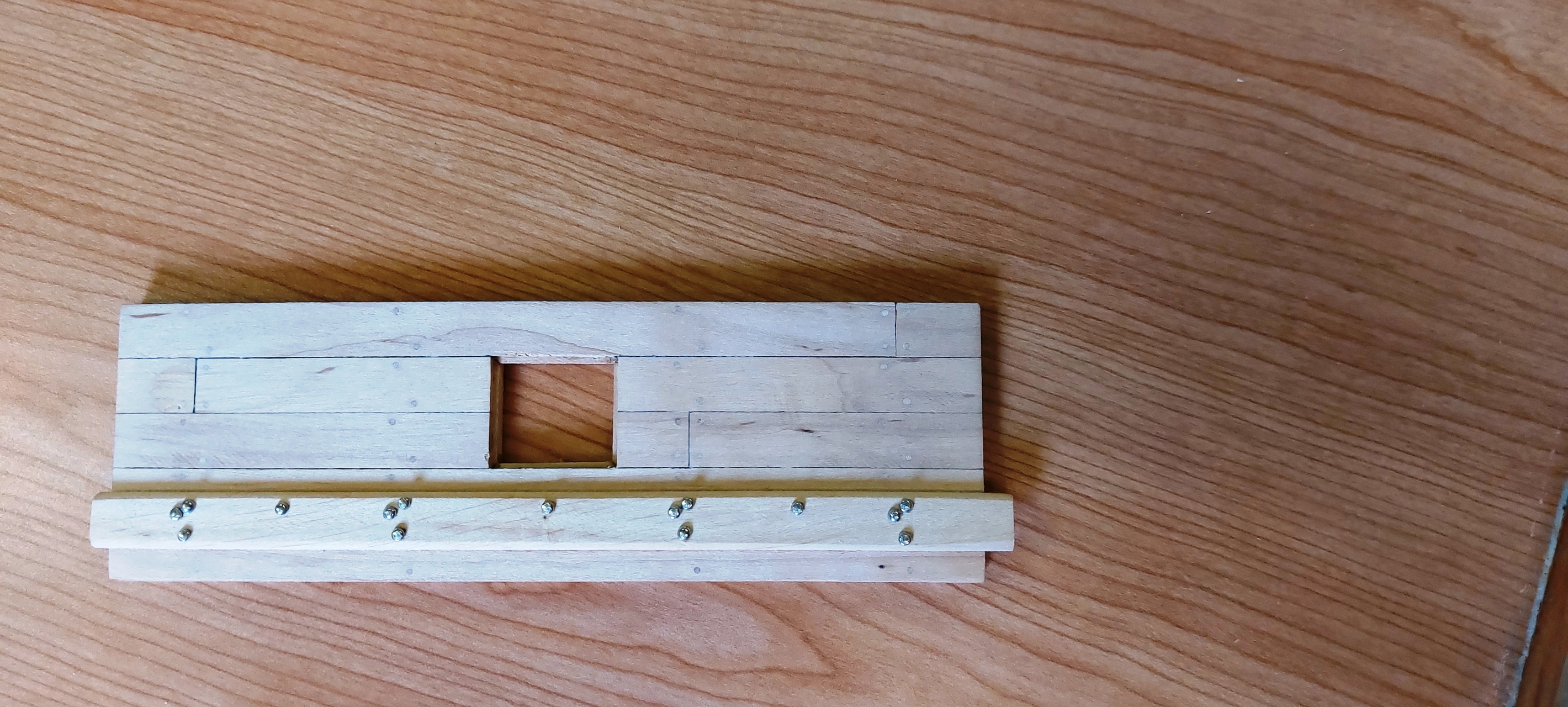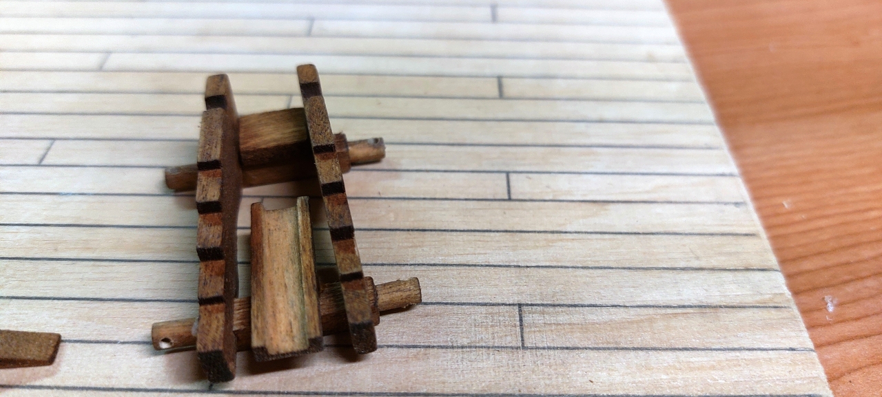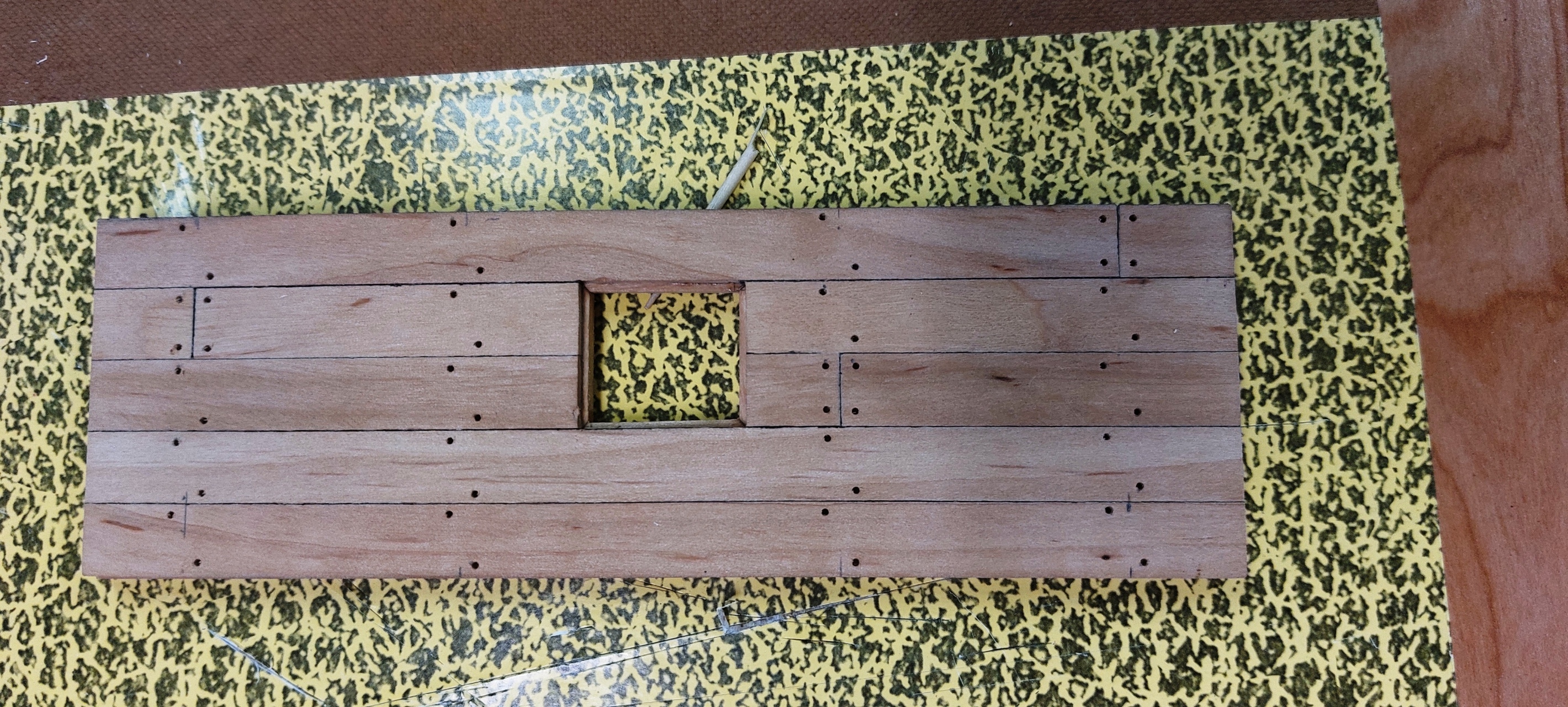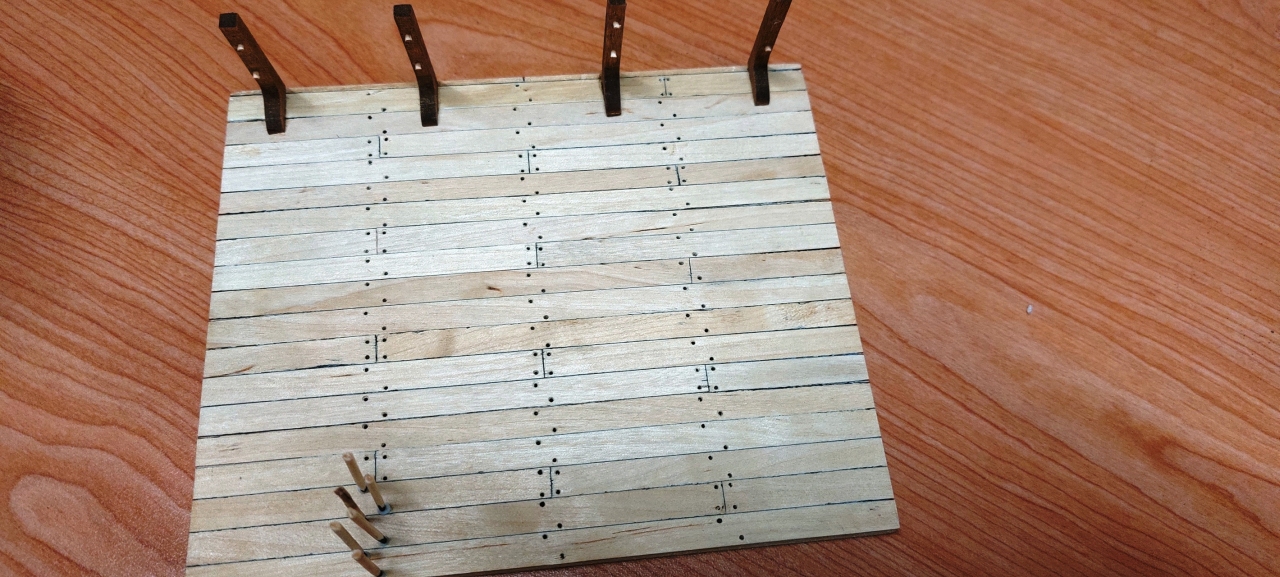 Pokład Nie byłem zachwycony z efektów, więc rozwiercilem wszystko i postanowiłem wbić normalne kolki bez malowania markerem dookoła. Burtą ciąg dalszy Laweta Bloczki Mocowanie lawety Efekt końcowy