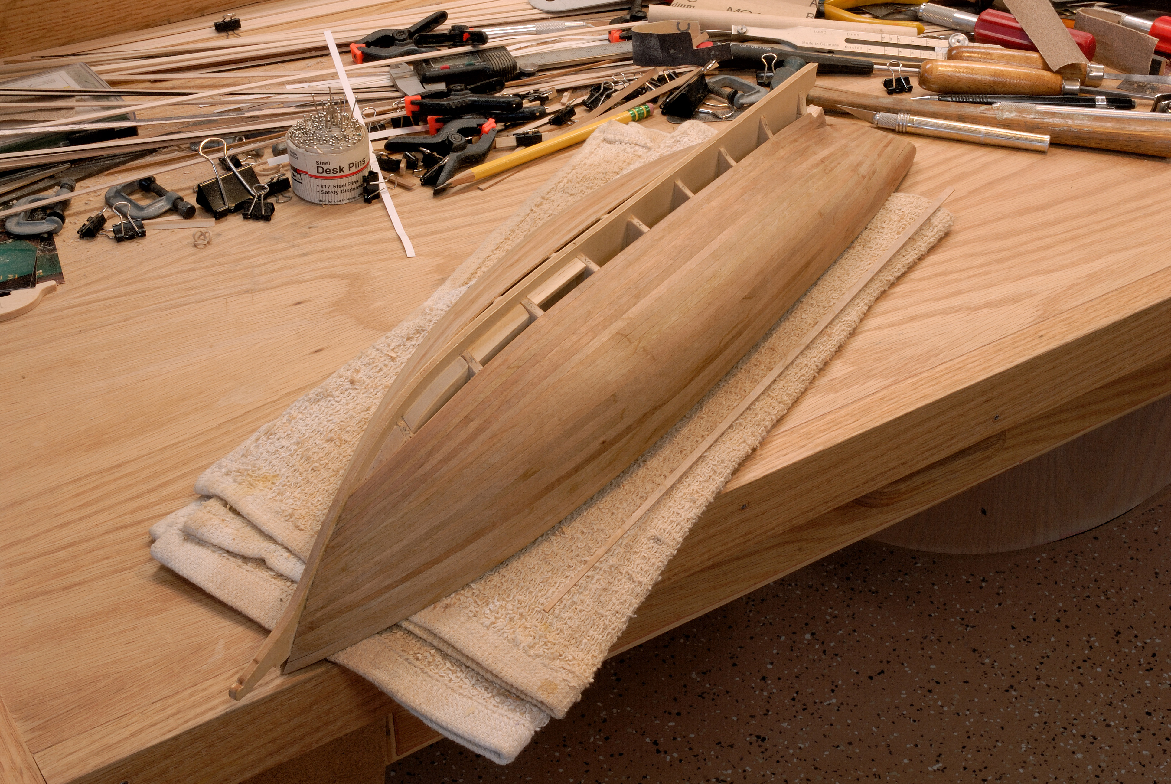 Ty juz zrobiles szkielet swego kadluba, zmieniajac go z typowego szkieletu na swego rodzaju lity kadlub (przez wklejenie tych wyprofilowanych klockow miedzy grodziami), wiec teraz albo zaczniesz poszywac go, kladac planki od dolu ku gorze, tj. garboard strake od srodkowej linii w symetrii kadluba i idac do gory ku odbojnikom, z obu burt. Albo tez, po polozeniu obu planek garboards, naciac rowek w srodkowej osi kadluba na Twoj kil, wkleic go tam i dalej postepowac jak w przypadku standardowego poszywania kadluba. Wybor zalezy od Ciebie. Waznym jest jednak, by w obu przypadkach zachowac starannosc i dokladnosc, by obie burty byly idealnie symetryczne, bo od tego bedzie zalezec dalszy proces poszywania. Nie poszywac od razu cala jedna burte i przejsc do burty drugiej a raczej stopniowo klasc po jednej listewce z obu burt, by zapobiec wypaczeniu kadluba.