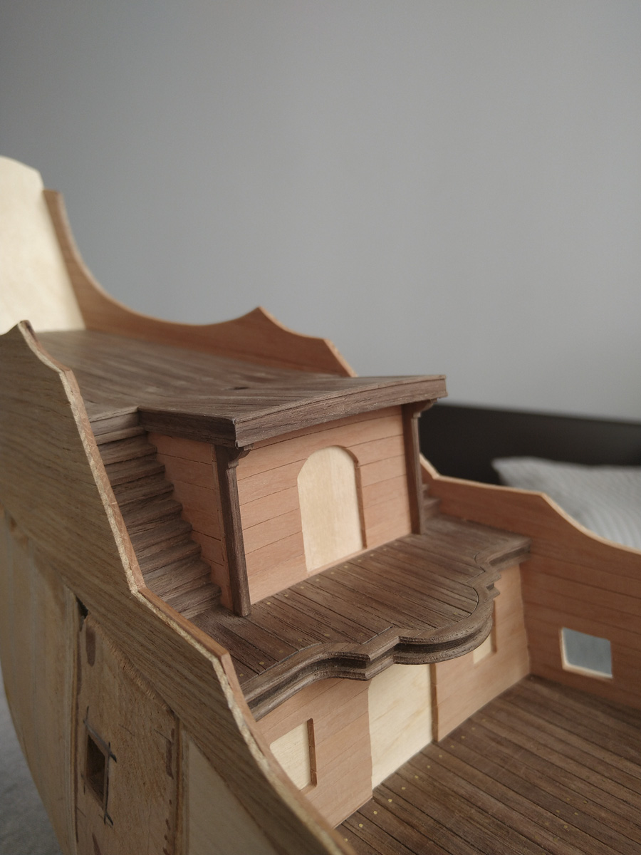 Doszły ostatnie pokłady. "Wystrugałem" też kilka nowych elementów. Kil i stewę chciałem podzielić na elementy, tak żeby nie były z jednego kawałka drewna, ale niestety nie za bardzo wiedziałem jak mam to rozrysować, zostawiłem więc te elementy uproszczone, tak jak w planach Czarnej Perły.