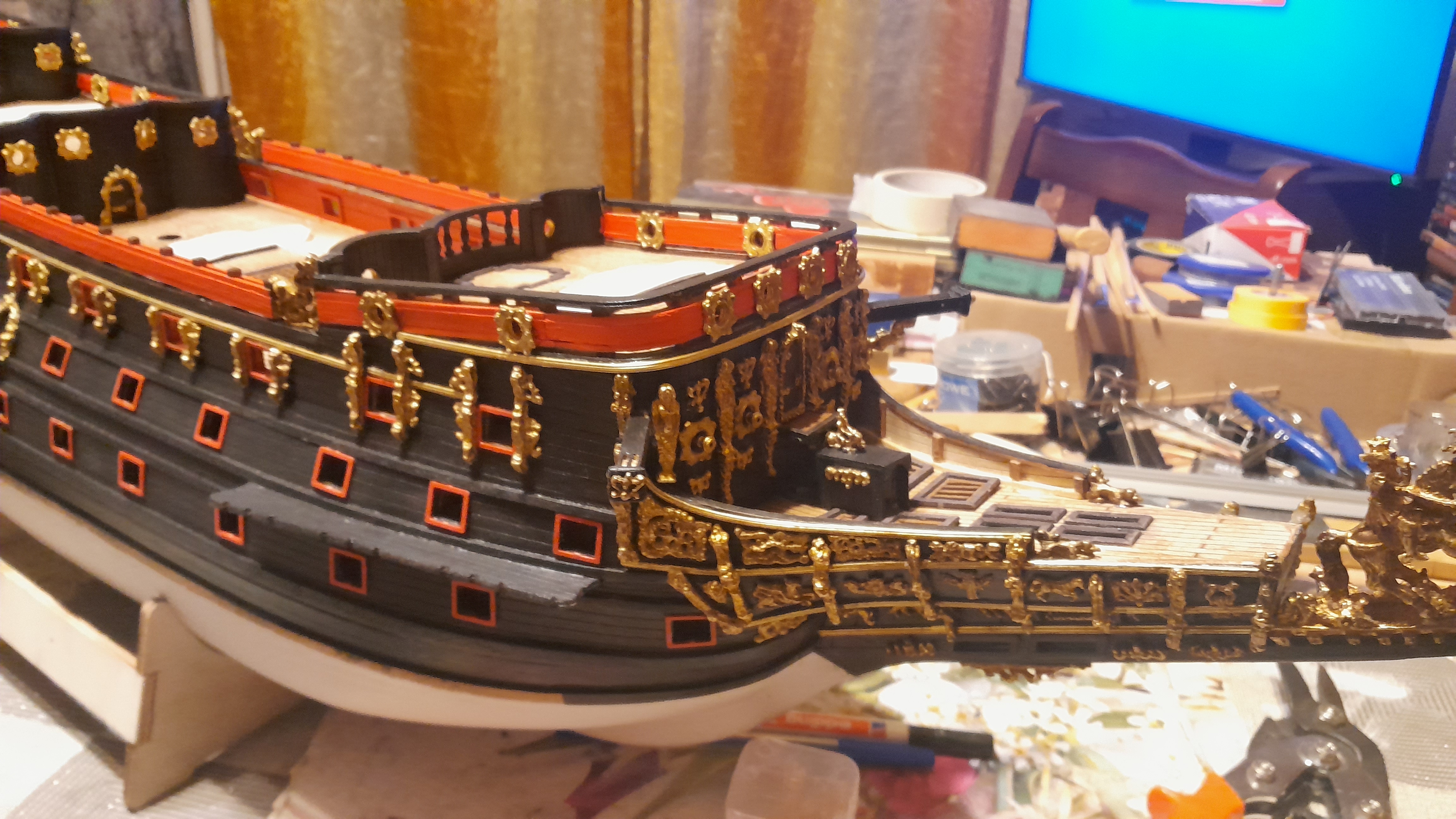 Artykuł z linku od Ciebie znam, znam model Oburcovej, znam model Twojego przyjaciela Bila (szkoda ze przestał go budować dalej bo uważam, ze to cudo jest), jeszcze jeden Czech buduje SoS także z kartonu (relacja jest na innym forum) Mam zalinkowane i obserwuje kilka innych relacji z budowy SoS na przynajmniej dwóch czy trzech forach modelarskich, szczególnie z tego konkretnego zestawu. Na necie można znaleźć tez kilka filmików z ta budową... No właśnie... jest taki film na którym modelarz zbudował SoS-a z tego zestawu bardzo ładnie i na sam koniec dołożył ogromne koło sterowe na najwyższym kasztelu... no szkoda całej pracy... Do czego zmierzam. W zasadzie każdy model tej jednostki to gdybanie. Model z muzeum w Greenwich jest chyba najstarszy bo pochodzi z XIX wieku i może opierał się na jakiejś dokumentacji, która się nie zachowała. Model z MMW z Gdyni był opisywany dawno temu w czasopiśmie "Morze" i gdy byłem małym dzieciakiem wywarł na mnie ogromne wrażenie. No i teraz powstaje moja wersja na mój prywatny użytek. Buduję go inaczej niż wynika to z samego zestawu a opieram się na zasadach ówczesnej sztuki użytkowej i dekoratorstwa (np te linie poziome złoceń i szczelniejsze wypełnienie przestrzeni płaskorzeźbami), oraz na dostępnej dla tamtych czasów wiedzy szkutniczej (np zmieniłem kształt pawęzy rufowej na bardziej galeonowaty - ale nie do końca) - co jest proponowane w zestawie).