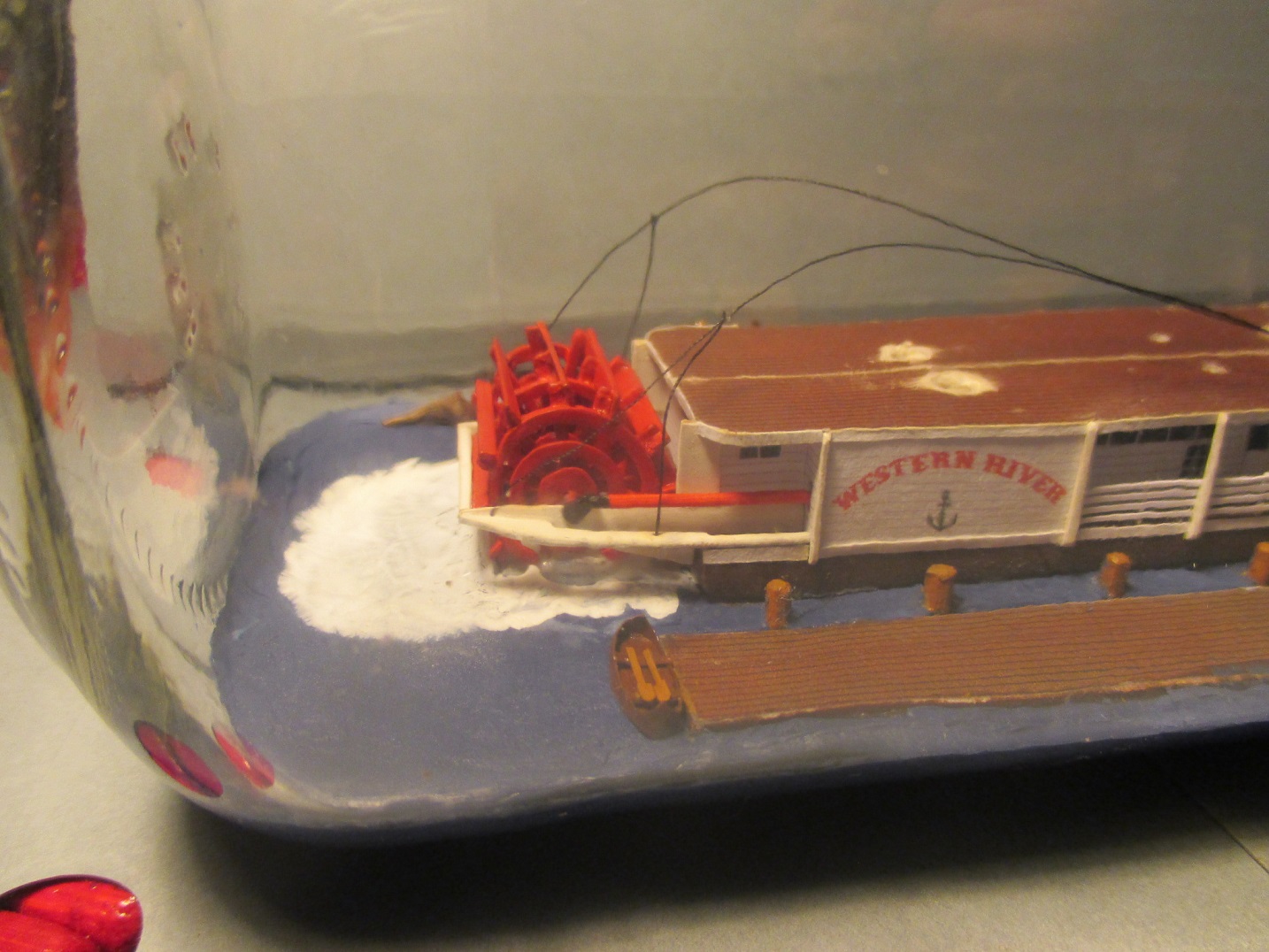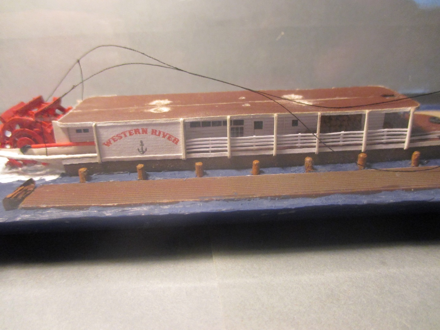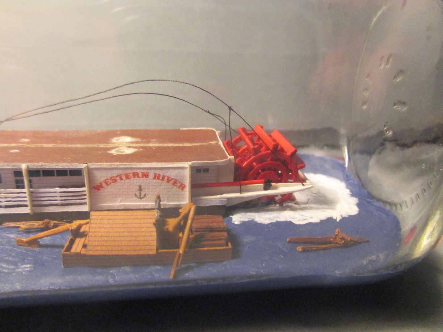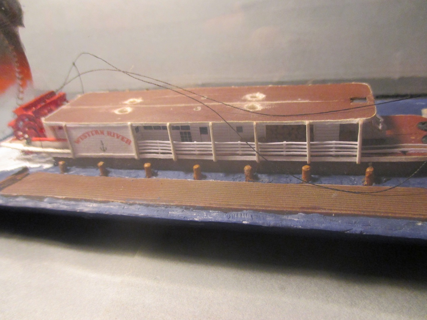 Trochę doszło nowych elementów. Niestety nie ma czym się chwalić. Zamontowałem koło napędowe, trzy łódeczki i konary z drzewa.Koło opierało się na wysięgnikach ale żeby mieć pewność, że nie odpadnie przytwierdziłem je wikolem do podłoża. Piane namalowałem farbą malarska.I tu wyszła kaszana.Wikol i farba równa się wilgoć a ona zdeformowała mi barierki.Próbuję je prostować trochę już pomogło ale to nie jest jeszcze to.Na zdjęciach wygląda to fatalnie, w rzeczywistości aż tak mocno nie rzuca się w oczy.