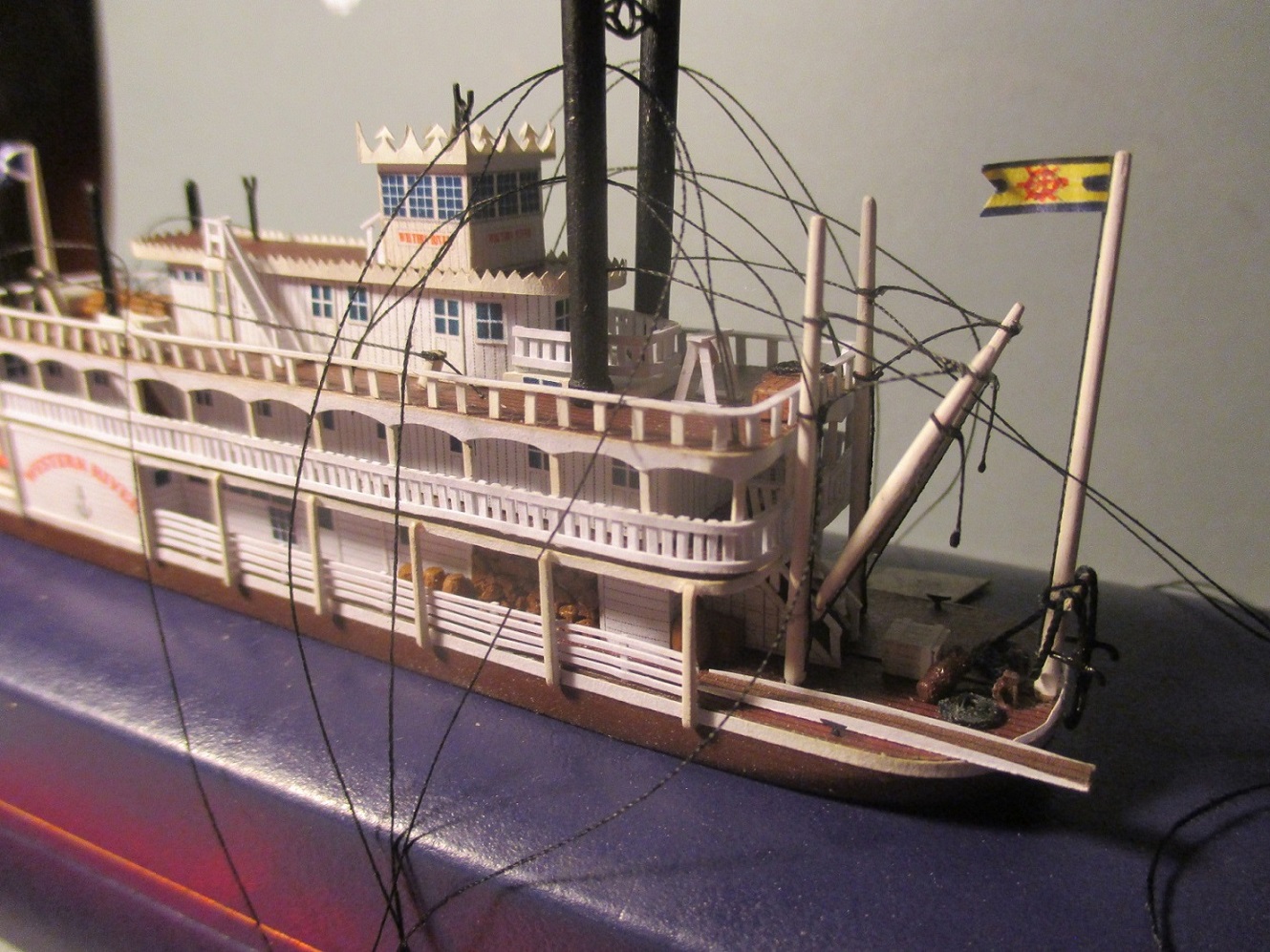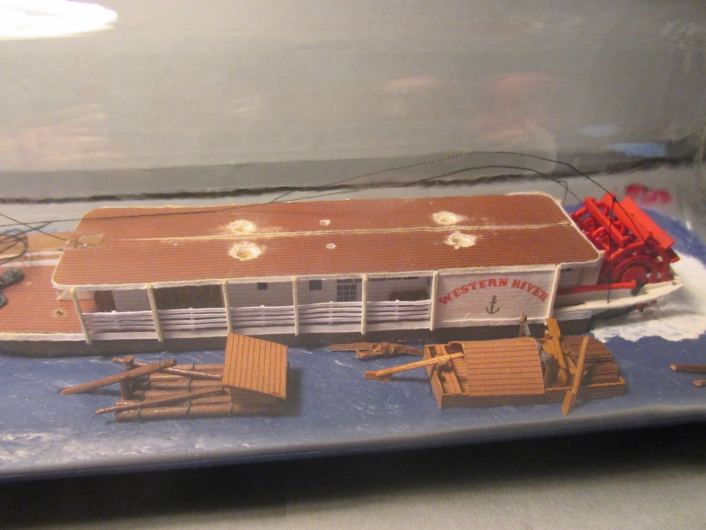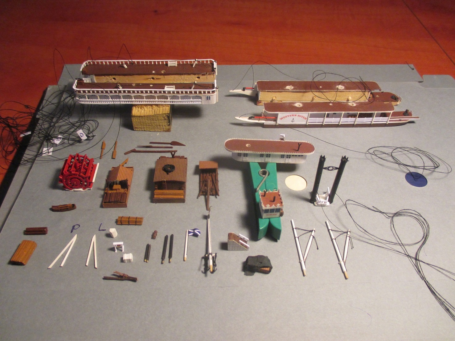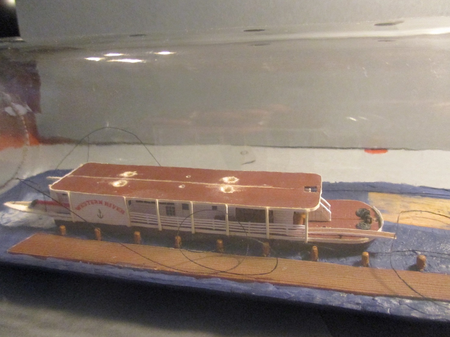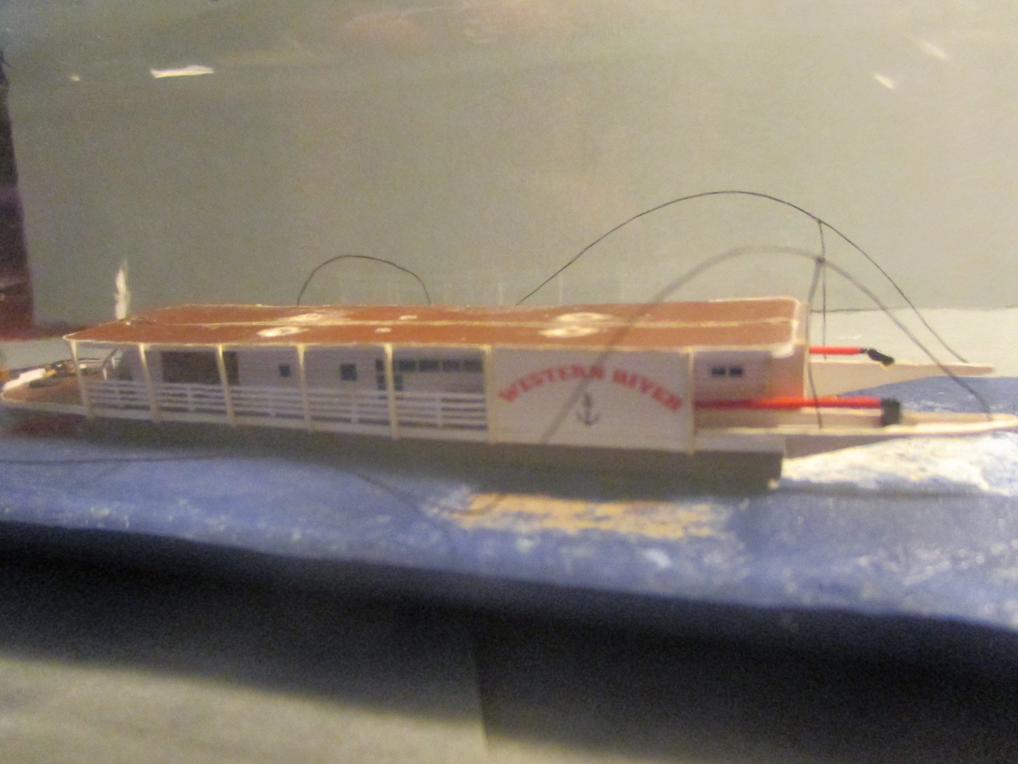 Trochę doszło nowych elementów. Niestety nie ma czym się chwalić. Zamontowałem koło napędowe, trzy łódeczki i konary z drzewa.Koło opierało się na wysięgnikach ale żeby mieć pewność, że nie odpadnie przytwierdziłem je wikolem do podłoża. Piane namalowałem farbą malarska.I tu wyszła kaszana.Wikol i farba równa się wilgoć a ona zdeformowała mi barierki.Próbuję je prostować trochę już pomogło ale to nie jest jeszcze to.Na zdjęciach wygląda to fatalnie, w rzeczywistości aż tak mocno nie rzuca się w oczy.