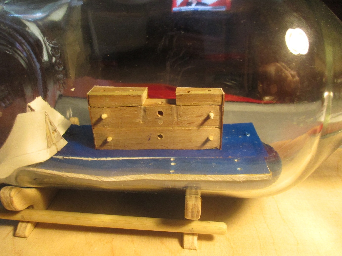 Pierwsze elementy złożone w butelce. Zaczynam od dachów ze względu na to, że póżniej będę miał mało miejsca na ich złożenie w środku. Teraz spróbuję zlikwidować widoczne połączenia. Nie wiem czy w 100 procentach mi się to uda.