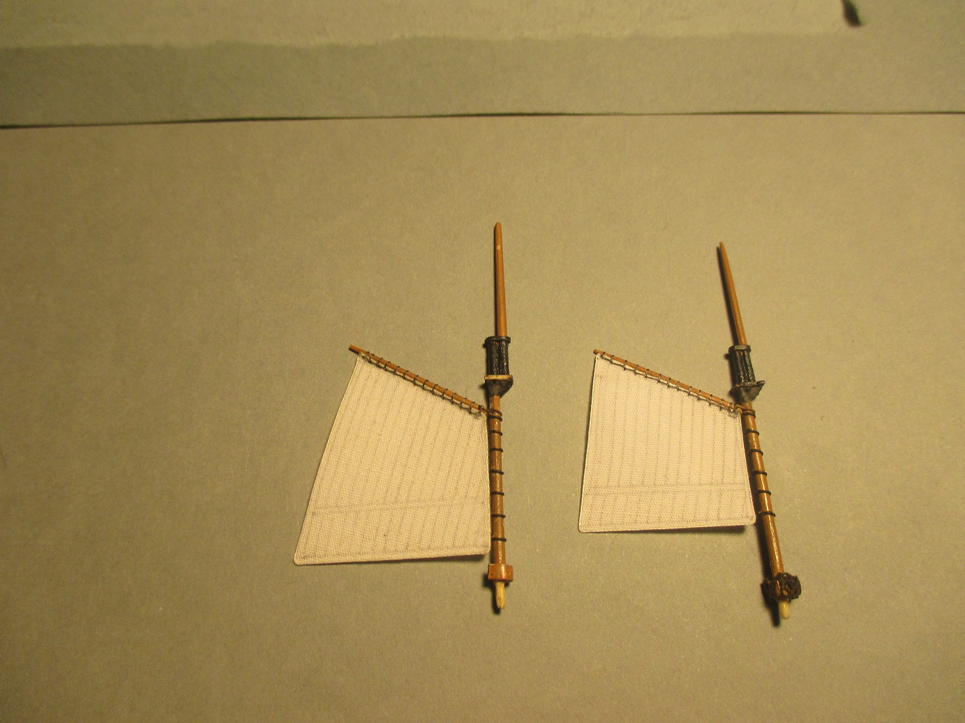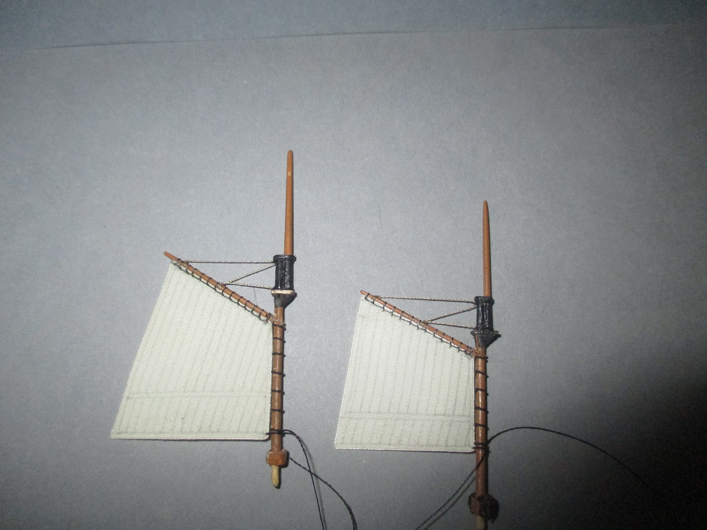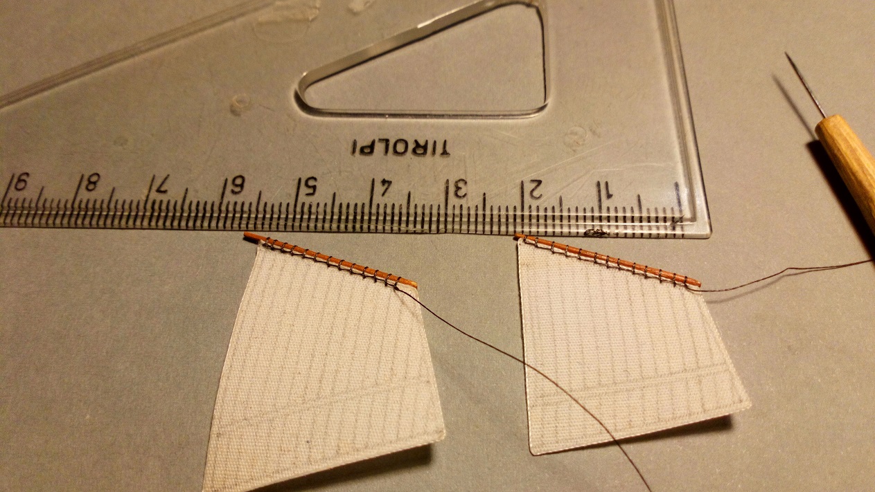 Nie za dużo ale zawsze coś do przodu. Udało mi się zrobić lampy pozycyjne, żurawiki łodzi i zacząłem montaż żagli. Trudno mi było zdobyć odpowiednie nitki do przymocowania żagli.Najpierw kupiłem w pasmanterii, okazały się za grube. Póżniej kupiłem w chińskim markecie odpowiedniej grubości nitkę z jakiegoś tworzywa sztucznego ale okazała się za sztywna. Kumpel polecił mi zakup plecionki w sklepie wędkarskim i to był strzał w dziesiątkę. Szkoda,że nie mają w kolorze brązowym. Potrzebuję brązowych nici do olinowania ruchomego. Będę szukał dalej.