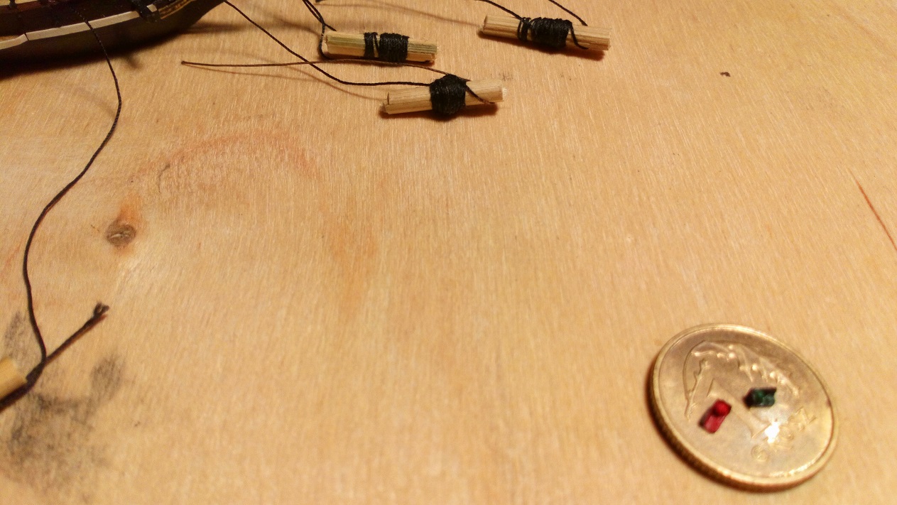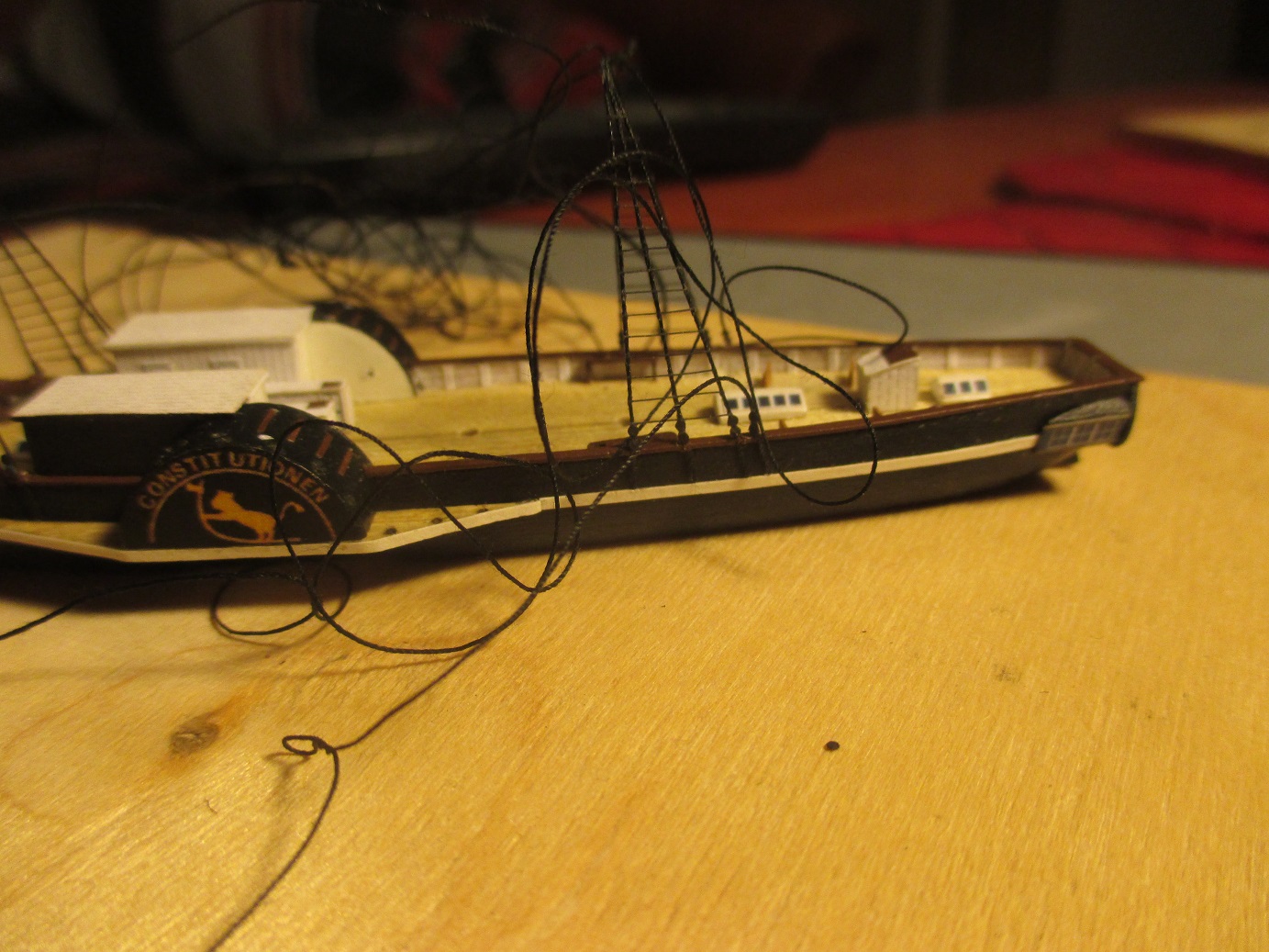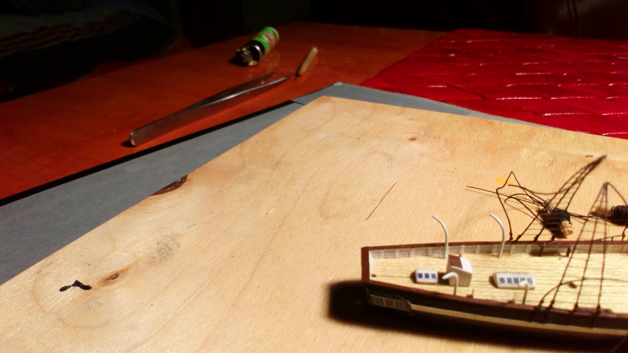 Nie za dużo ale zawsze coś do przodu. Udało mi się zrobić lampy pozycyjne, żurawiki łodzi i zacząłem montaż żagli. Trudno mi było zdobyć odpowiednie nitki do przymocowania żagli.Najpierw kupiłem w pasmanterii, okazały się za grube. Póżniej kupiłem w chińskim markecie odpowiedniej grubości nitkę z jakiegoś tworzywa sztucznego ale okazała się za sztywna. Kumpel polecił mi zakup plecionki w sklepie wędkarskim i to był strzał w dziesiątkę. Szkoda,że nie mają w kolorze brązowym. Potrzebuję brązowych nici do olinowania ruchomego. Będę szukał dalej.