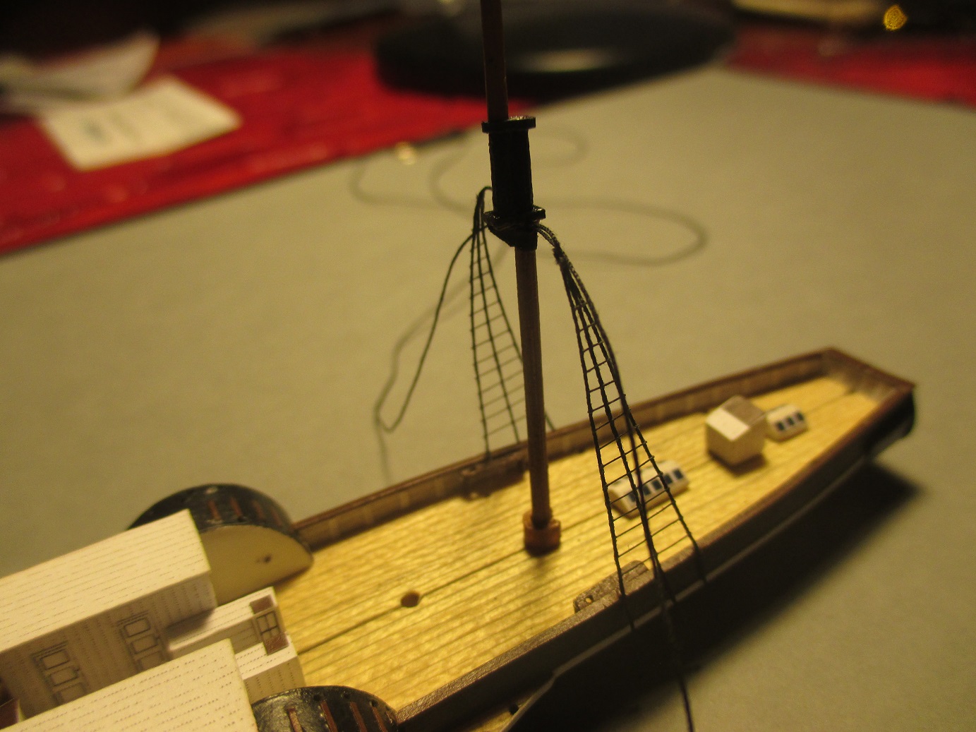 Wanty zamontowane. Maszty będę mocował dopiero po osadzeniu kadłuba w butelce i naciągał wanty przez otwory wywiercone w masztach. Przestudiowałem olinowanie i doszedłem do wniosku, że sporo będzie mi wychodzić nitek z butelki służących do naciągania lin. Mogę mieć w środku niezłą plątaninę. Tego się trochę obawiam.
