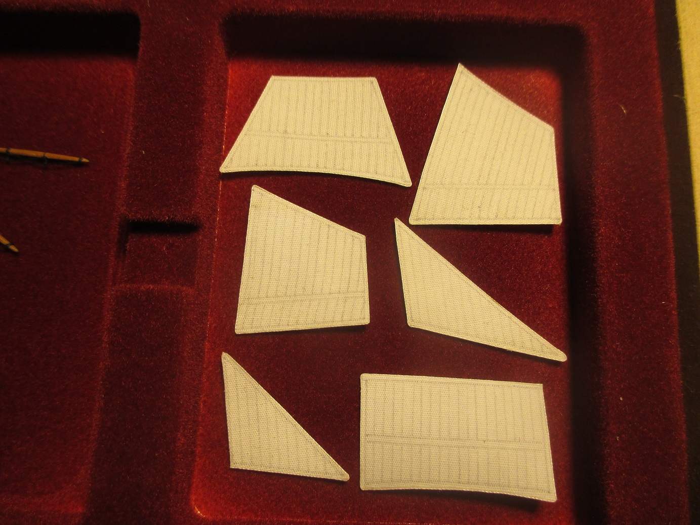 Wykonałem trzy pierwsze żagle.Udało mi się nawet przykleić liklinki. Żagle nasączone rozwodnionym vikolem, a po wyschnięciu zanurzone na chwile w herbacie. Już nie są takie białe.Żagiel rejowy z poprzedniego mojego postu muszę zrobić jeszcze raz. Nie podoba mi się.