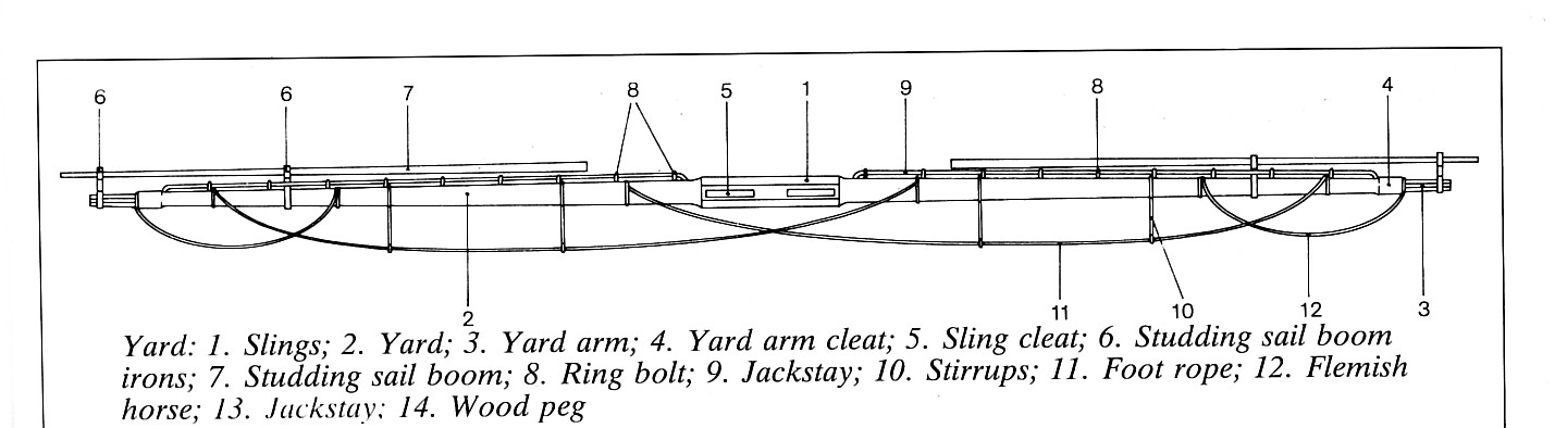 I jeszcze schemat oprzyrzadowania typowej rei. Widac tam wyraznie ow "pret", jako element nr. 9 - jackstay.
