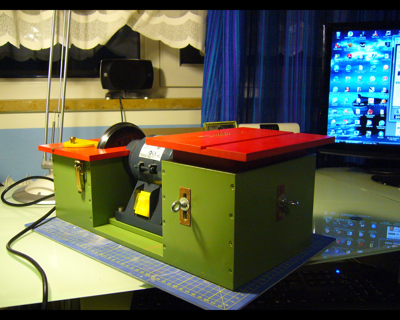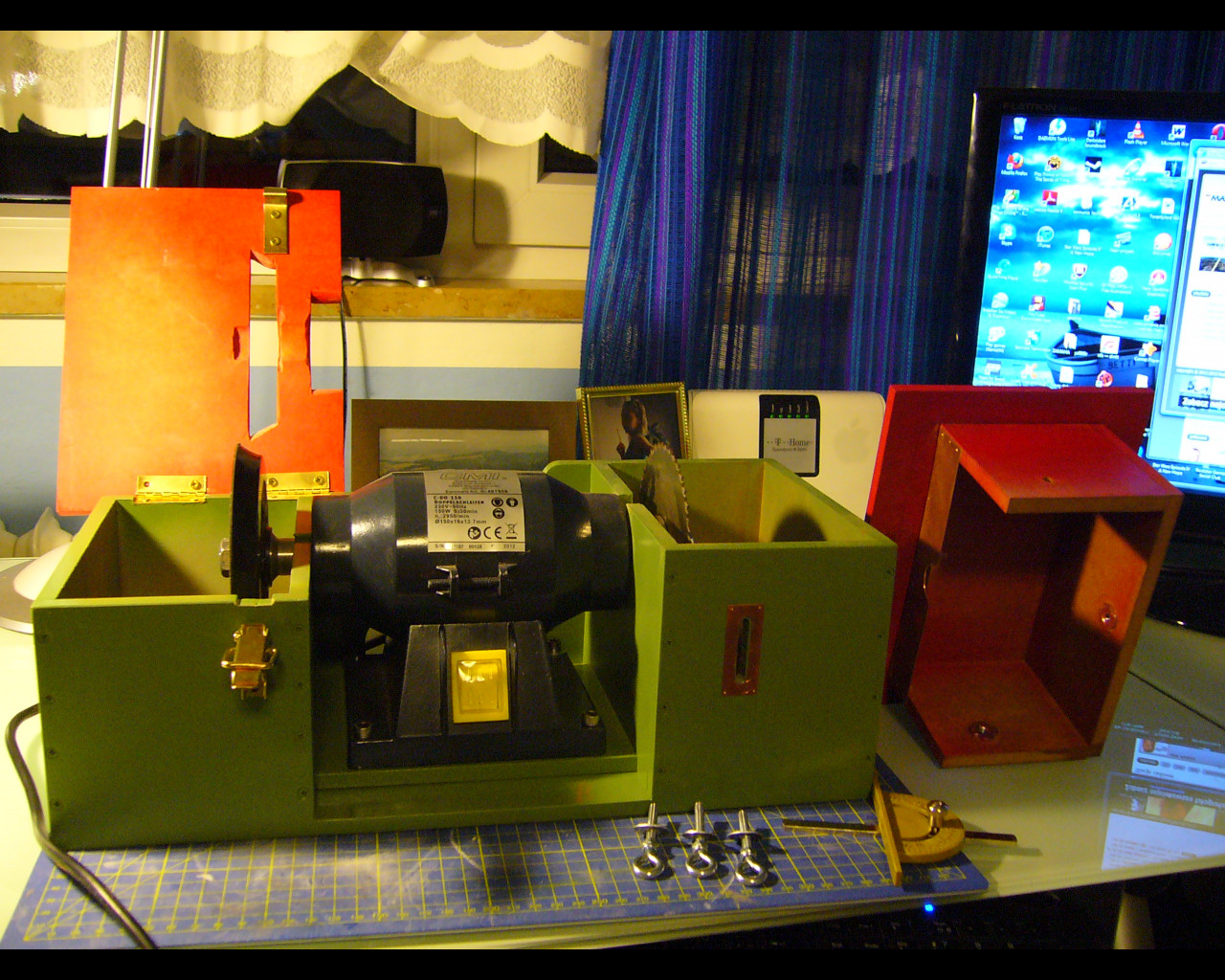 Witam i chcę wam pokazać moją wersje urządzenia według pomysłu RomkaS , Oczywiście żeby nie było wprowadziłem małe zmiany w projekcie które dały mi możliwość ustawiania wysokości blatu dla piły ,a na szlifierce przykręciłem kółko do szlifowania o średnicy 125mm zmiana papieru powinna być bardzo szybka :D . całość wykonana z płyty mdf10mm pomalowana sprajem . Z pewnością gdy zacznę korzystać z urządzenia wyjdą wszystkie niedoskonałości po usunięciu których otrzymam w pełni funkcjonalne narzędzie modelarskie :D A jag by co to muszę zamówić jeszcze frez ale to dopiero na święta , i będzie można pokazać piłę w akcji :)