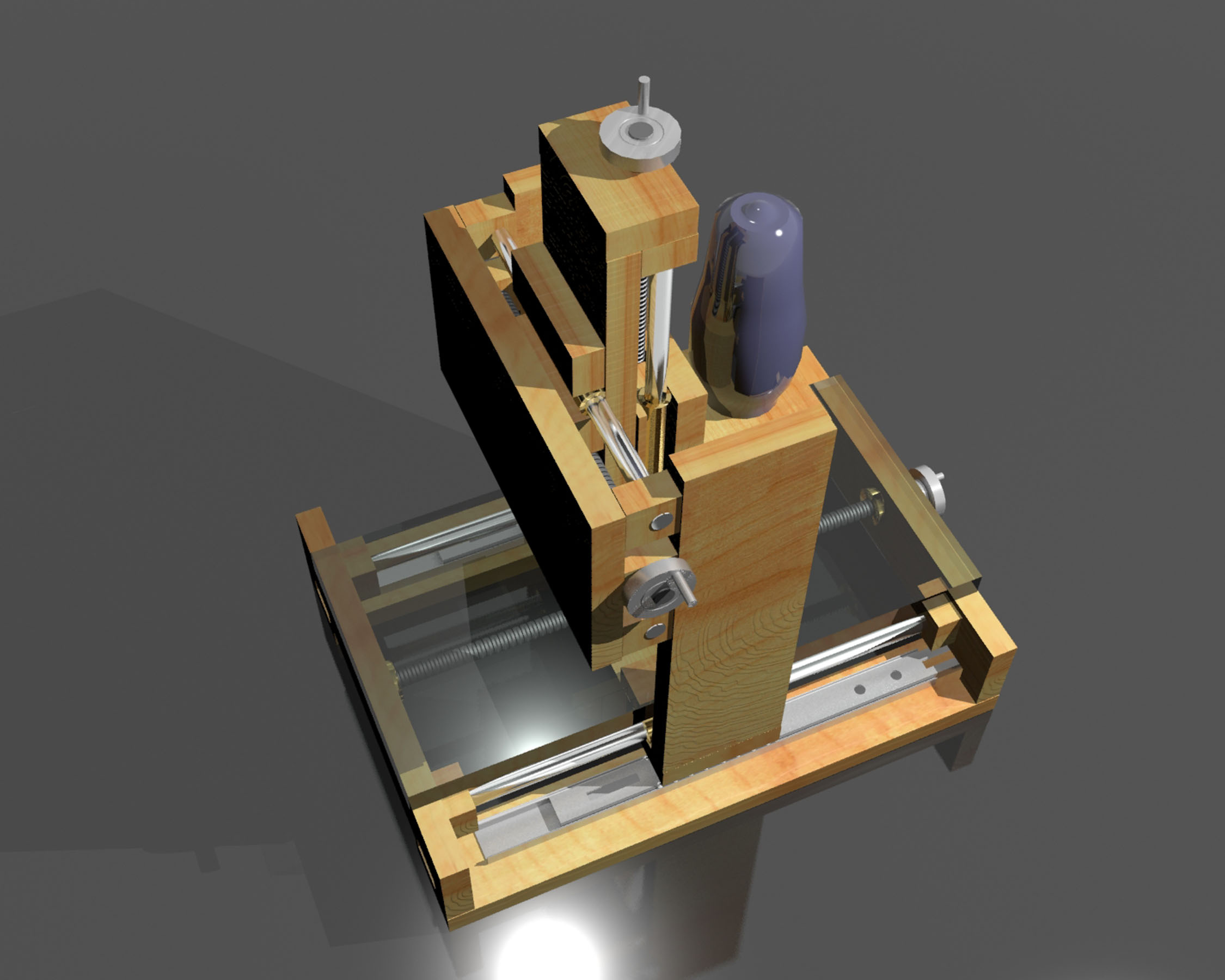Do budowy tej frezarki zdecydowałem się po obejrzeniu strony poświęconej takim maszynom CNC i zrobieniu kilku bloczków do mojego modelu :x . Moja niestety będzie manualna (jeśli projekt się powiedzie). Całość ma działać na prowadnicach Ø10mm po 200mm dla osi z x i 300mm dla y z tulejkami z brązu 70mm, przy czym y zamierzam usztywnić szynami do szuflad, konstrukcja z płyt 15 i 20 mm. Jeżeli uda się to równolegle poskładać prowadnice to powinno działać. Projekt na razie wirtualny w dużym uproszczeniu, powstał w celu wymiarowania poszczególnych desek i teoretycznego rozmieszczenia części.