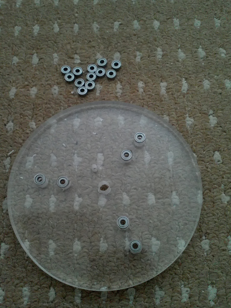 Przyszły łożyska. Straszne maleństwa;)Największym jak do tej pory problemem było uzyskanie współosiowości pomiędzy dwoma talerzami wiertło szło zawsze po skosie ponadto przesunięcie otworu o 0,5 mm powodowało blokowanie kół.