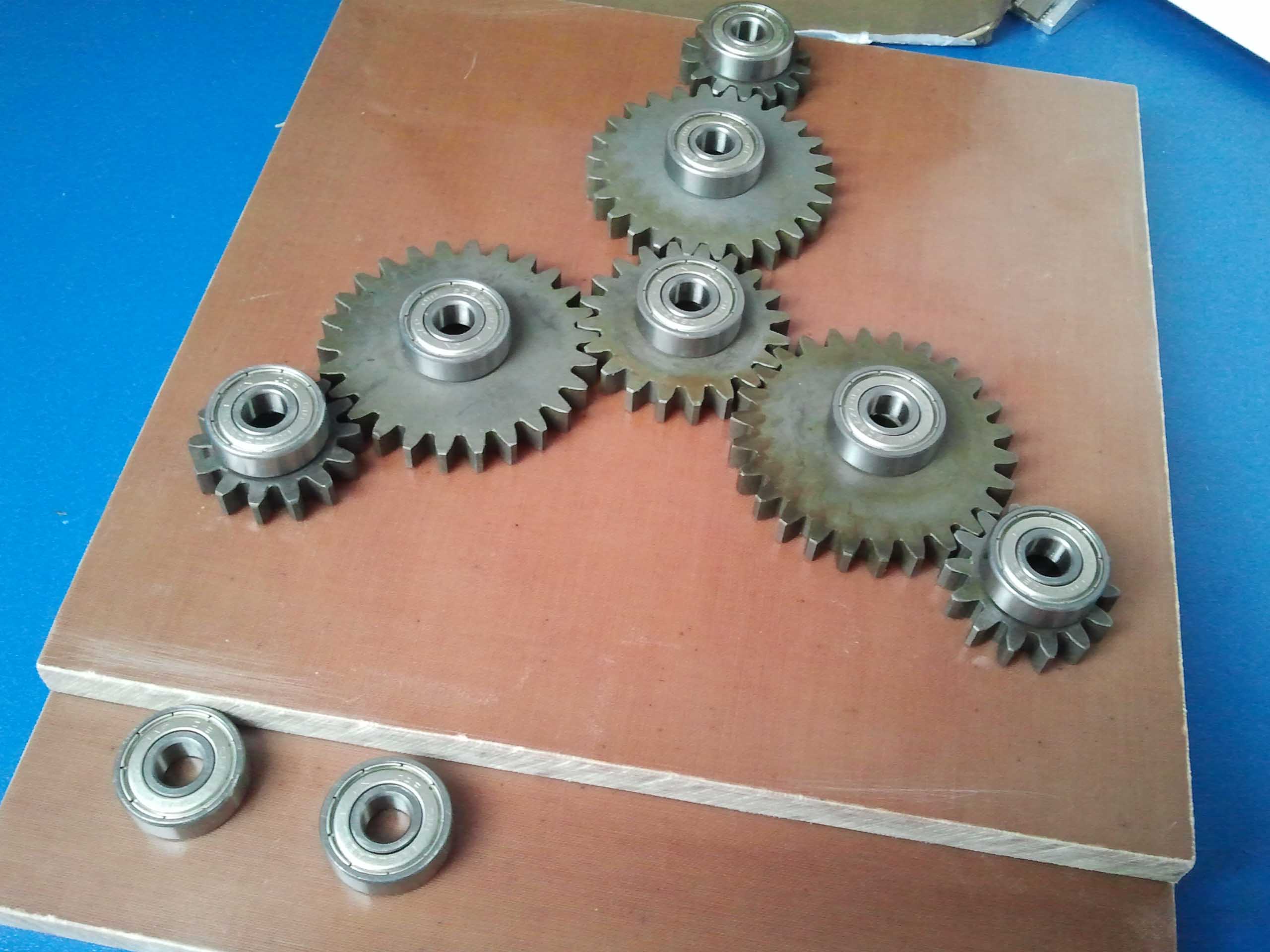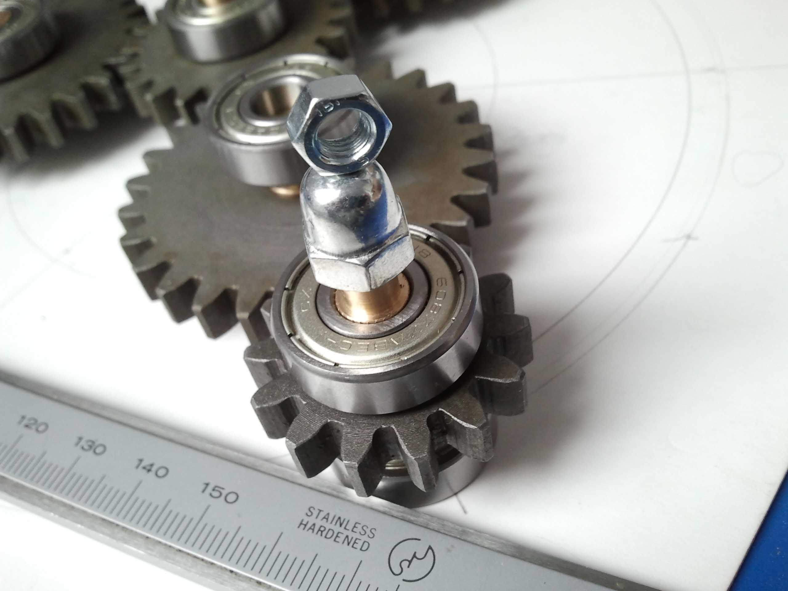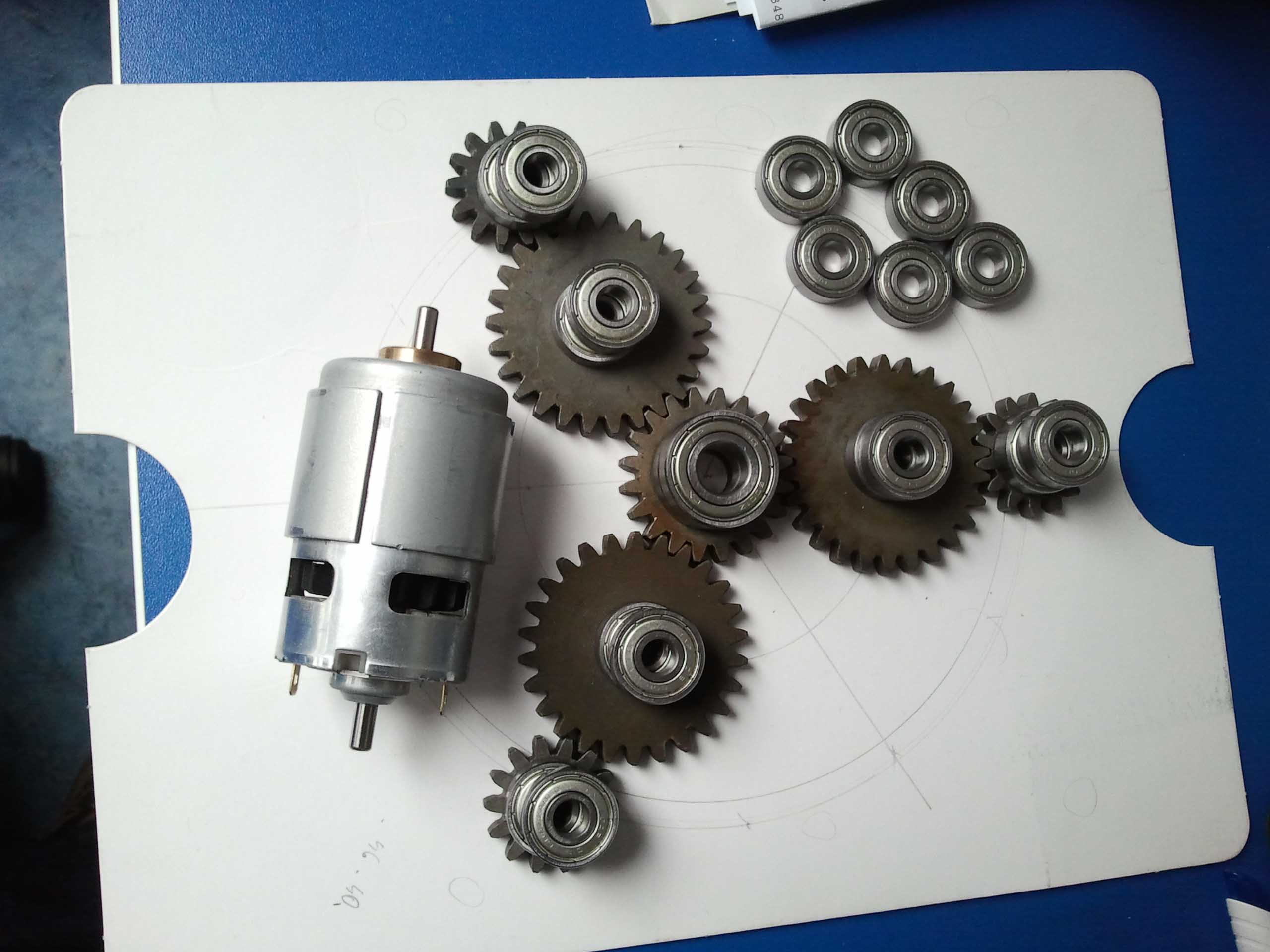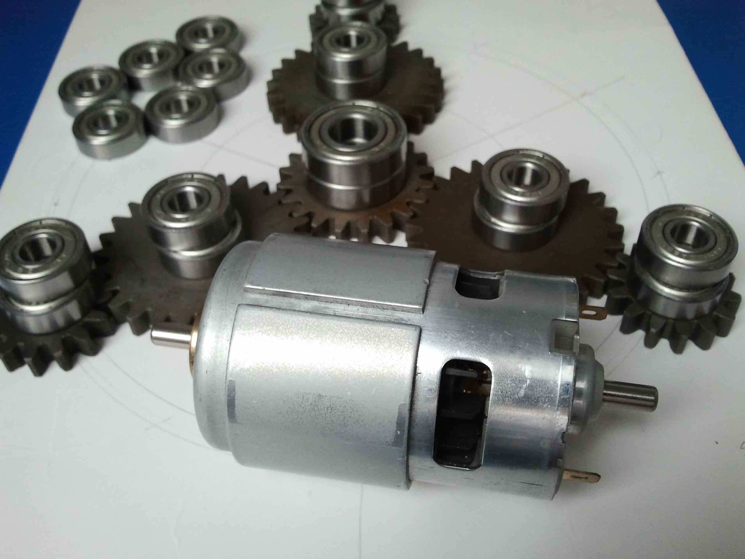Koledzy, wszystkie elementy zostały zakupione na Allegro,silnik dawno temu na Ebay'u.Na pierwszym zdjęciu jest linijka, do tego potrzebny kawałek cyrkla i mamy przybliżone wymiary,które można odczytać na ekranie komputera.Średnicz wewnętrzna kół zębatych-12 mm,grubość -7 mm,łożyska mają grubość 7mm,śr wew 8 mm i śr sew 18mm.Tekstolit też z Allegro.Koła zębate są ze stali 45.Napęd będzie miał regulator obrotów,ale do tego dojdziemy.