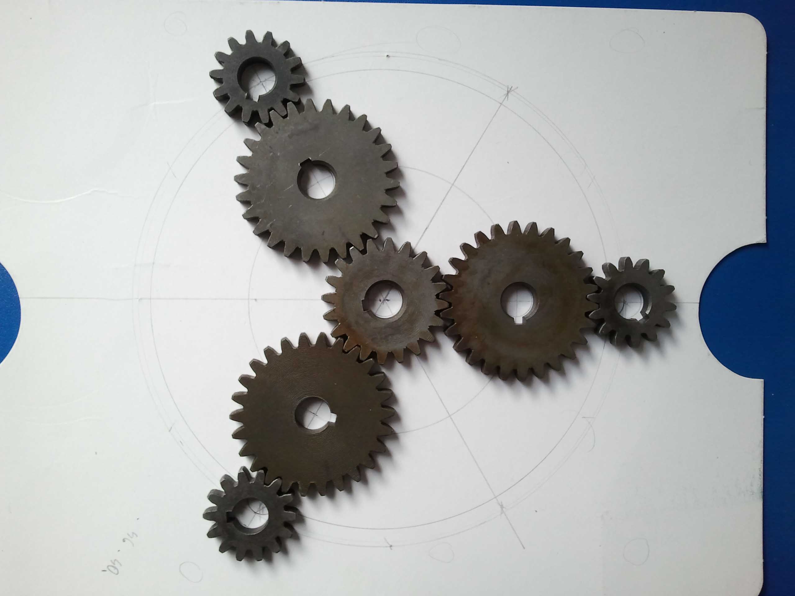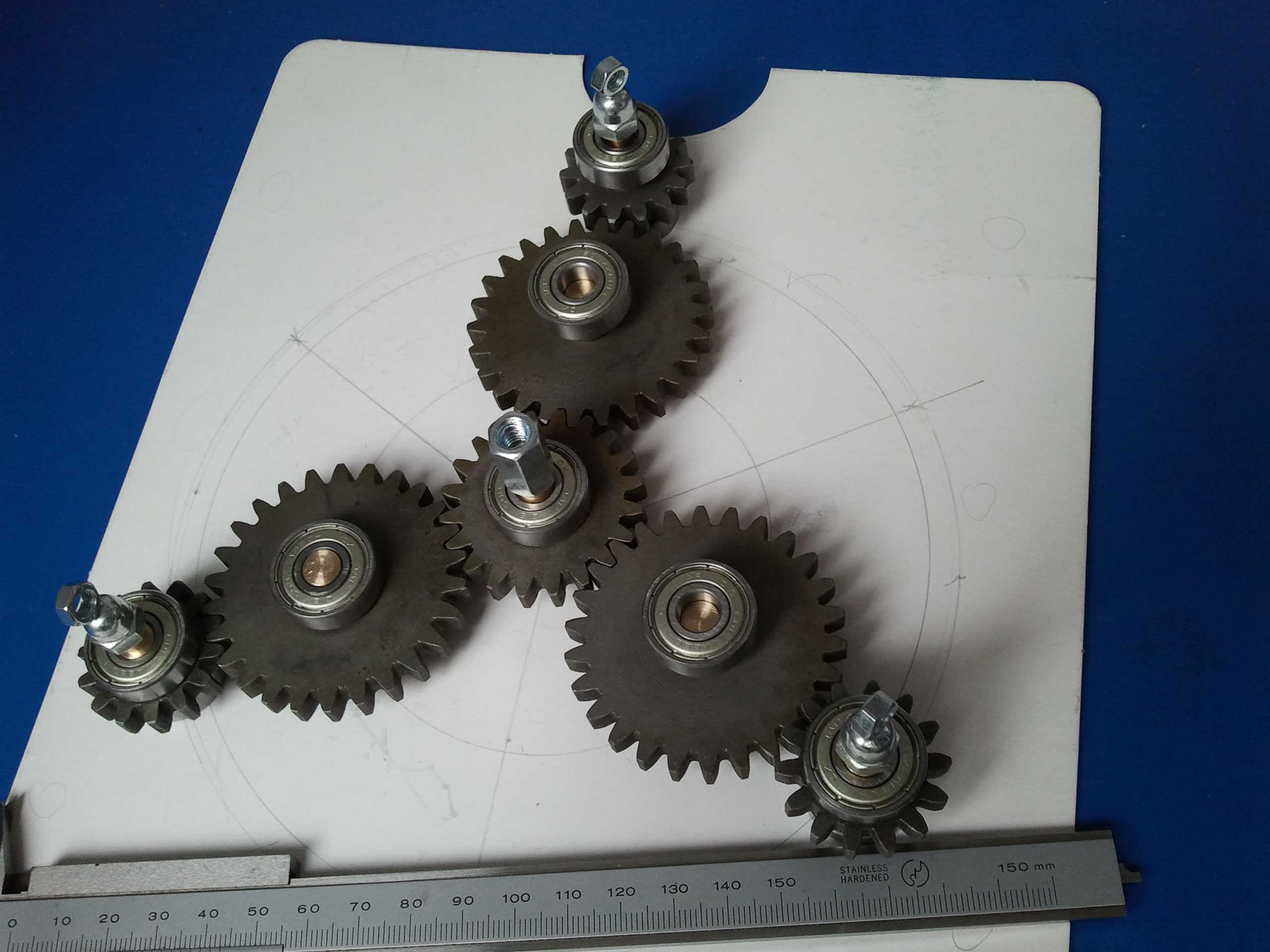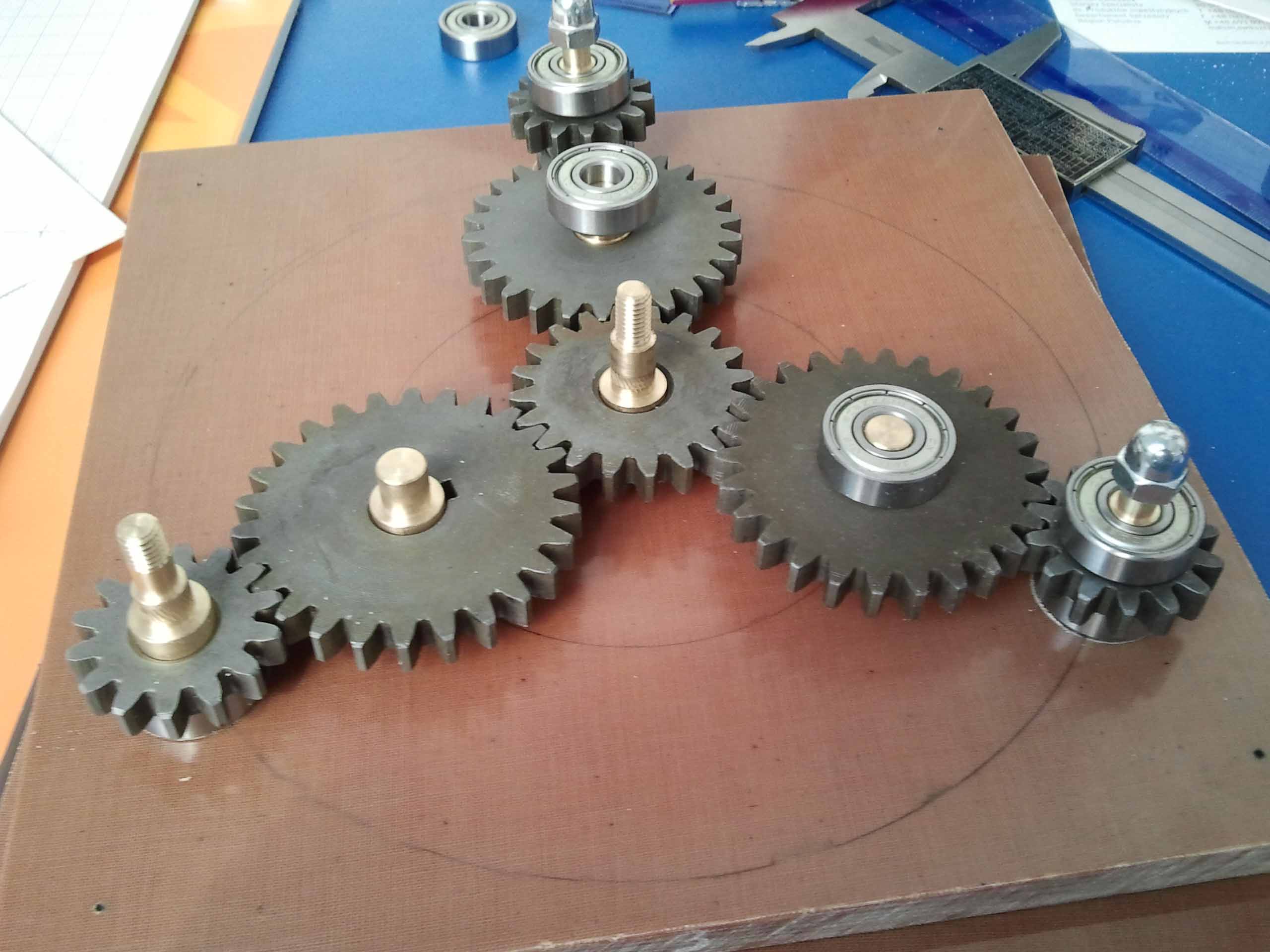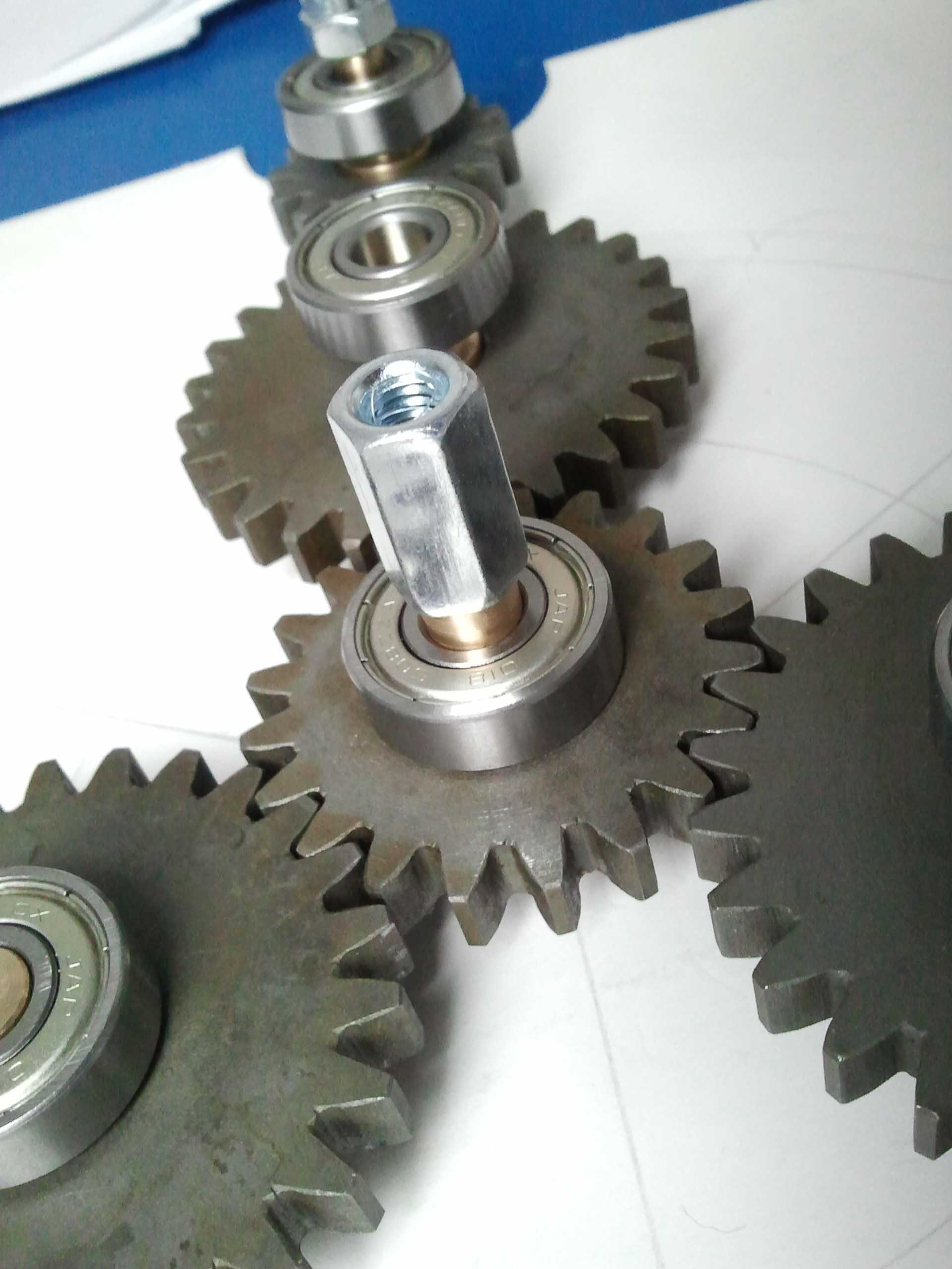 Koledzy, wszystkie elementy zostały zakupione na Allegro,silnik dawno temu na Ebay'u.Na pierwszym zdjęciu jest linijka, do tego potrzebny kawałek cyrkla i mamy przybliżone wymiary,które można odczytać na ekranie komputera.Średnicz wewnętrzna kół zębatych-12 mm,grubość -7 mm,łożyska mają grubość 7mm,śr wew 8 mm i śr sew 18mm.Tekstolit też z Allegro.Koła zębate są ze stali 45.Napęd będzie miał regulator obrotów,ale do tego dojdziemy.