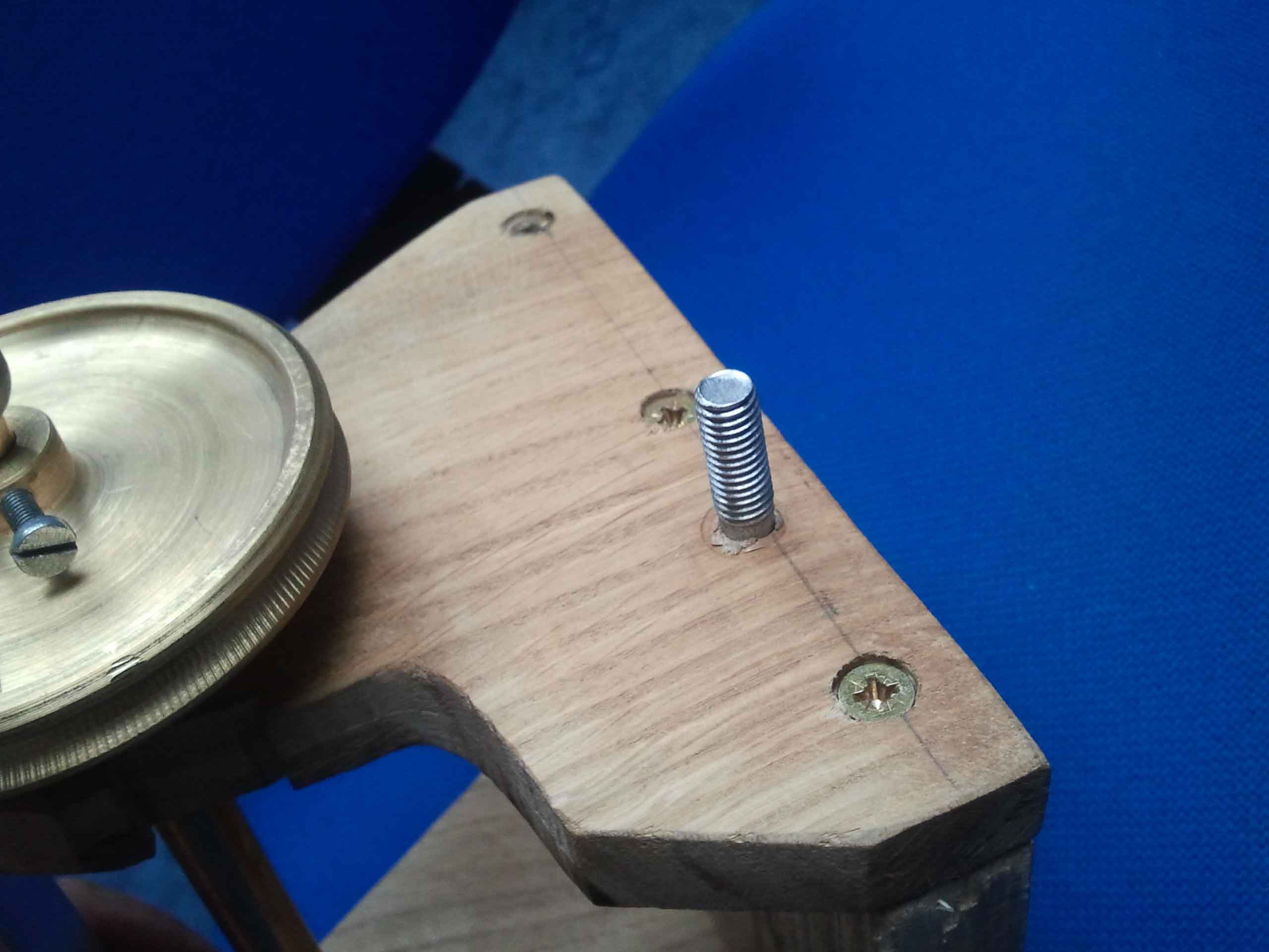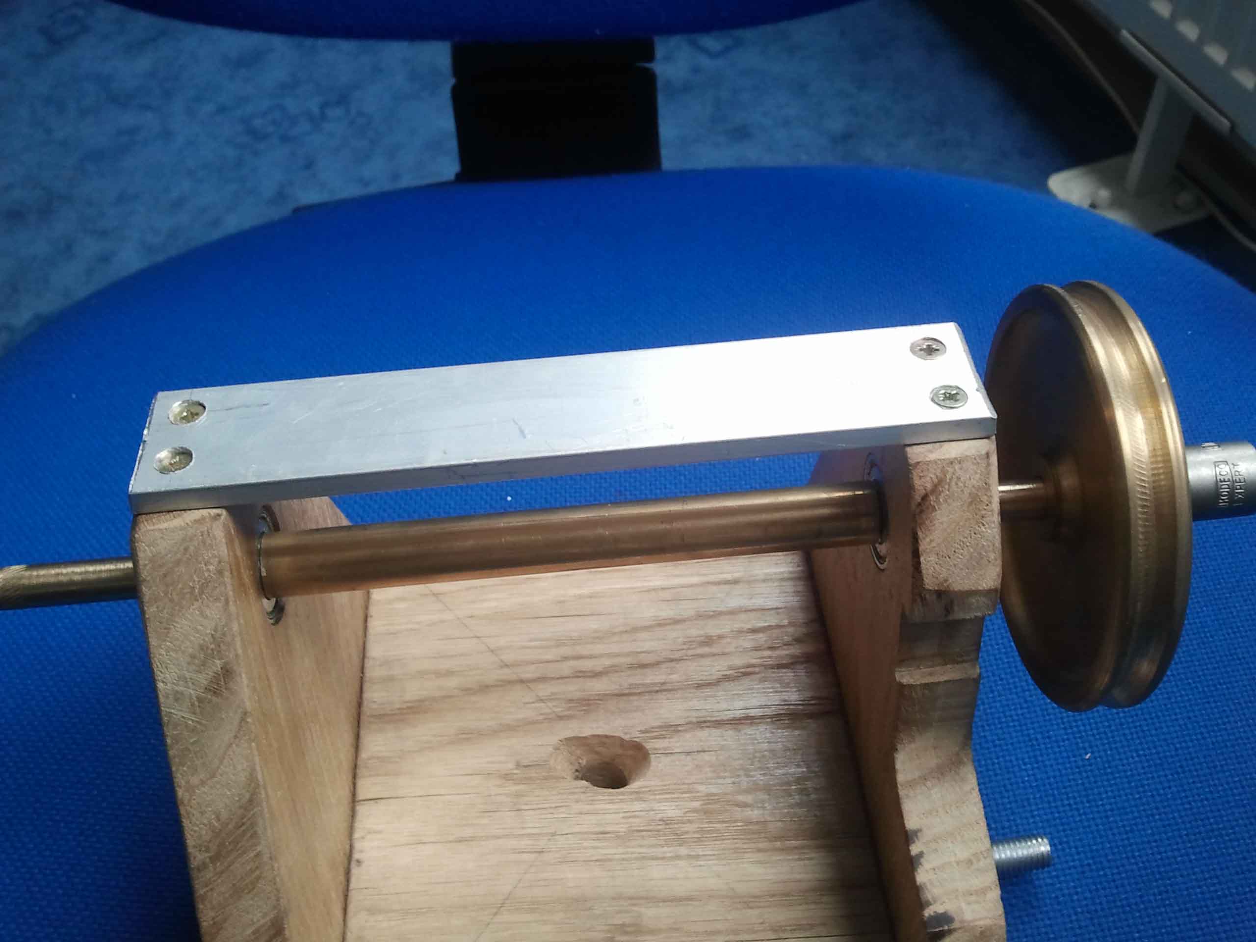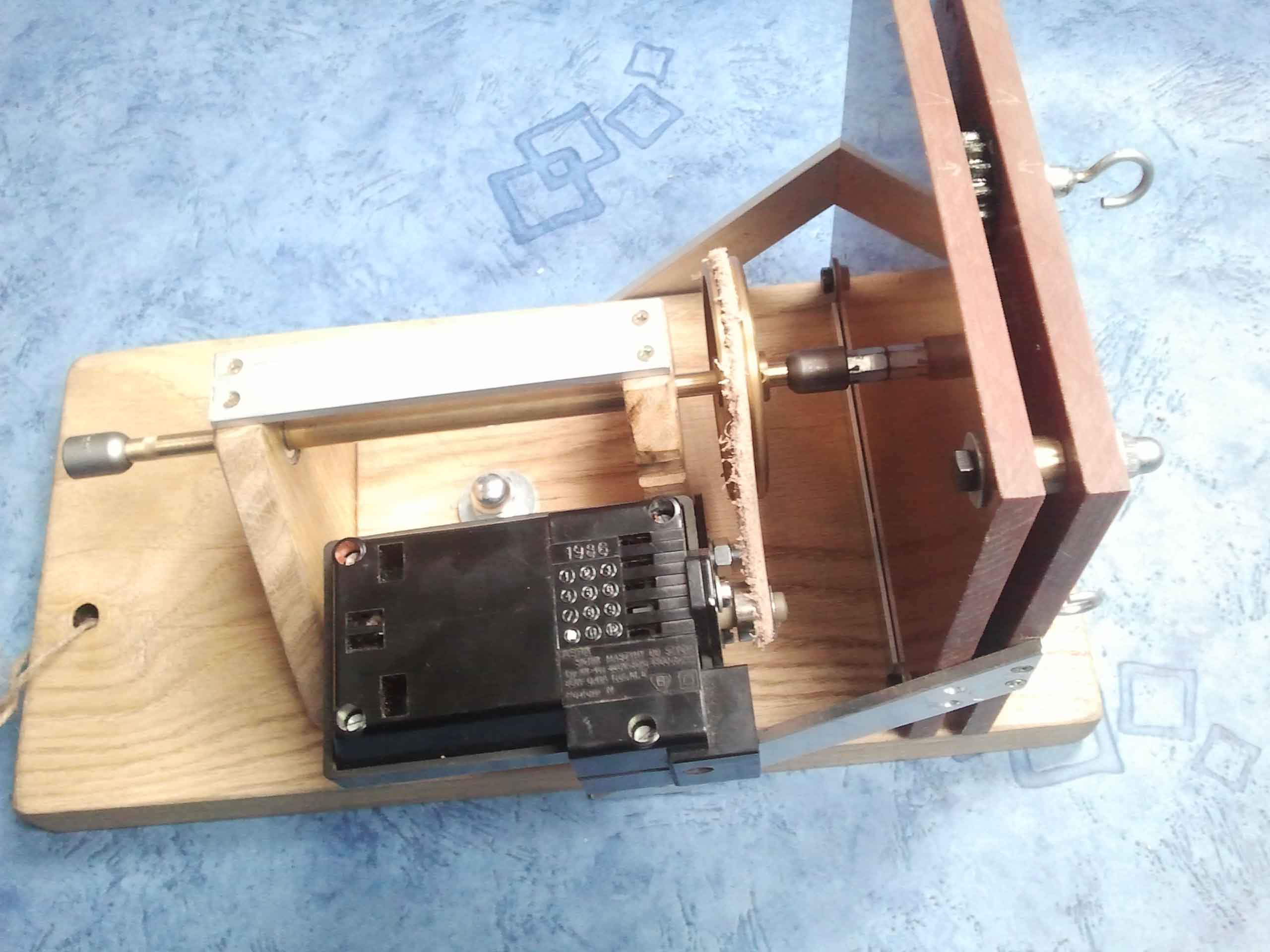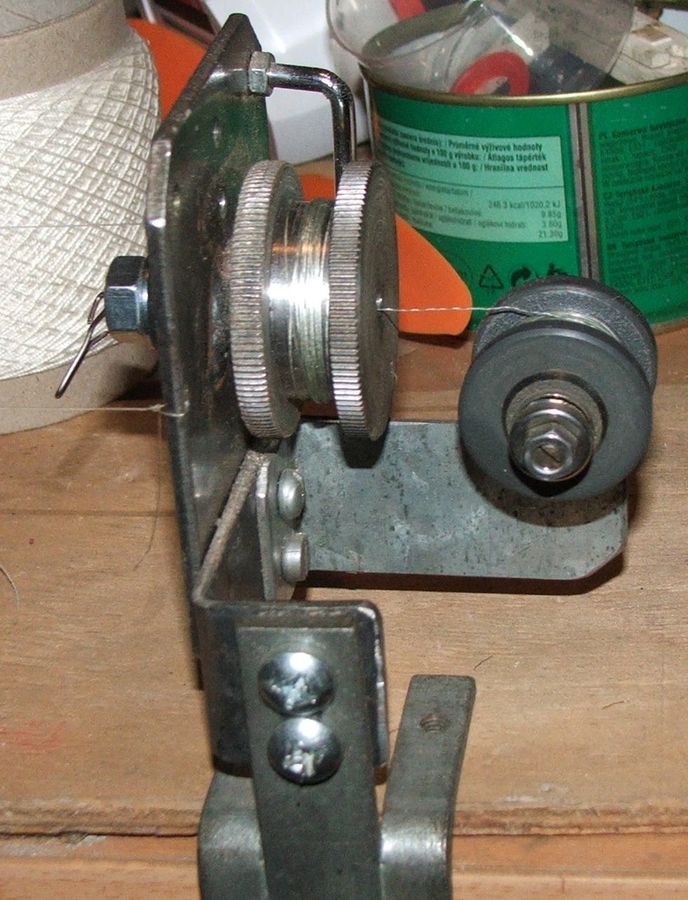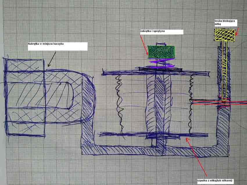 Teraz dalszy ciąg przemyśleń na temat mojego ropa.W miejsce nakrętek z haczykami można zamontować trzy głowiczki z szpulkami na których jest nawinięta odpowiednia ilość nici (jednej lub kilku).Nitka przechodząca przez ramię jest blokowana śrubką .Po drugiej stronie zestawu jest podobna głowica odpowiednio większa do odbierania skręconej linki.