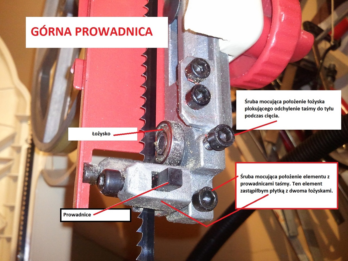 Tak, zapewne tak. Nasze piły mają jednak po jednym łożysku u góry i po jednym u dołu. Ograniczają (ustalają) one odchylenie taśmy podczas cięcia i naporu na nią. Mnie nie podobają się te prowadnice trzymające taśmę po bokach. T w miejsce elementu z prowadzącymi klockami wstawiłbym płytkę z dwoma łożyskami. Dobre będą te 625 2RS. Mają wymiary 5x16x5mm .Będzie to bardzo prosty element do wykonania.