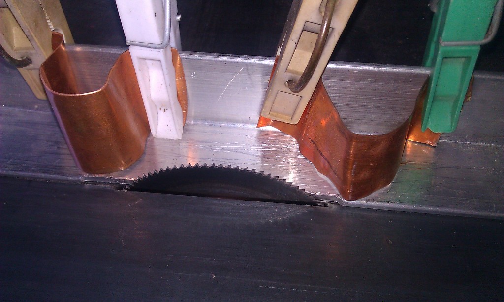 Żeby nie niszczyć aluminium (zamontowaną i dociśniętą plankę) obcinam na mojej mini cyrkularce. Frezik odsunięty tak by nie niszczył dolnego płaskownika będącego podstawą urządzenia).