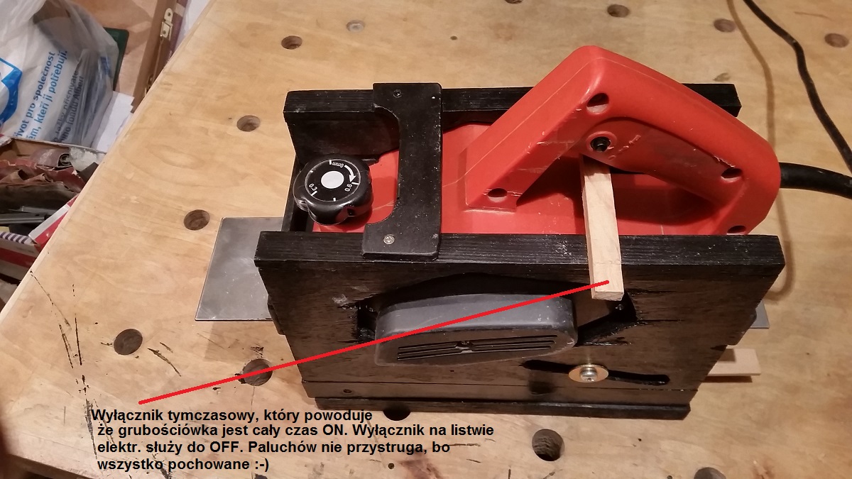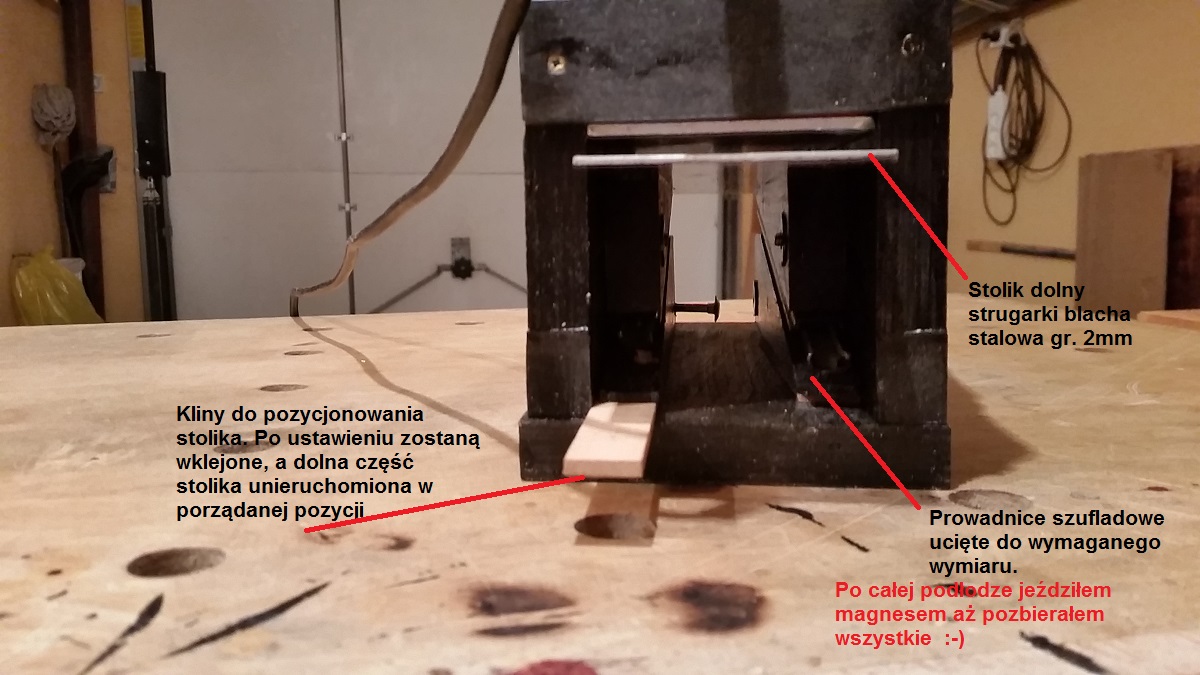Nie zamieszczam rysunków, bo wymiary zależą od wymiarów struga. Moja potraktuje listewki o szer. 65 mm (szerokość ostrzy 70 mm) i grubości od 20 do 2 mm. Nie próbowałem jeszcze, ale myślę, że pogłaskałaby i cieńsze. Posuwu mechanicznego niet.