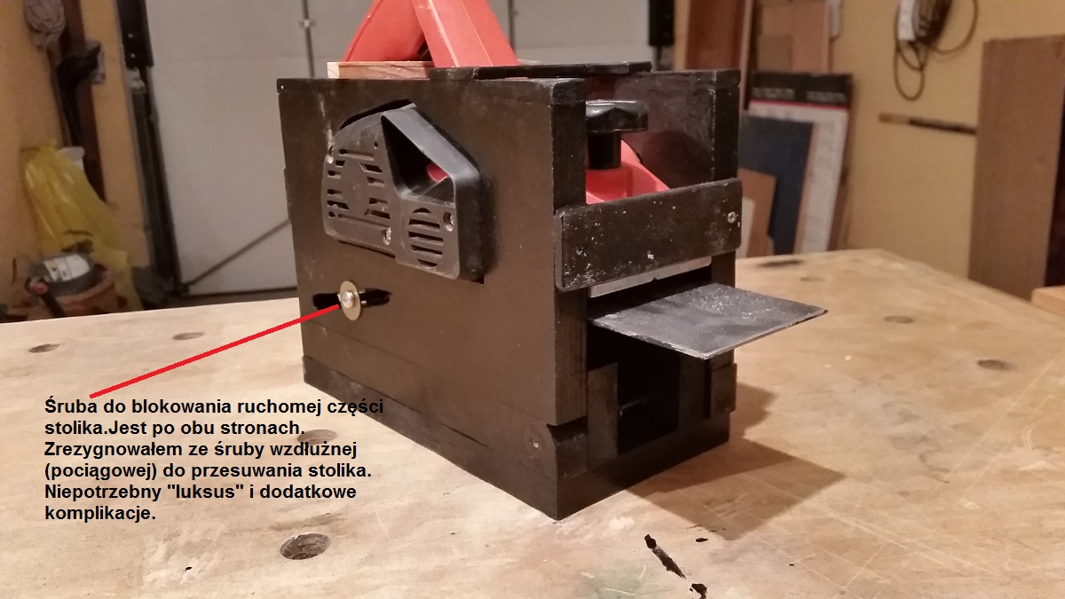Moja jest z grubszej sklejki, bo 18 mm. Nie mieli cieńszych kawałków, a nie chciałem ciąć z całego arkusza. Myślę, że lepiej. Całość jest cięższa, stoi w miejscu i nie trzeba tego mocować ściskami. Jest cichsza jak bez tej obudowy. Stolik ruchomy wystaje po bokach. Jest dłuższy od strugarki i obudowy o 100 mm. Dlaczego - wyjaśnienie na rysunku. Pomalowałem na czarno, bo innej farby na zmarnowanie nie było w "magazynie stoczniowym".