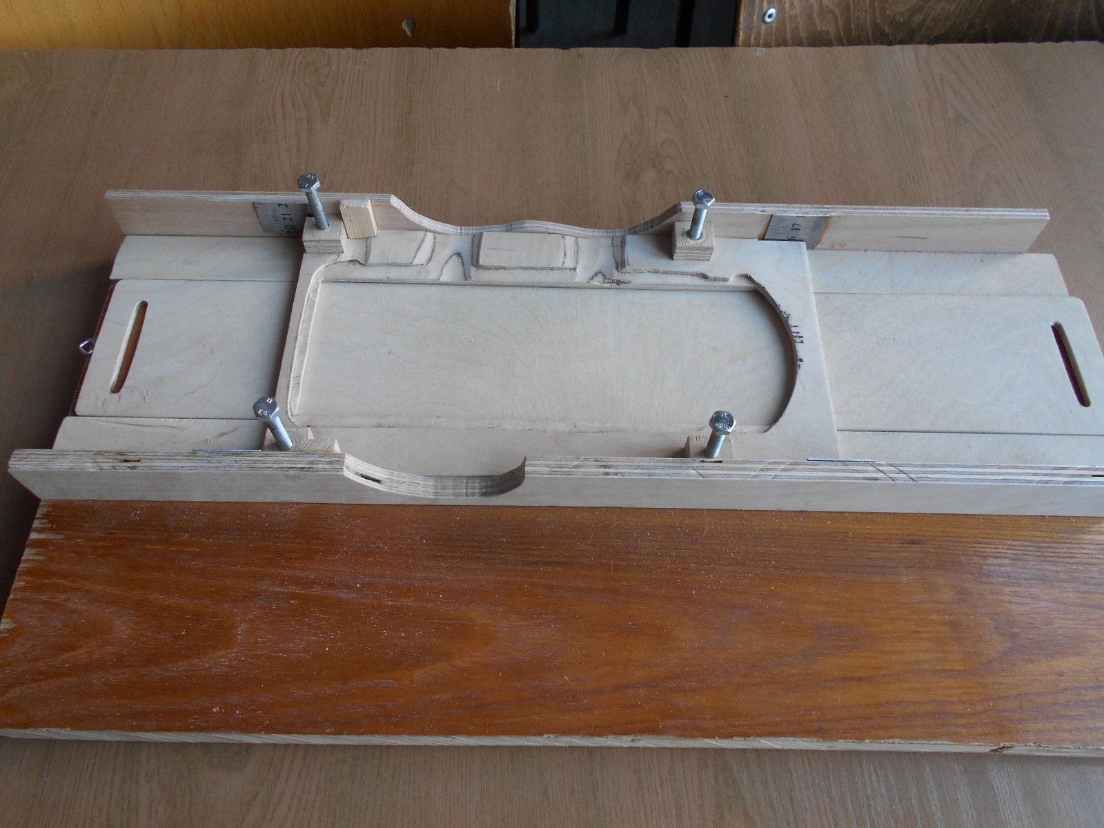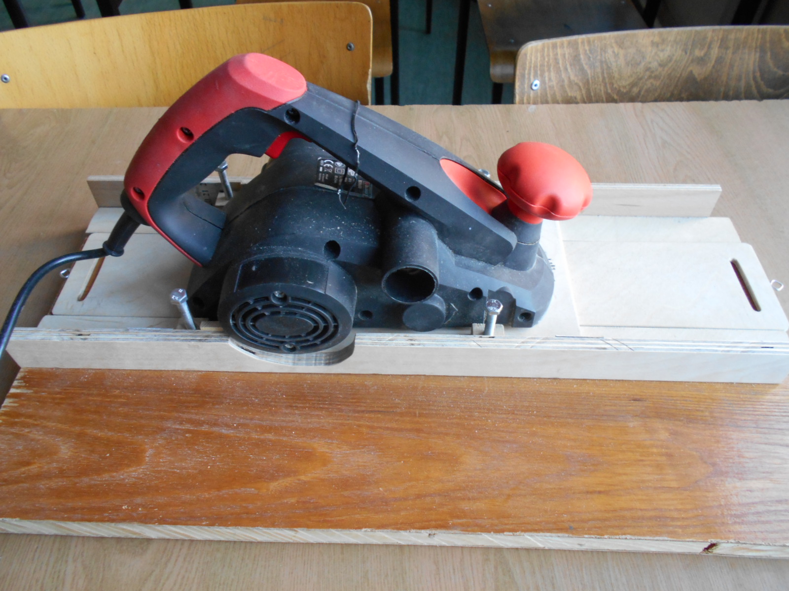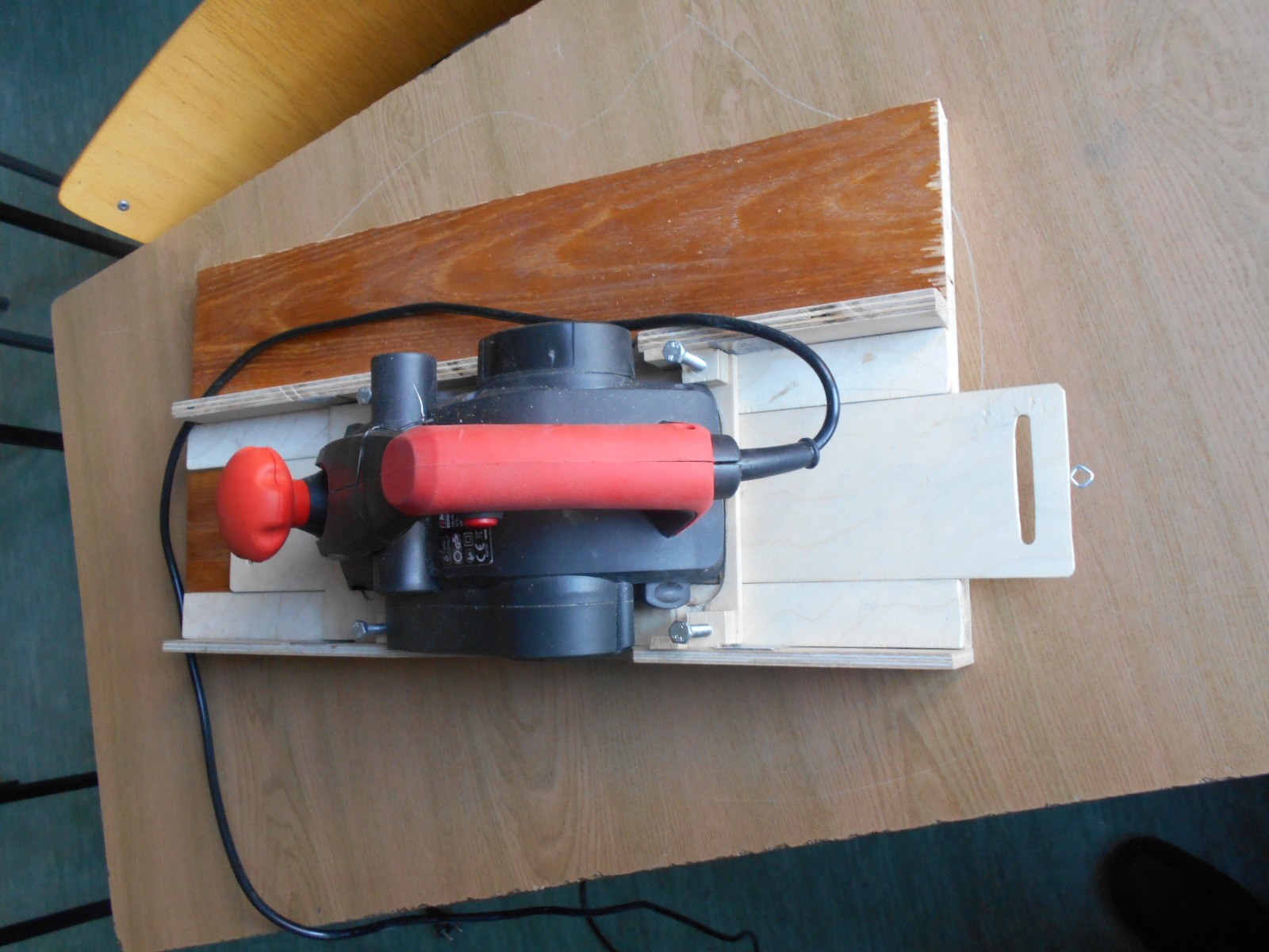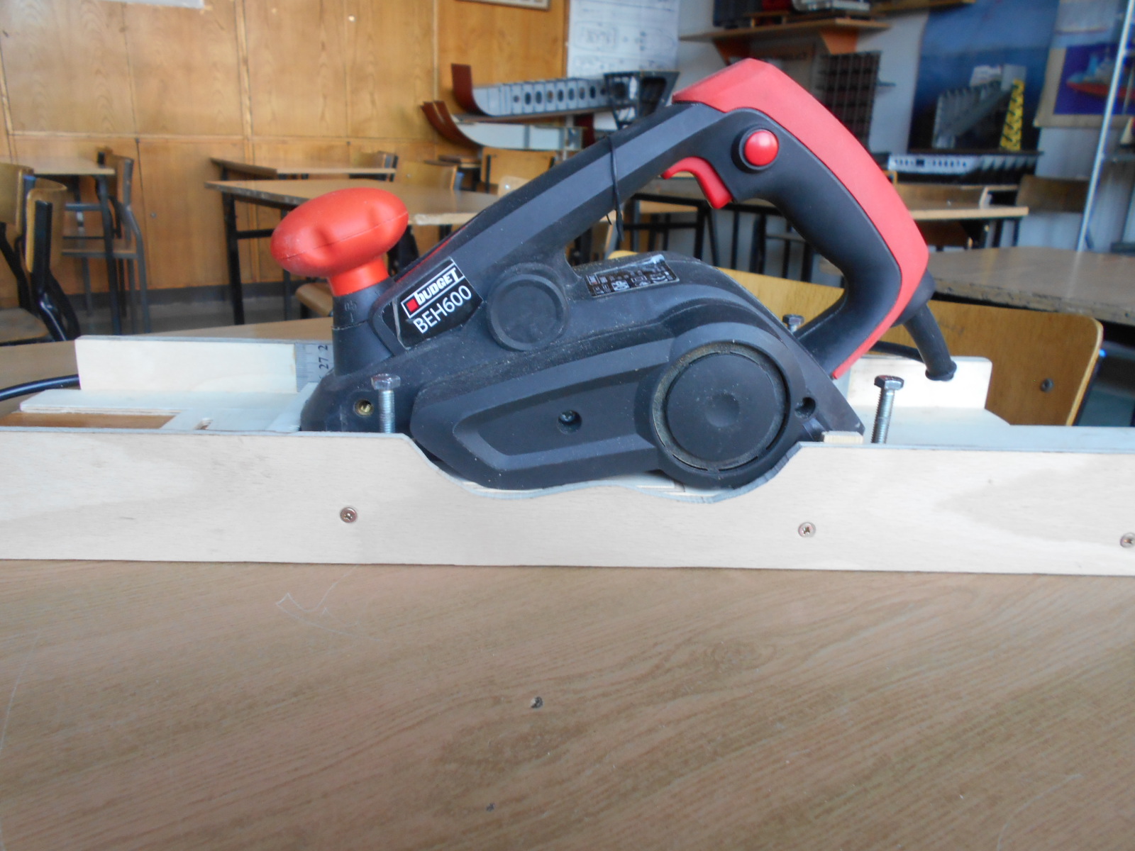 w miarę potrzeb warsztacik rośnie. Do swego modeliku muszę zrobić deseczki na poszycie pokładu . Przyciąłem parę listew z deski brzozowej od Mariana. Trzeba je troszkę oszlifować po wycięciu. Nie dysponuję jeszcze takim urządzeniem jak szlifierka bębnowa , ale mam strug ręczny. Wykombinowałem coś na wzór grubościówki go strugania listewek. Na razie wystrugałem wstępnie listewki o grubości 1,5 mm na tym "urządzeniu". Czyli zdaje egzamin.