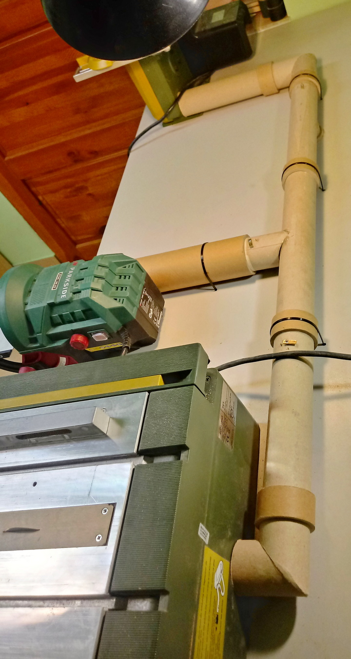 Chciałem podzielić się małym usprawnieniem stołu narzędziowego. Ciągłe zmienianie rury odkurzacza bardzo mnie irytowało, więc zastosowałem pomysł znany z warsztatów stolarskich. Jest to prosty "system" rur odsysających. Całość wykonana z dwóch średnic grubościennych rur tekturowych.