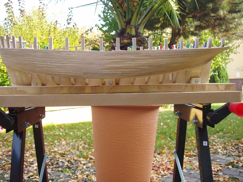 1. Dzięki wielopunktowemu mocowaniu listewki istnieje możliwość jej ugięcia i wycięcia po łuku bo kadłub nie jest częścią prostego stożka a bardziej podobny do bochenka chleba jak zauważył TomekA. Takiej możliwości nie daje struganie hebelkiem.